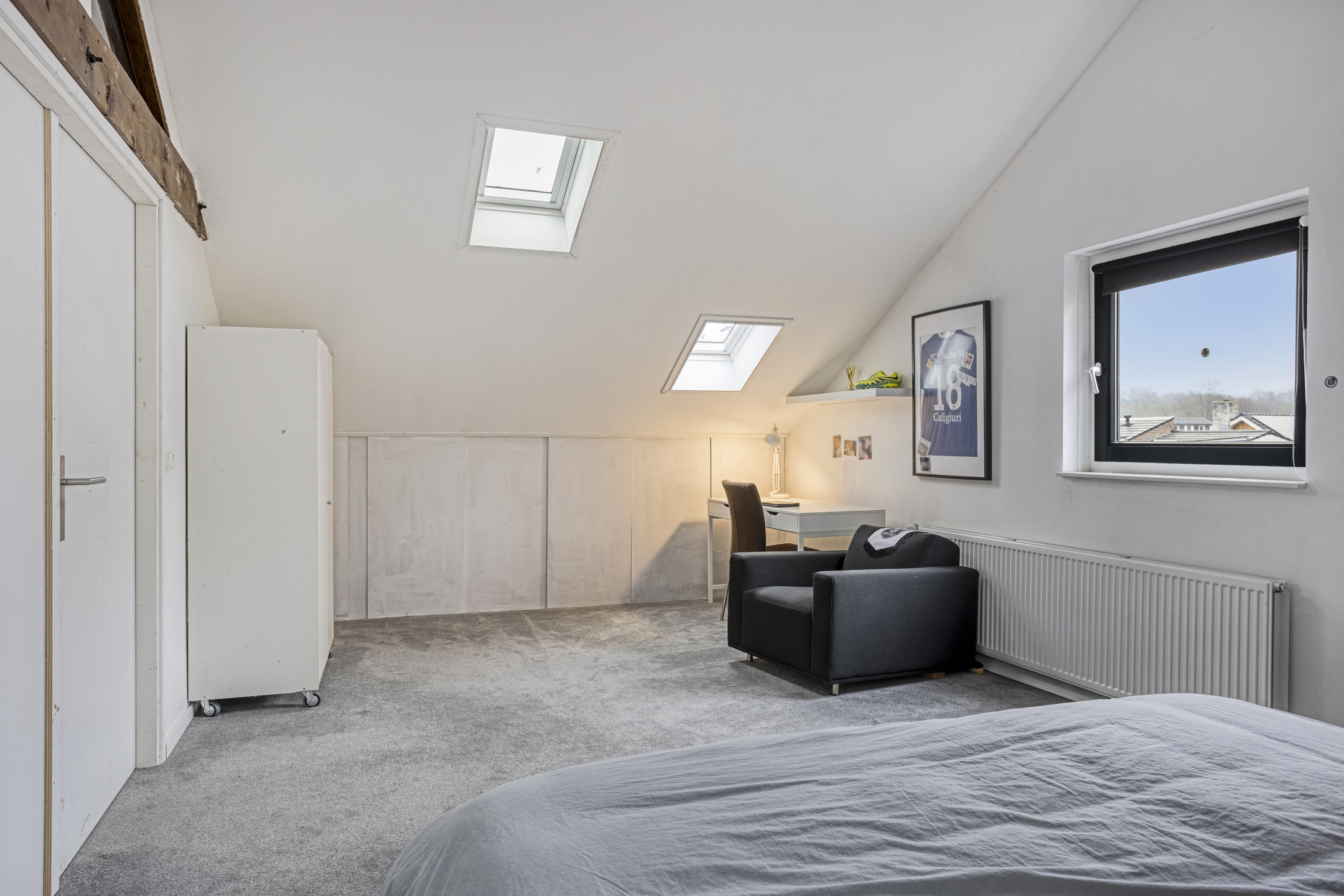 Eerste verdieping: bordes met toegang tot de vide die nu wordt gebruikt als atelier, de berging en de twee hele ruime kamers (30 m²). De berging is voorzien van een wastafel en daar zit tevens de CV-ketel. De ene kamer wordt nu gebruikt als slaapkamer en de ander als extra living. Dit kan uiteraard ook prima gebruikt worden als slaapkamer.