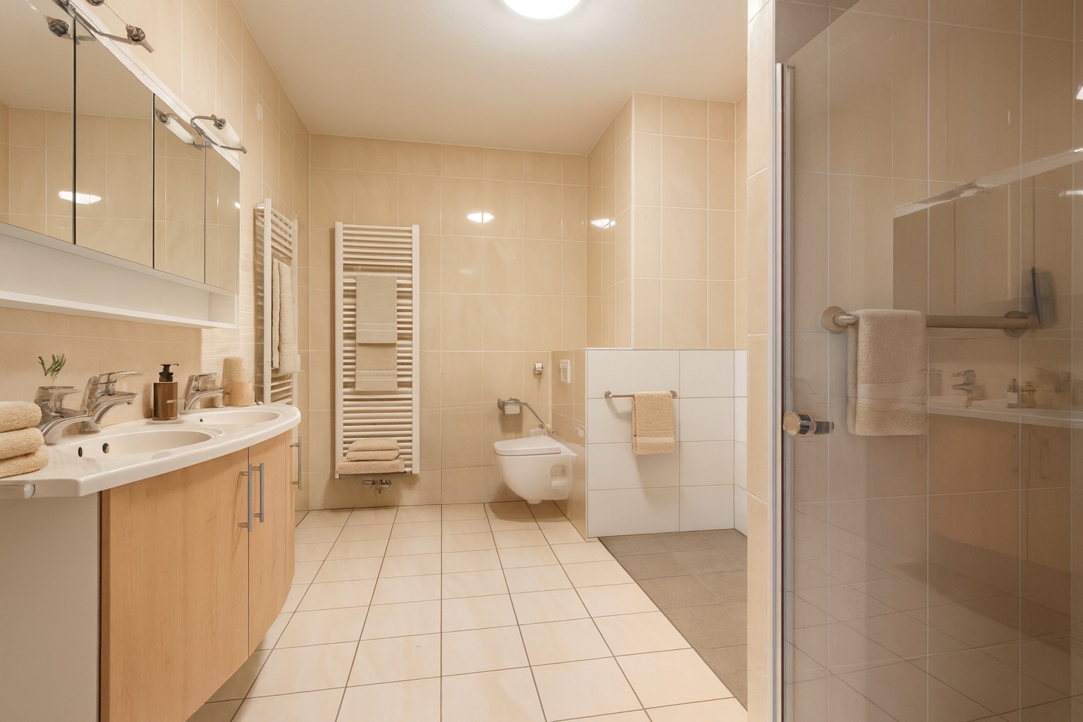 The master bedroom includes bespoke fitted wardrobes, double doors to the balcony and a luxurious en-suite bathroom. This spacious suite offers a walk-in shower and a second shower with a non-slip floor—ideal for residents with reduced mobility. A double washbasin unit and wall-hung toilet complete the design.