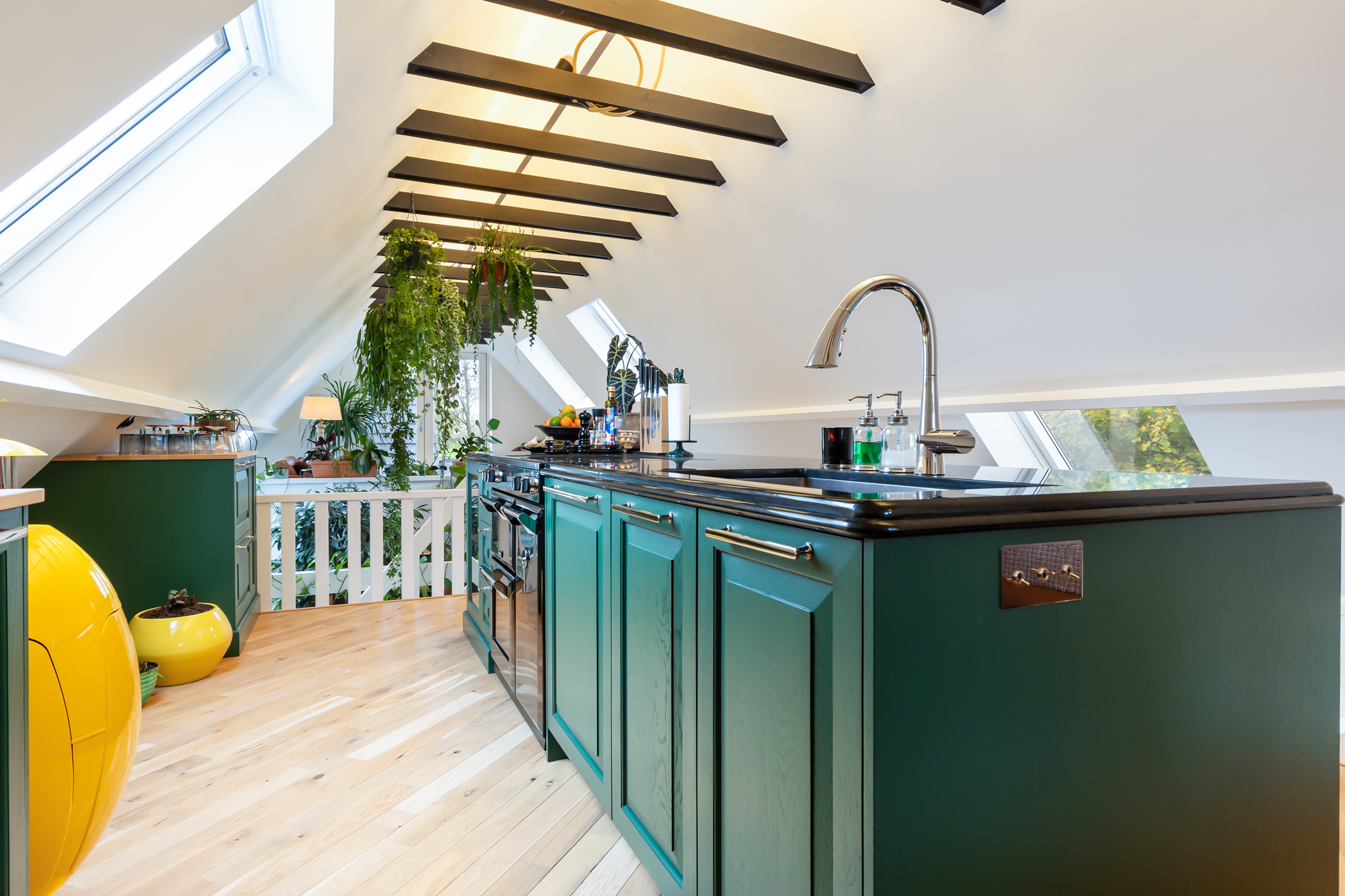 On the mezzanine level is an atmospheric kitchen-diner featuring oak cabinetry in a woodland green tone, granite worksurfaces and Miele appliances. At the front is a bright dining area, while the rear offers a cosy TV room with French doors opening onto the spacious roof terrace. Here, you can enjoy panoramic views across the garden and fields – an ideal spot to unwind or dine in the evening sun.