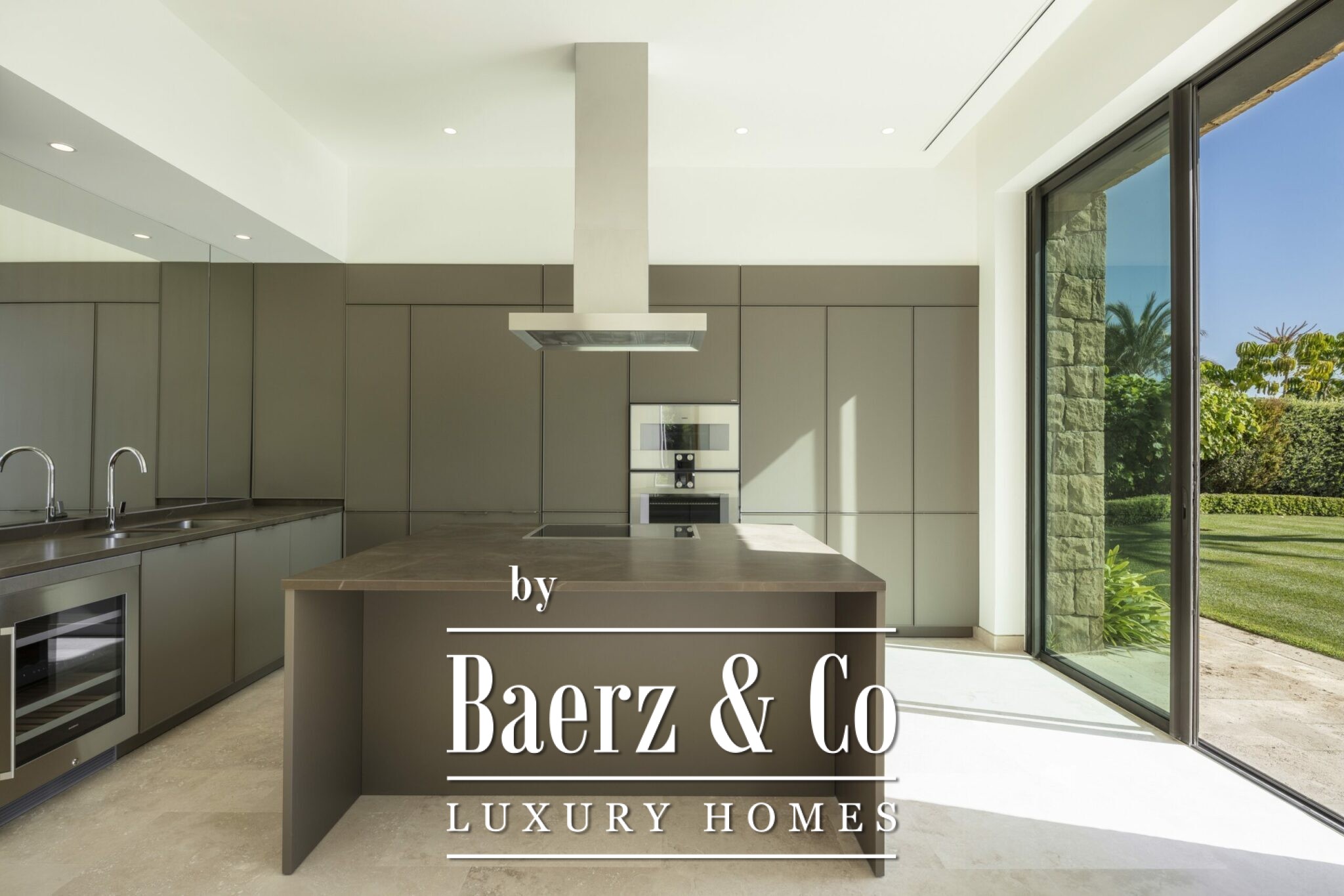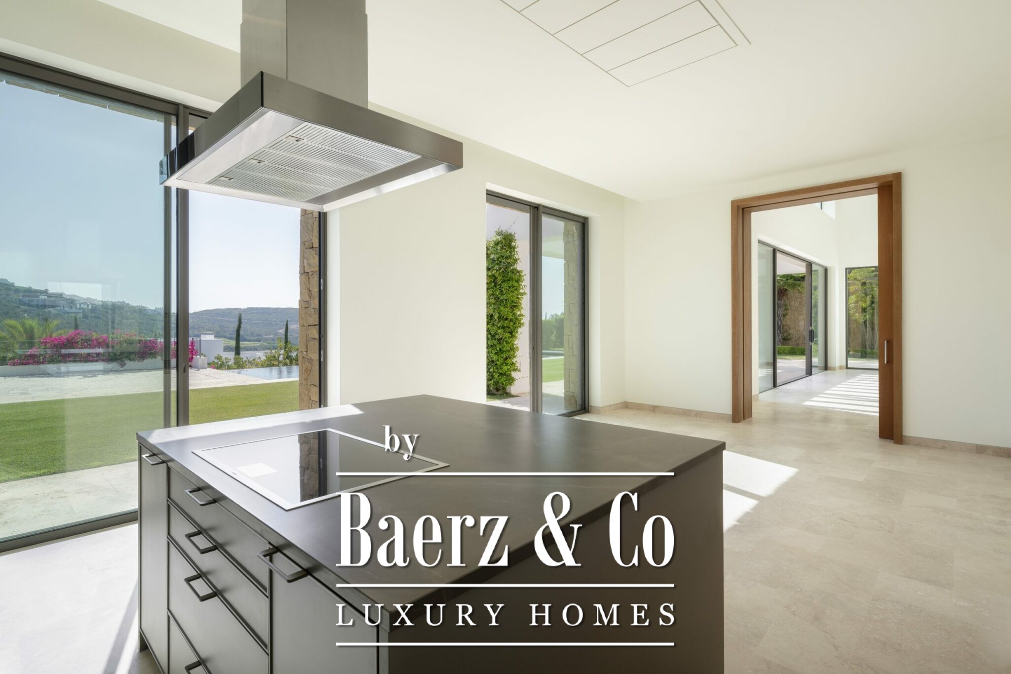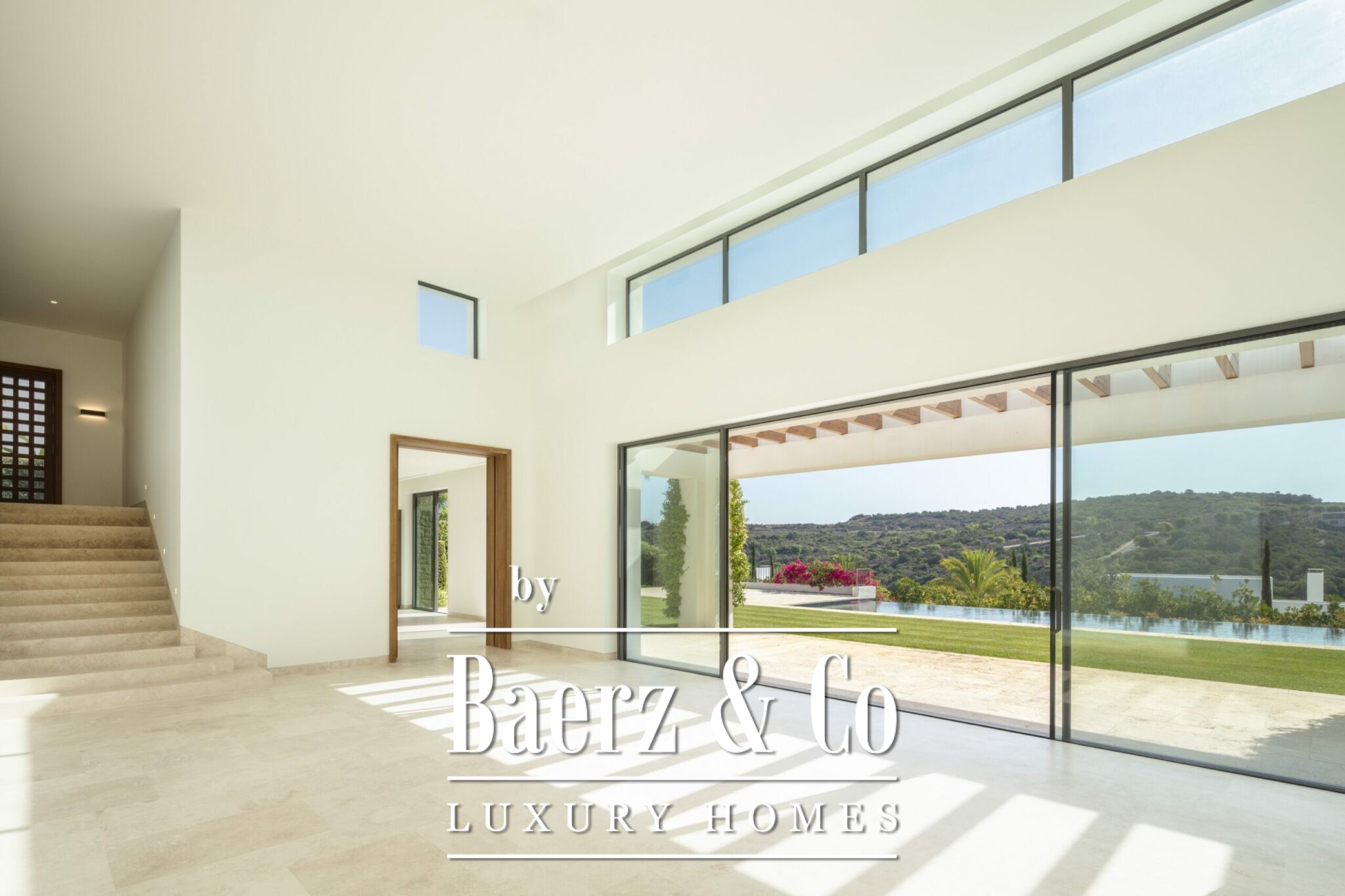 fully equipped with top-of-the-line Gaggenau appliances. Two guest rooms, with direct access to the garden, are thoughtfully located on the ground floor. The upper level of the villa is dedicated to the remaining bedrooms, each boasting its own private bathroom. The walkway connecting the rooms offers a picturesque view of the living area, creating an interior balcony-like experience. The property boasts sweeping vistas of the golf course and surrounding mountain range, providing an idyllic backdrop that radiates tranquillity and serenity. The property also has a private driveway for parking convenience within the plot. With its coveted location within the resort, this villa is an ideal haven for families or those seeking to embrace the luxurious Mediterranean lifestyle in all its splendour.