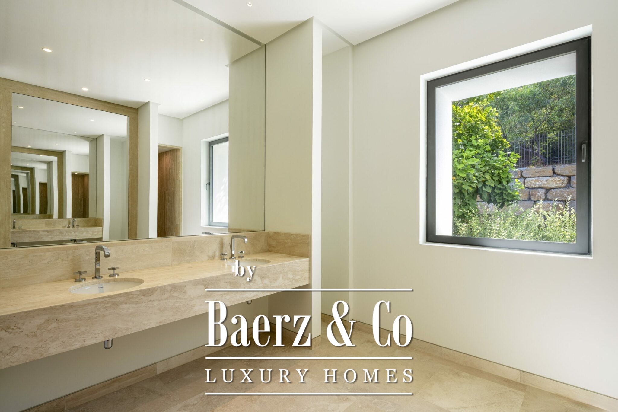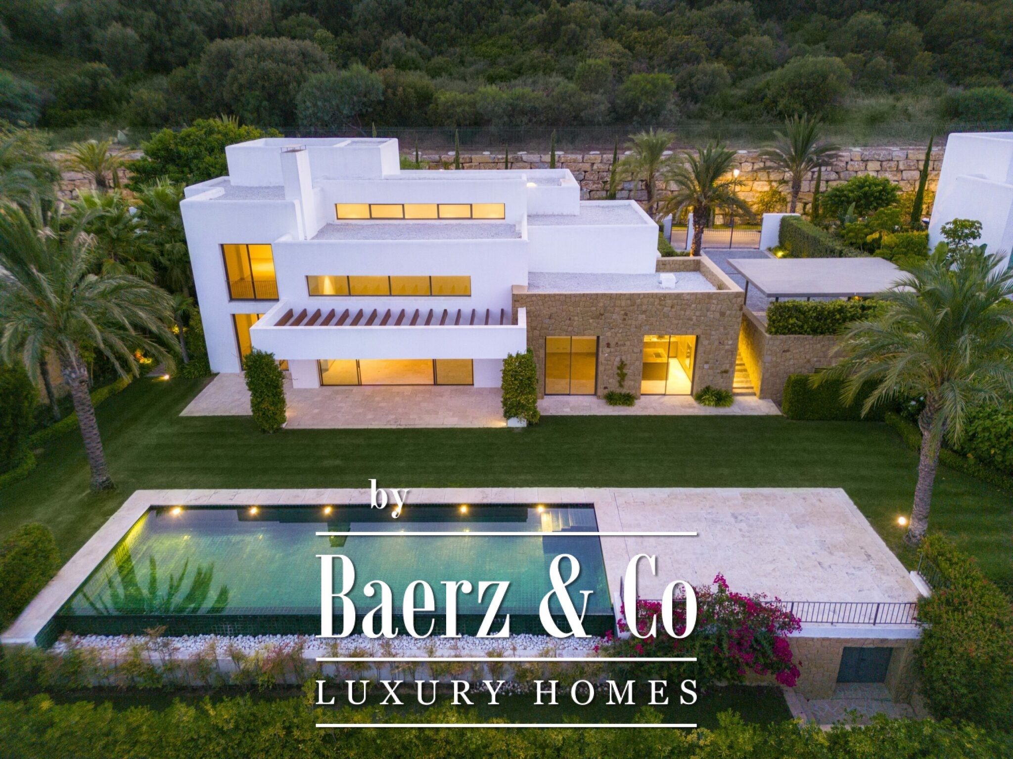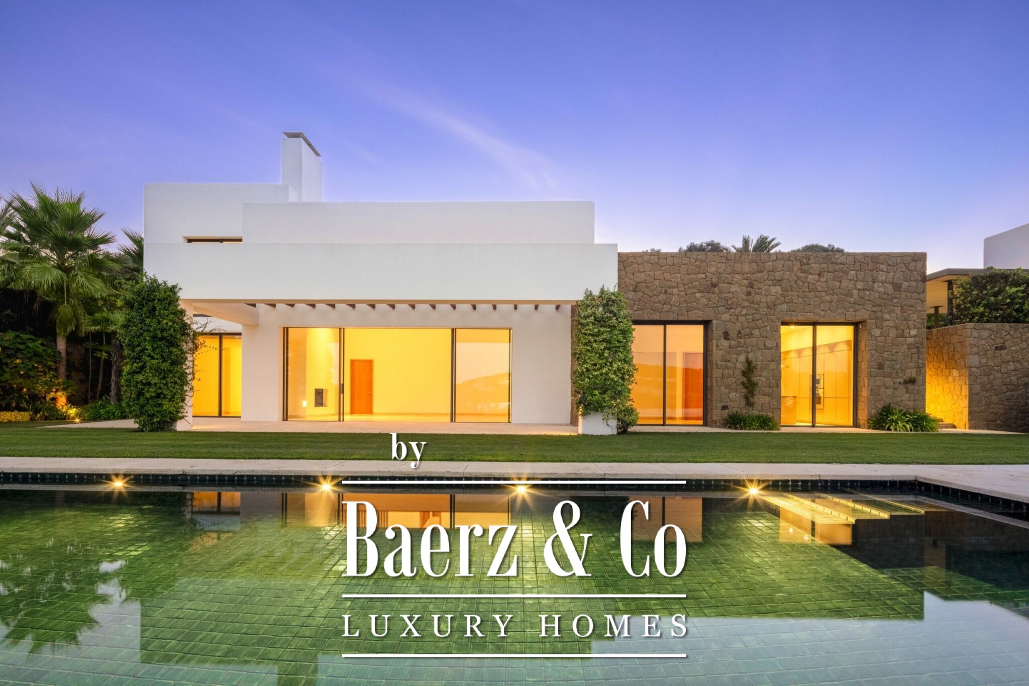 fully equipped with top-of-the-line Gaggenau appliances. Two guest rooms, with direct access to the garden, are thoughtfully located on the ground floor. The upper level of the villa is dedicated to the remaining bedrooms, each boasting its own private bathroom. The walkway connecting the rooms offers a picturesque view of the living area, creating an interior balcony-like experience. The property boasts sweeping vistas of the golf course and surrounding mountain range, providing an idyllic backdrop that radiates tranquillity and serenity. The property also has a private driveway for parking convenience within the plot. With its coveted location within the resort, this villa is an ideal haven for families or those seeking to embrace the luxurious Mediterranean lifestyle in all its splendour.