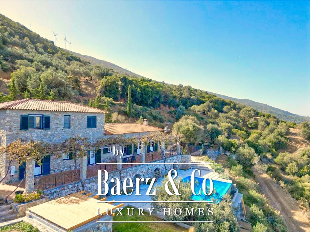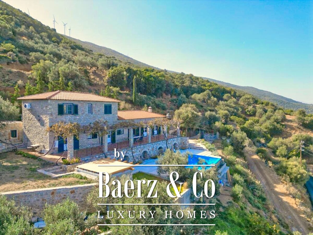Stone villa Galatas rests on a quiet hillside, offering panoramic views over the sea and blending traditional Greek architecture with understated modern comfort. Within its 180 m² interior, spacious and inviting rooms are crafted to embrace natural light, including a central living area anchored by an impressive stone fireplace. Every room, from the separate kitchen to the three bedrooms and two bathrooms, is designed with functionality and subtle luxury in mind.