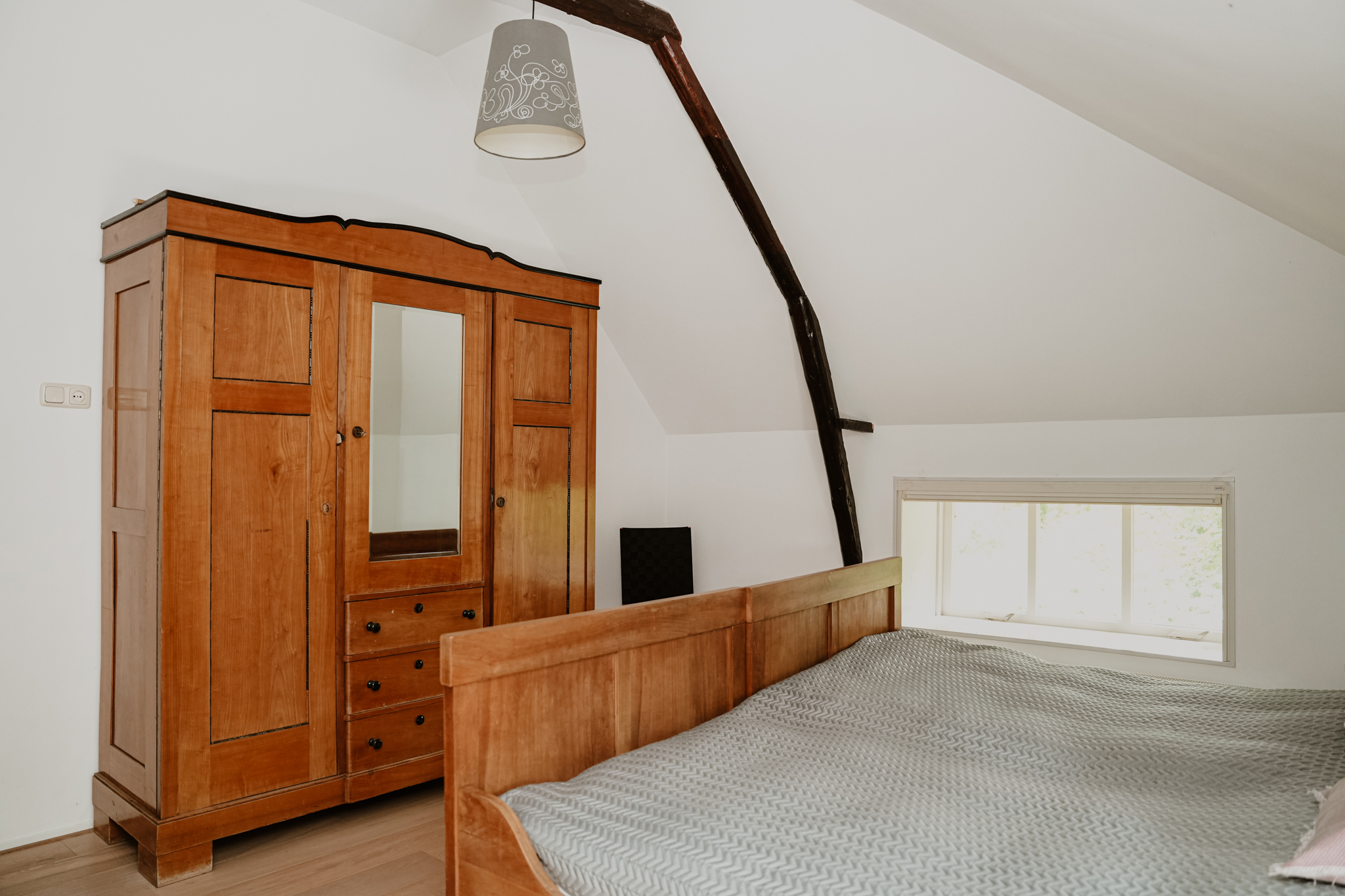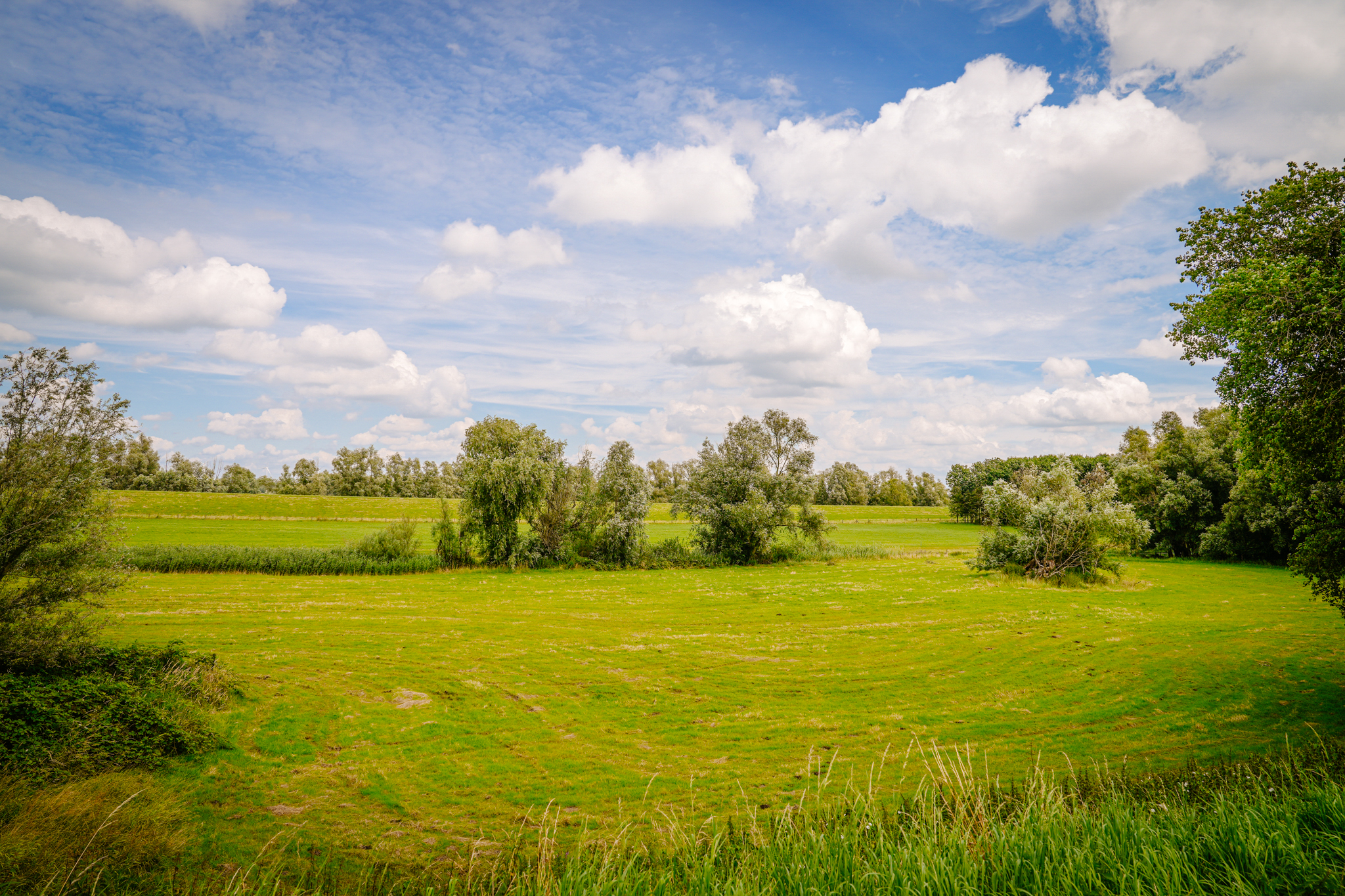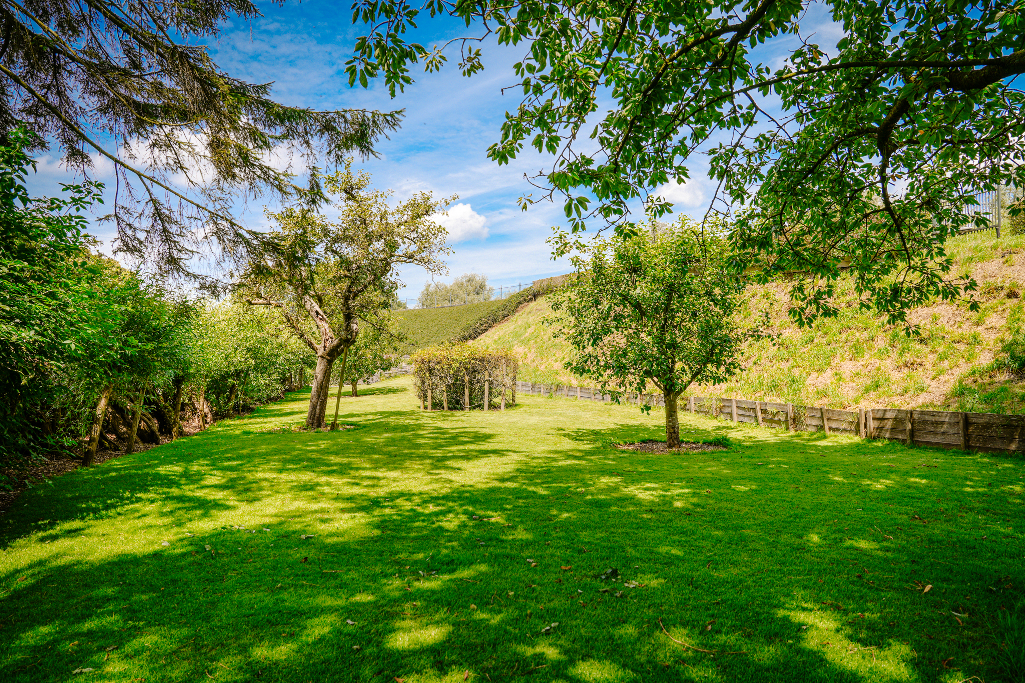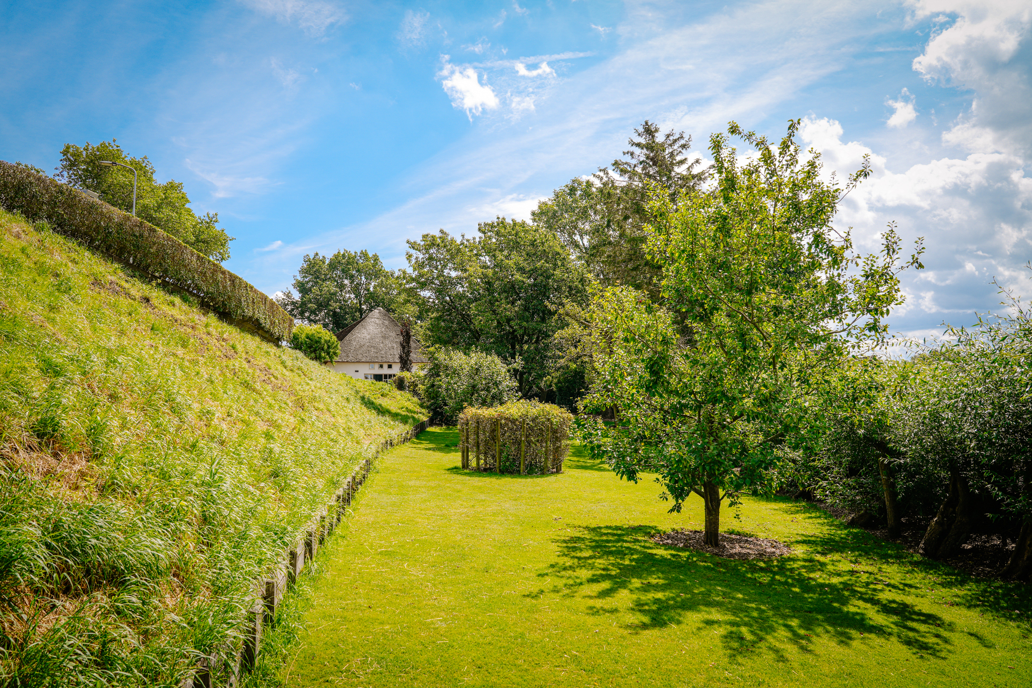 The paved driveway with electric gate and lighting leads to the farmhouse and outbuilding. The south-facing landscape garden is bordered on the ditch side by pollard willows. There is a lawn, mature trees, and standard fruit. On the other side of the farmhouse is a walking/cycling dike from where you have beautiful views of the river Waal and its floodplains.