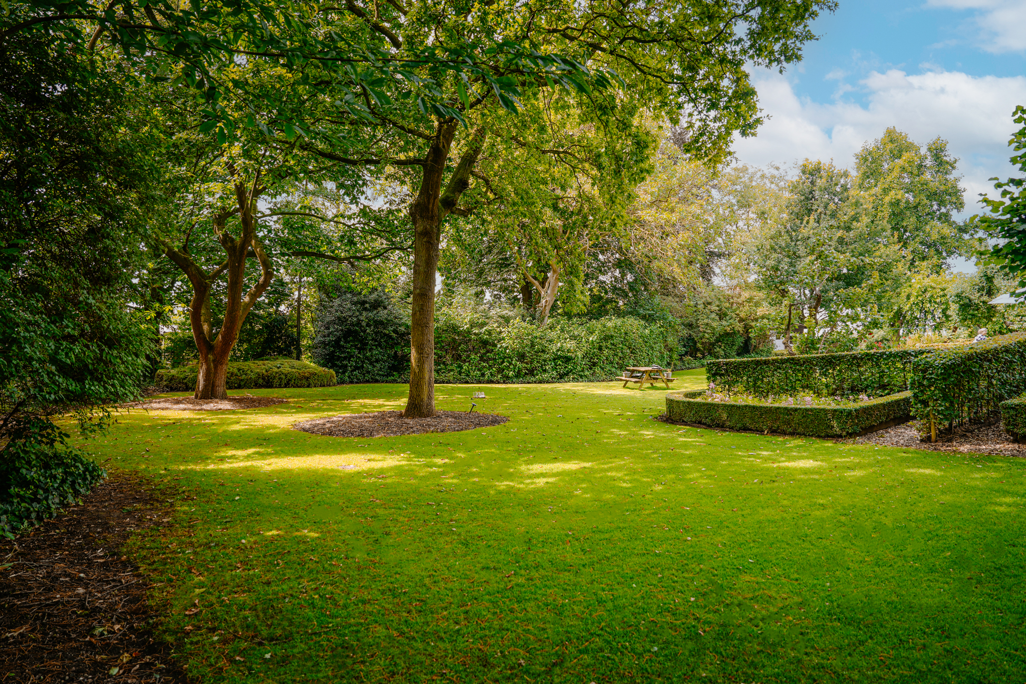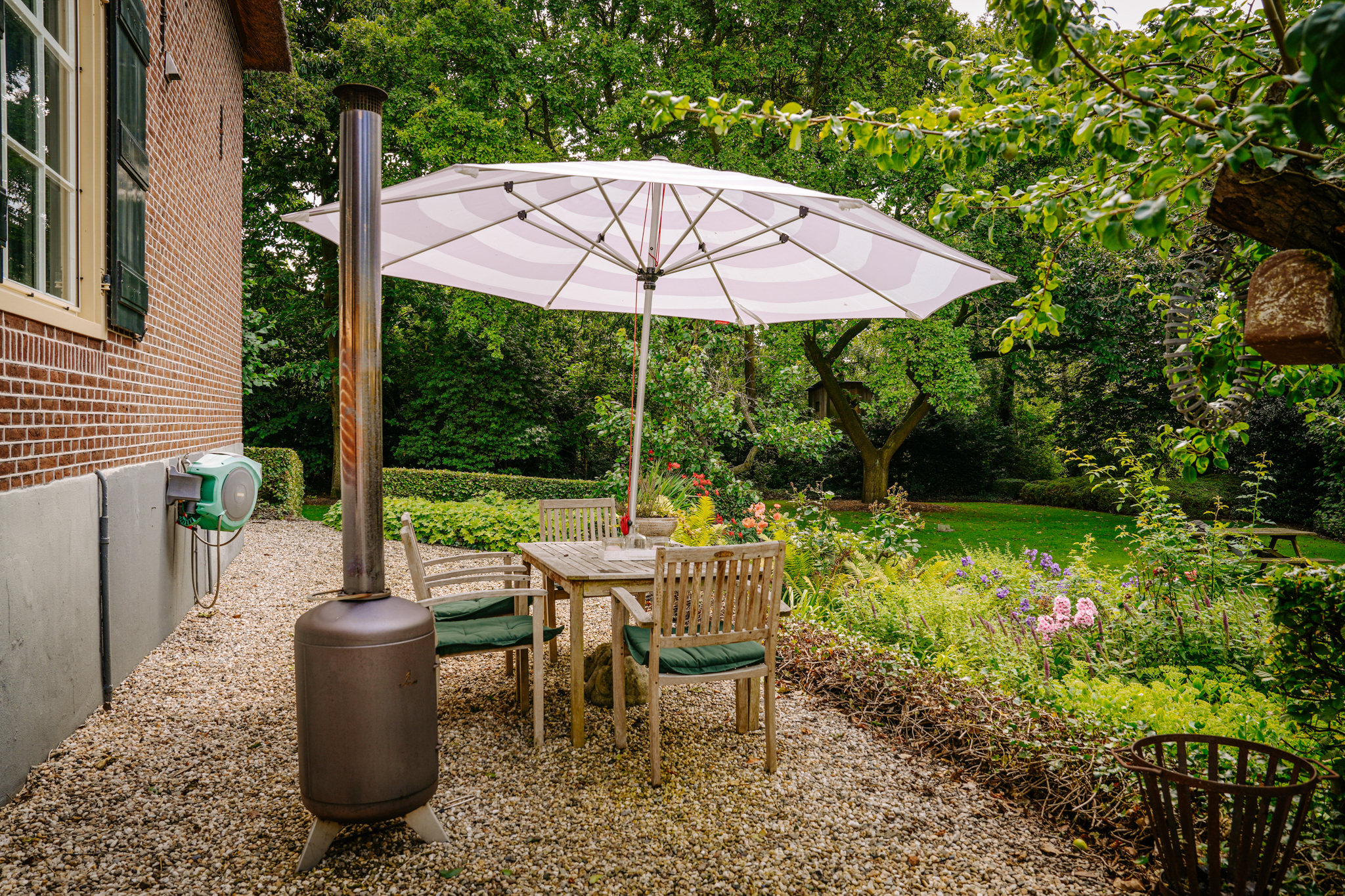 T-farmhouse with a detached outbuilding and a beautifully landscaped landscape garden with mature (fruit) trees facing south.