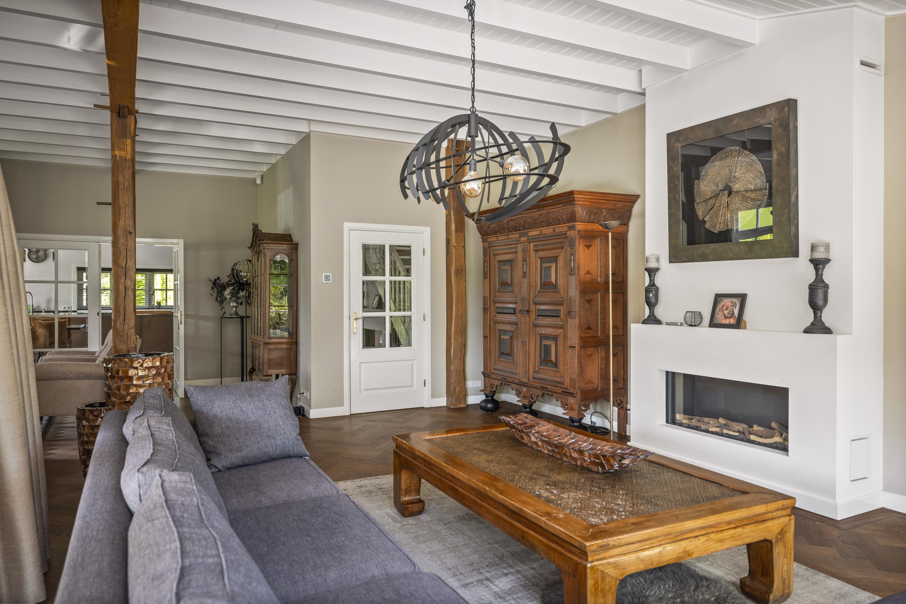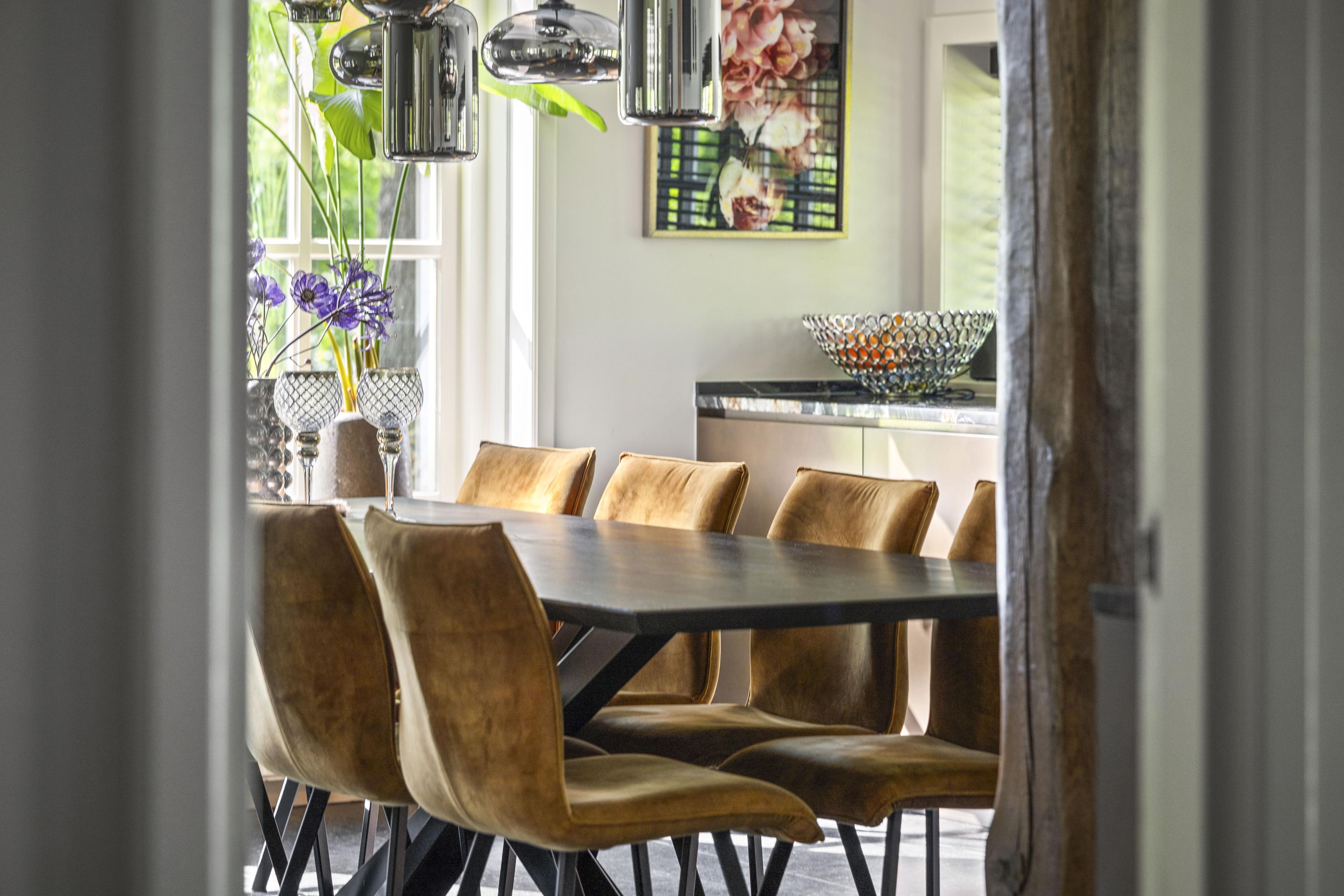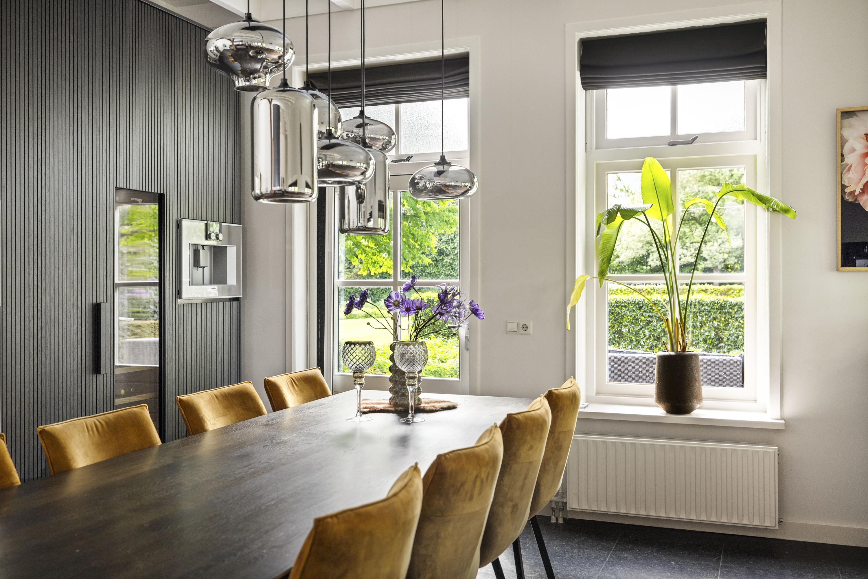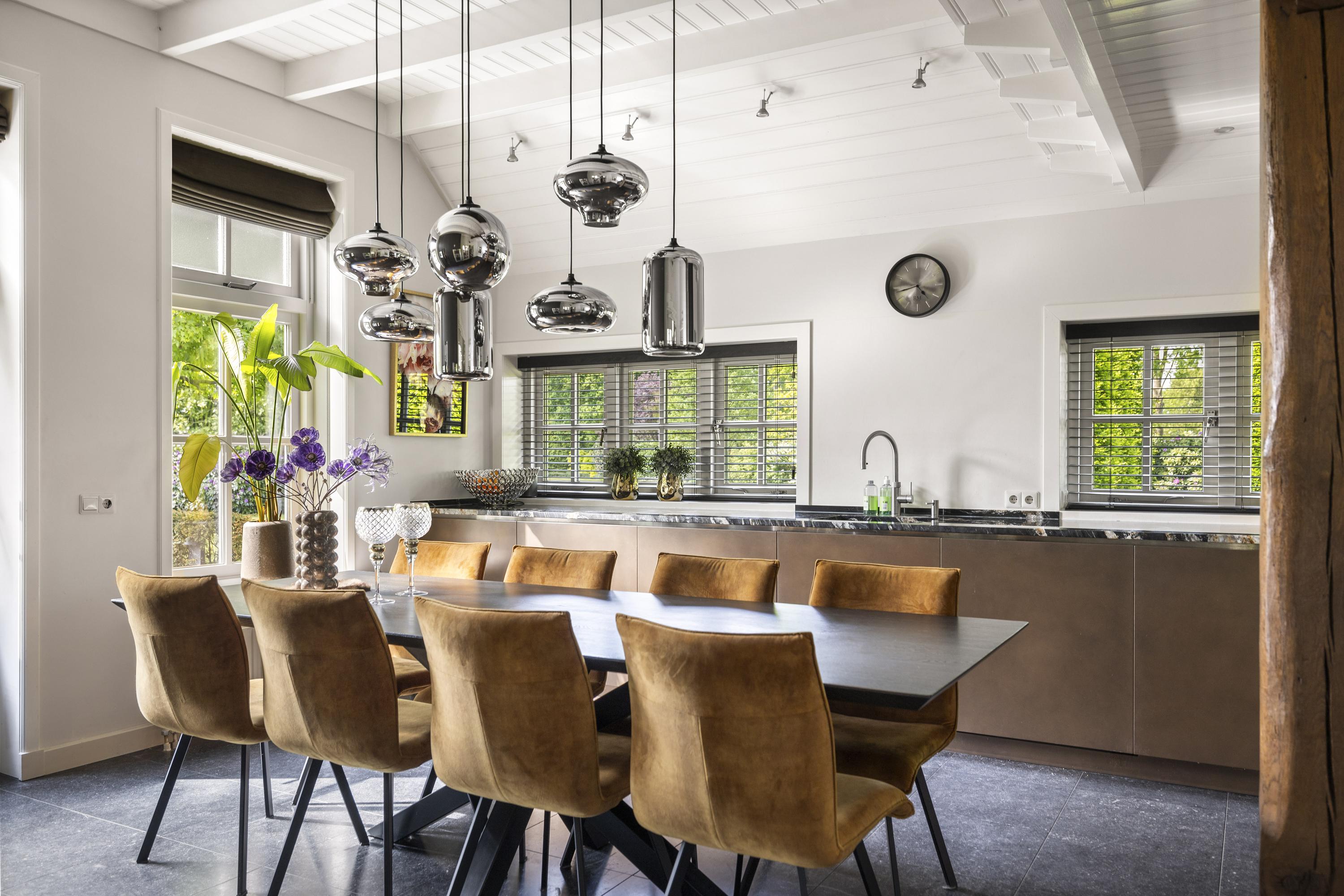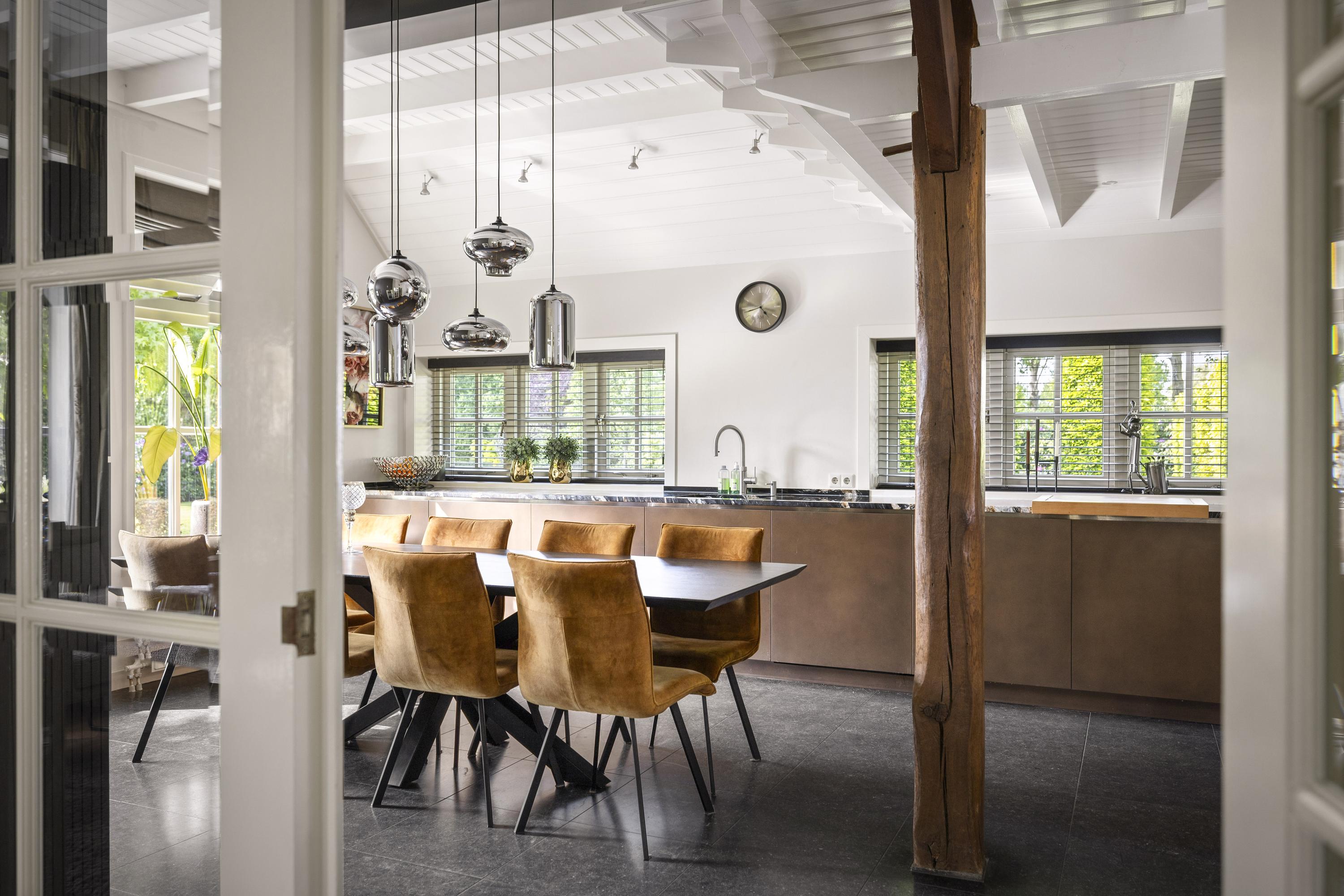 On the right is the kitchen, the beating heart of this house. The design is truly beautiful: traditional craftsmanship by Lodder Keukens from Barneveld, equipped with all modern conveniences. Every door, drawer, and function has been carefully considered. The kitchen has an L-shaped layout and is very spacious, so there is plenty of work space and room for all your guests at the large dining table.