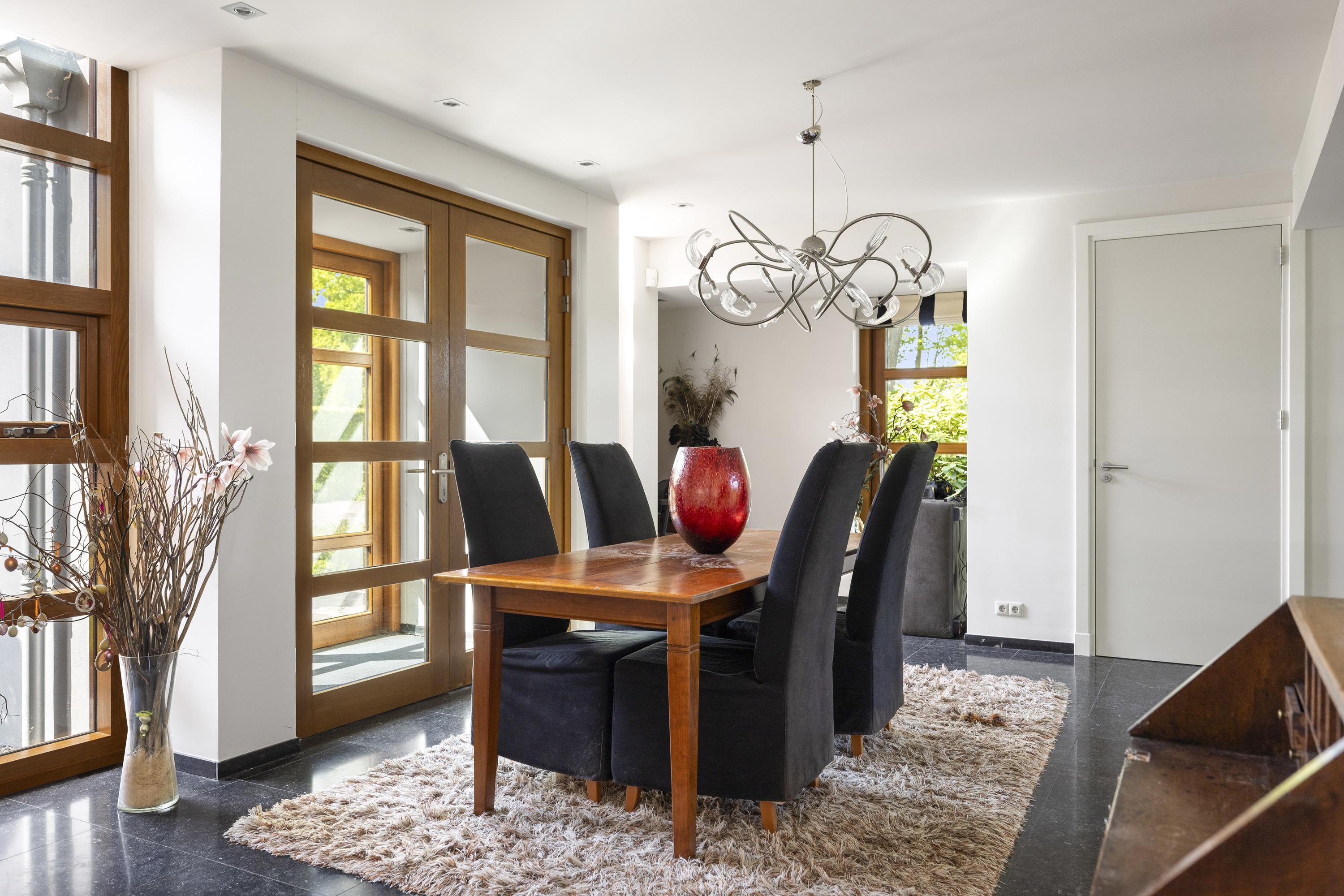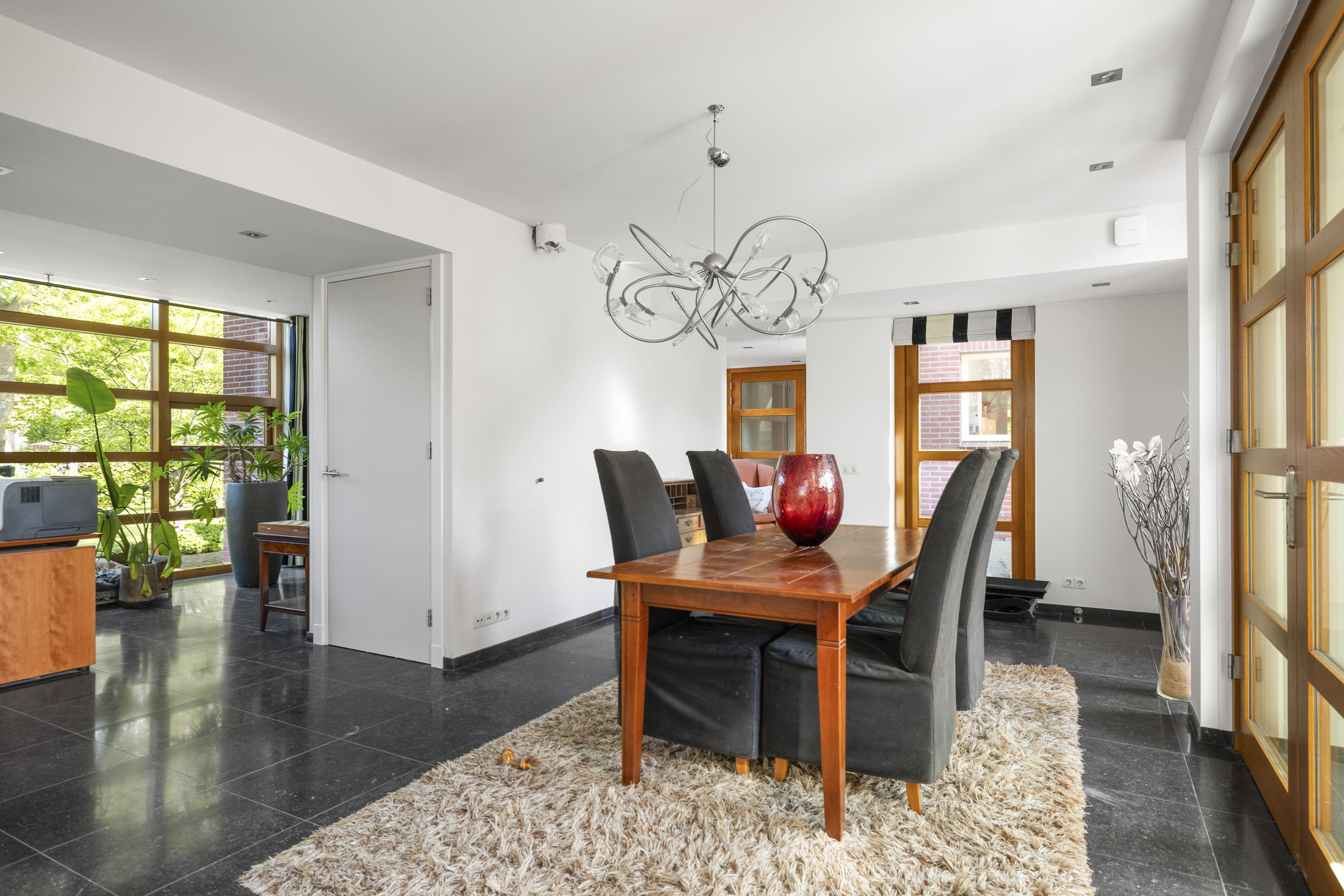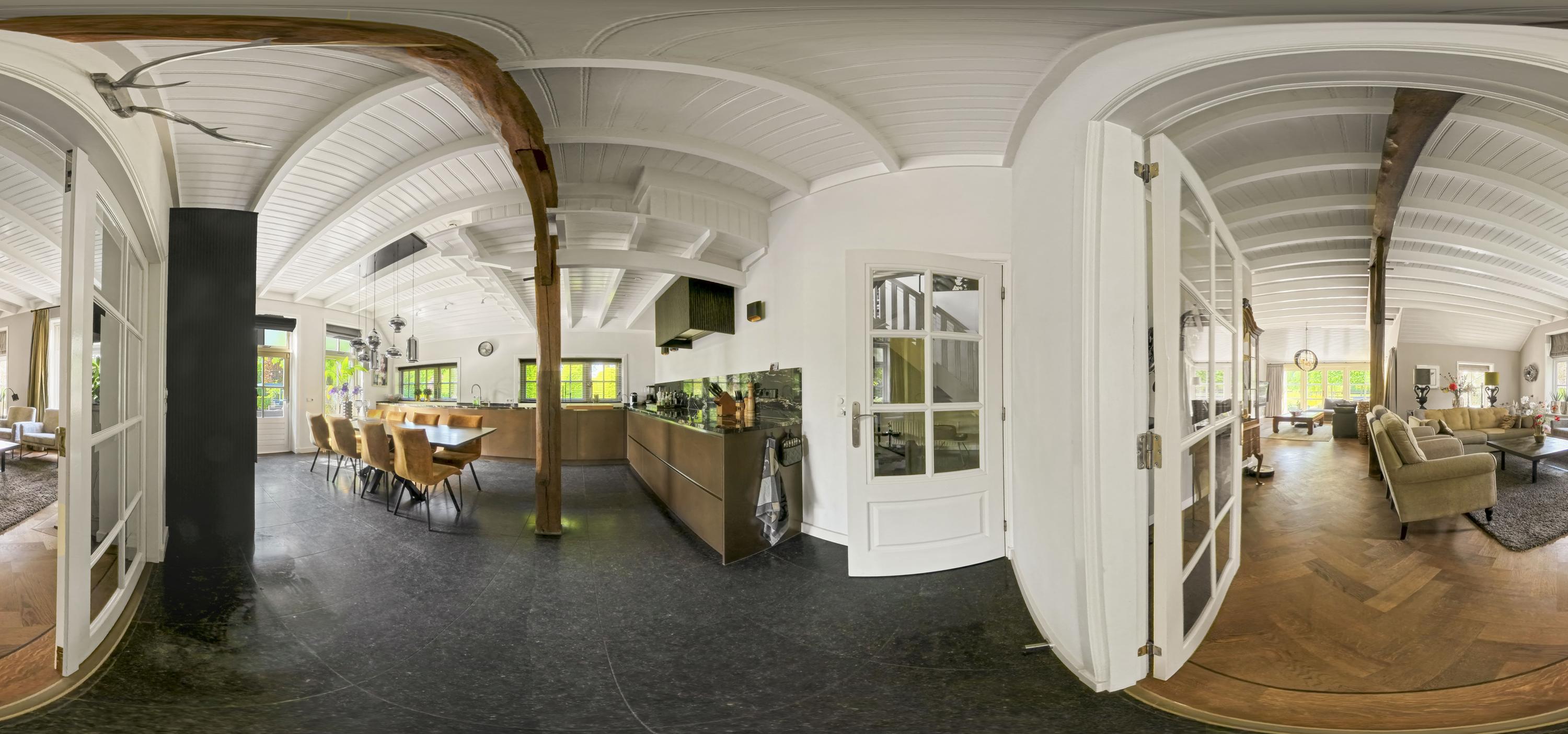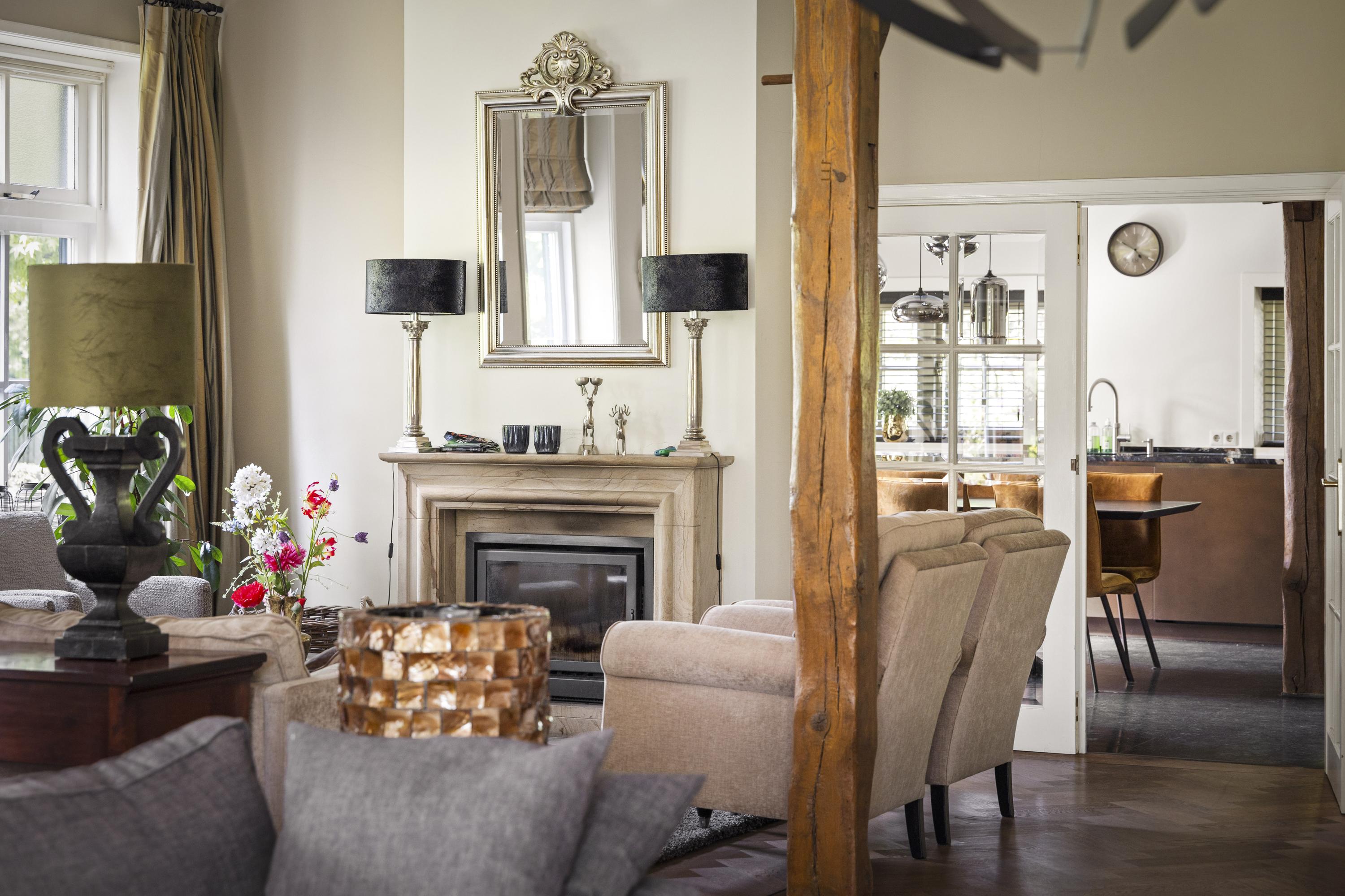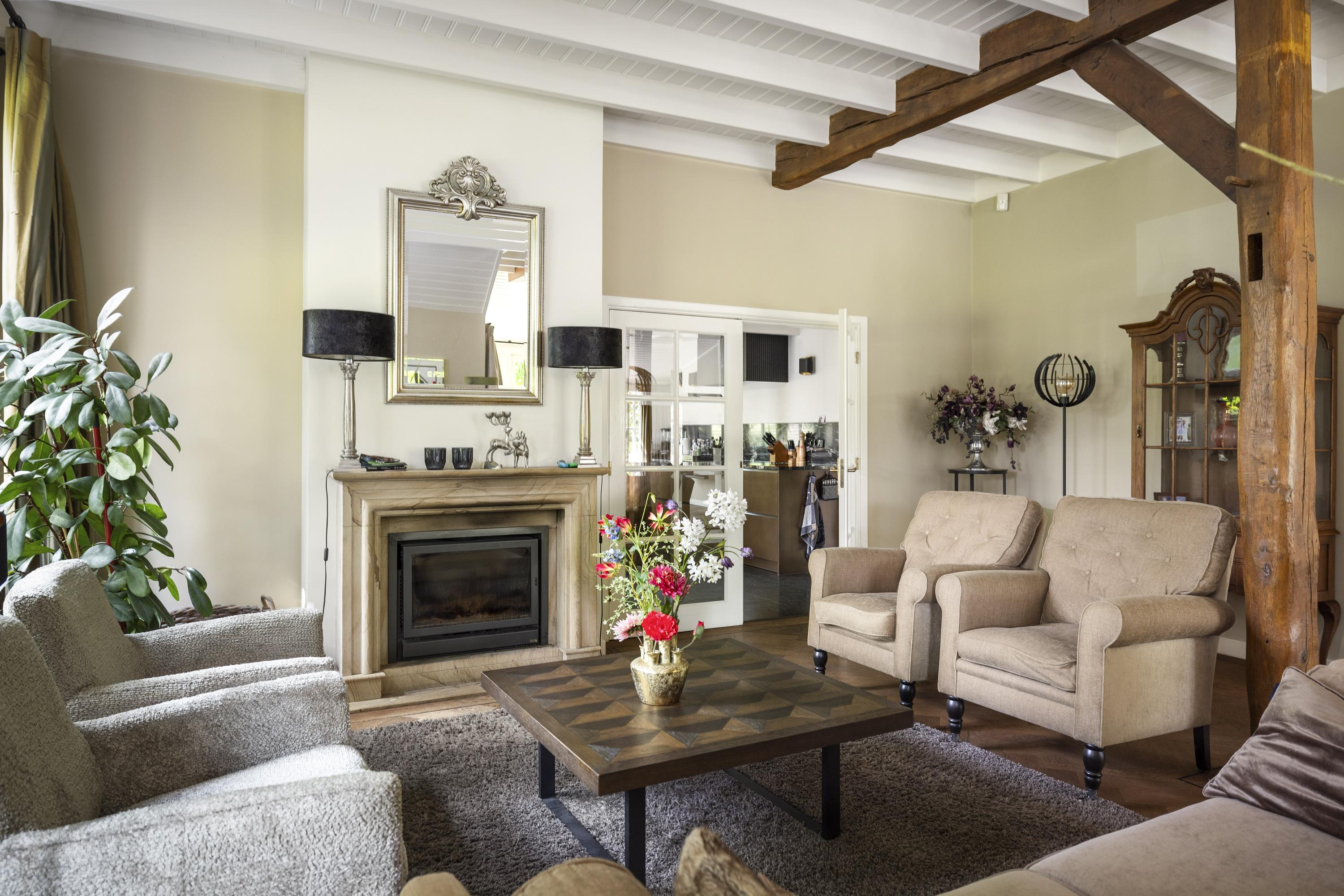 On the right is the kitchen, the beating heart of this house. The design is truly beautiful: traditional craftsmanship by Lodder Keukens from Barneveld, equipped with all modern conveniences. Every door, drawer, and function has been carefully considered. The kitchen has an L-shaped layout and is very spacious, so there is plenty of work space and room for all your guests at the large dining table.