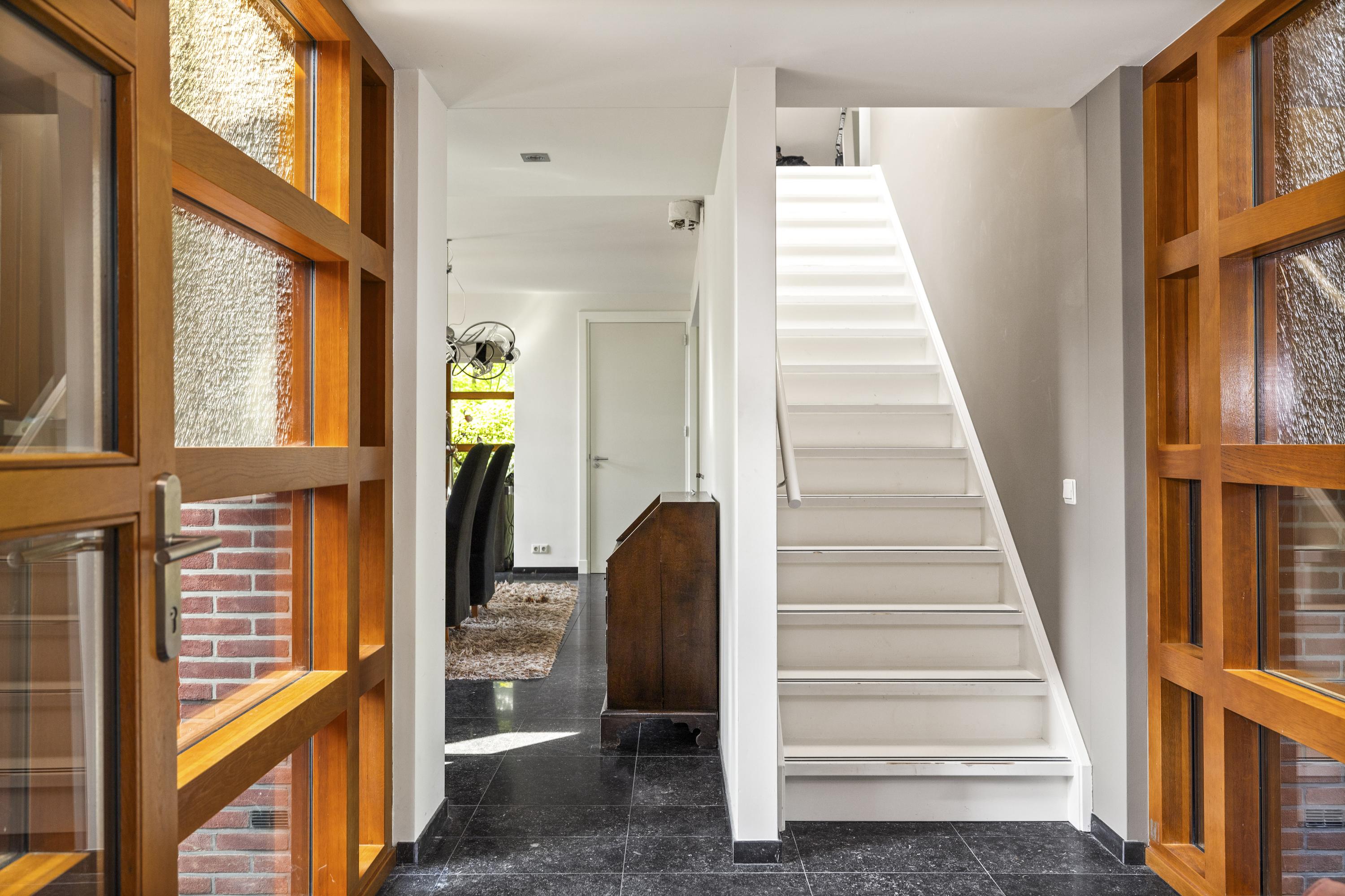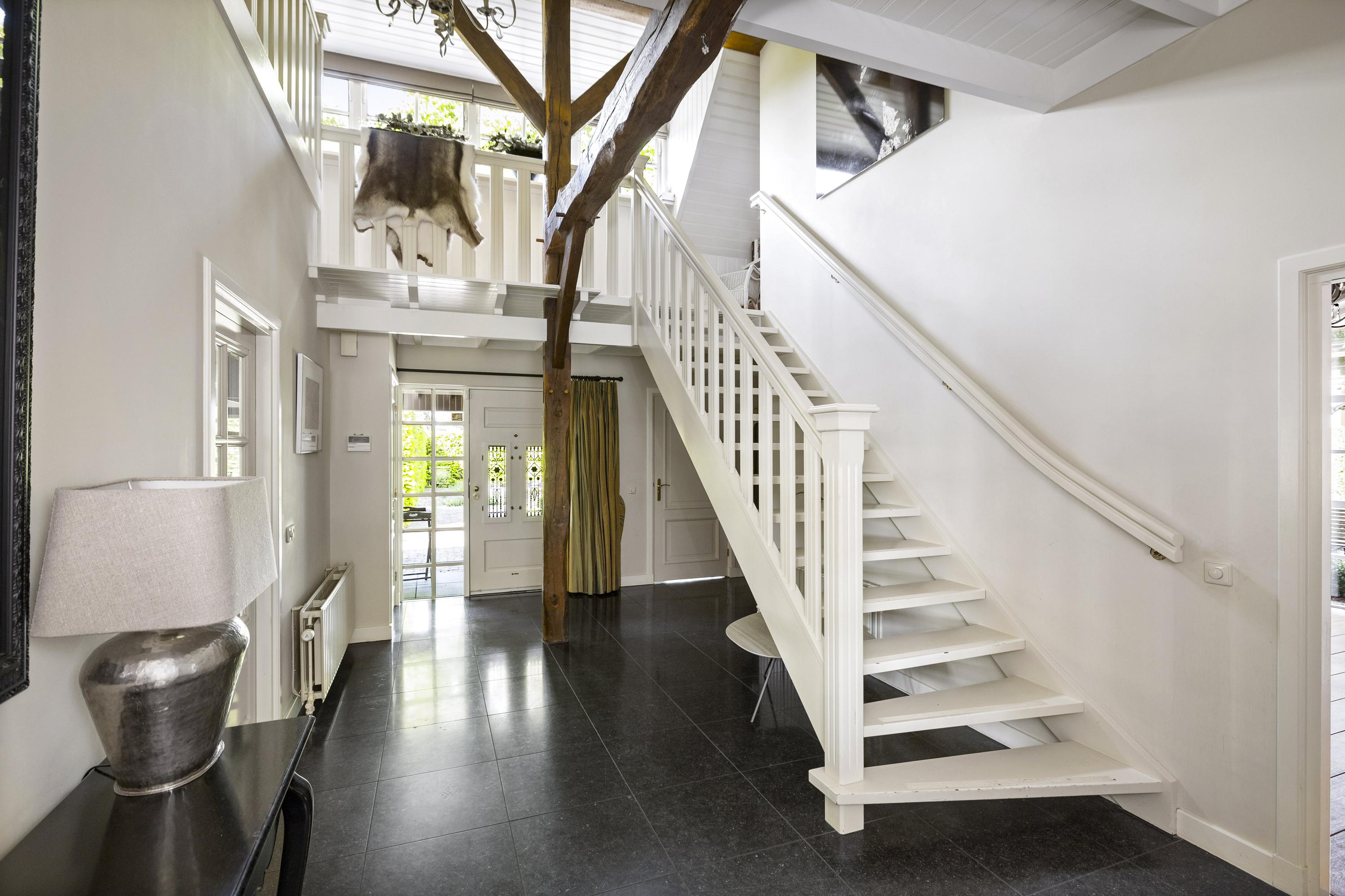 The central hall is magnificent, with natural stone tiles, cream-colored, smoothly plastered walls, and fresh white woodwork. On the left is the toilet with a washbasin and the stairs to the upper floor.