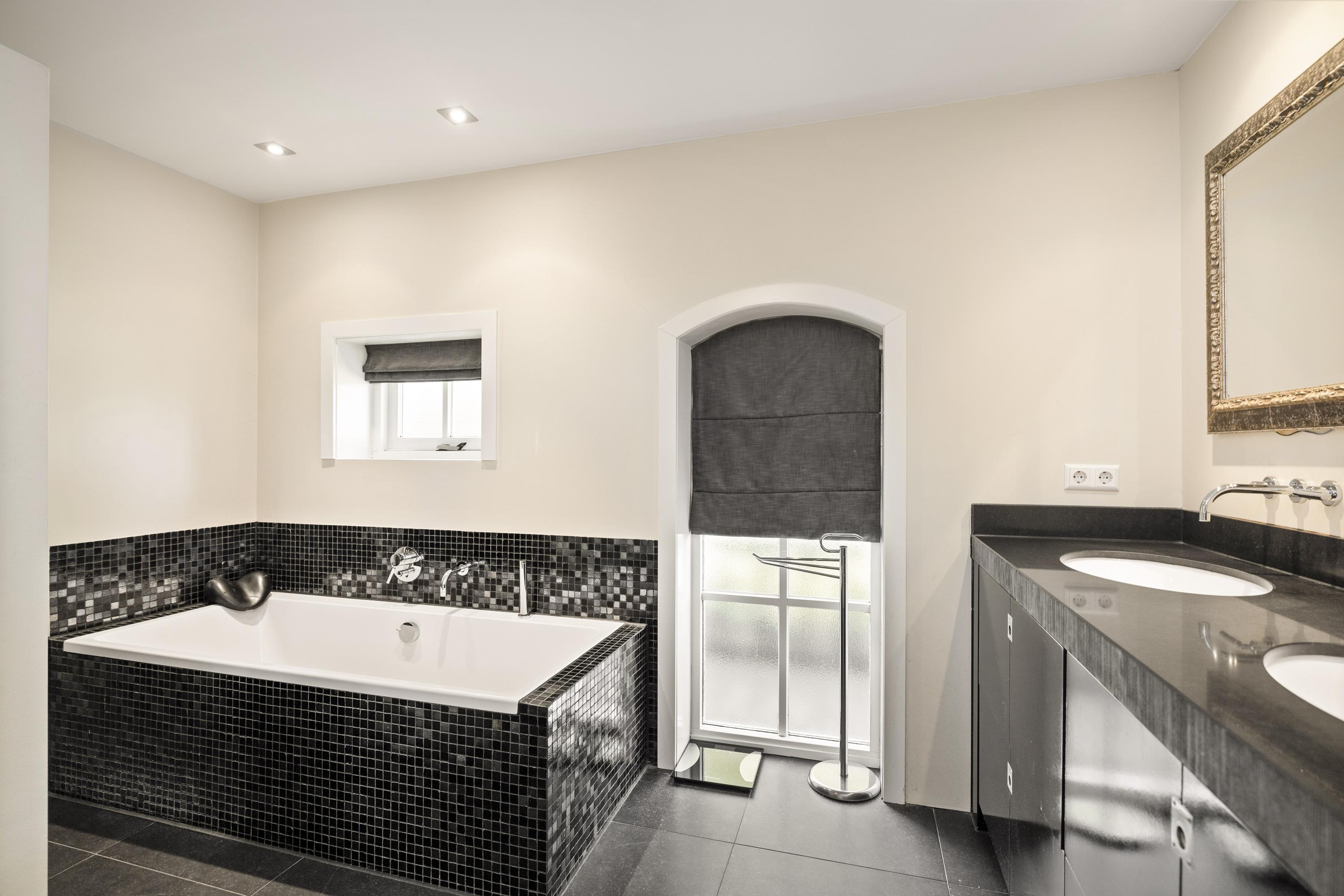 On the left side of the house is the bedroom with bathroom on the ground floor. The former barn doors have been filled with glass and offer a view of and access to the garden and stables. Adjacent is the beautiful bathroom, with a double bathtub, spacious walk-in shower with rain and hand shower, a toilet, and a beautiful double sink.