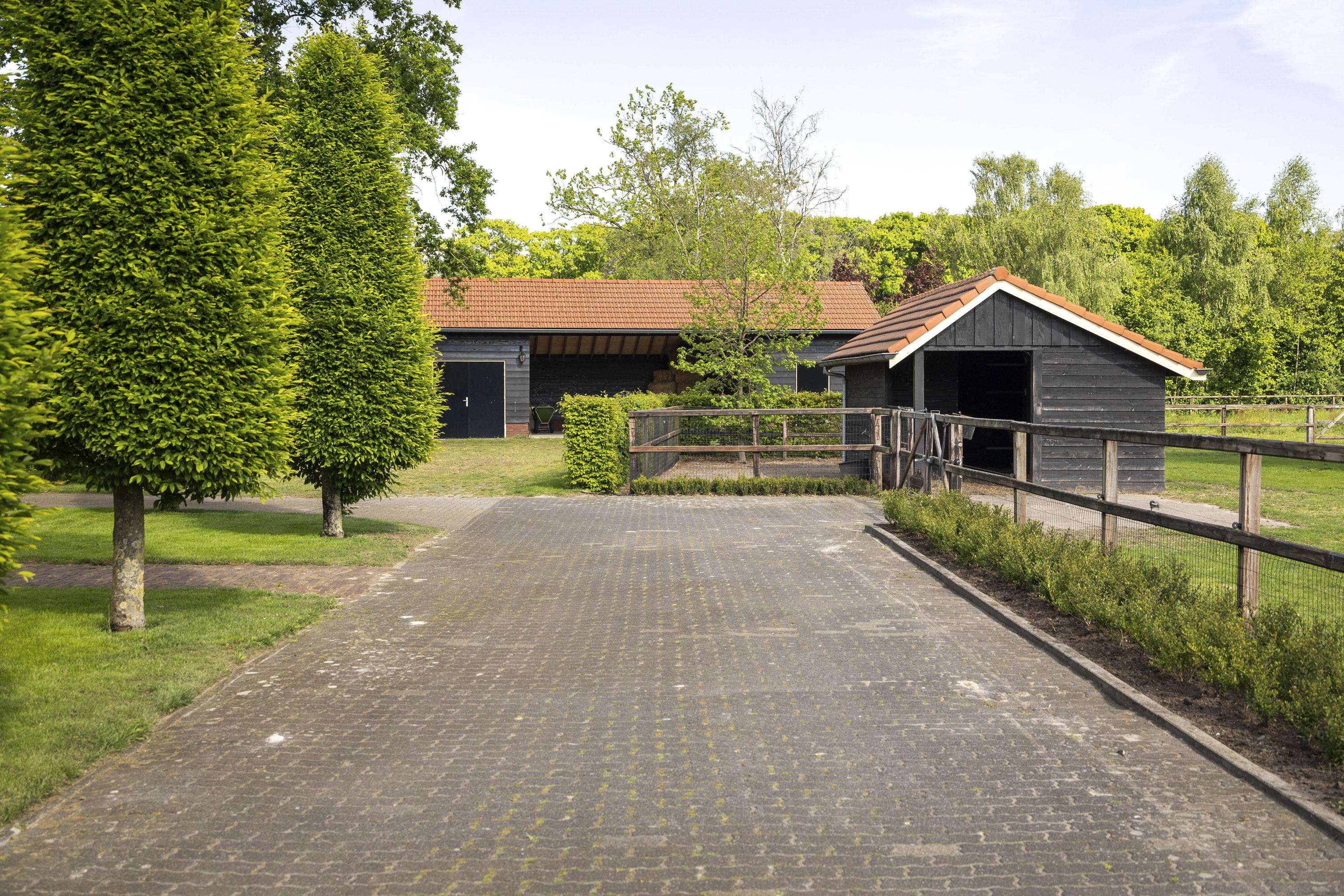 The stable complex has three large stalls, a wash area, and French doors to the paddock.