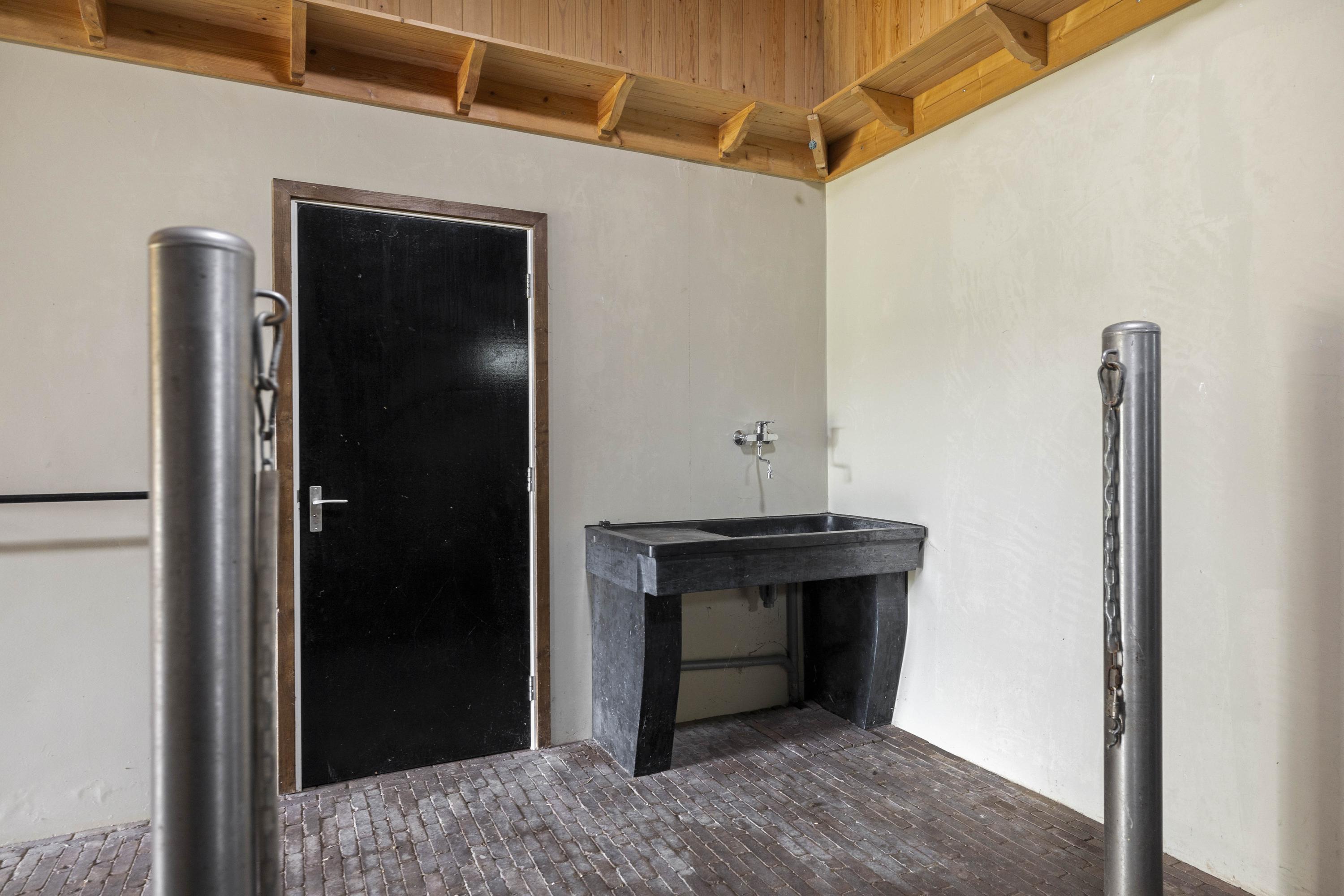 The entrance is located both at the front and in the stables. From the stable complex, there is a bright hall with a series of attractive built-in cupboards. On the left is a storage room and the toilet, and at the rear is the large laundry room with connections for a washing machine and dryer.