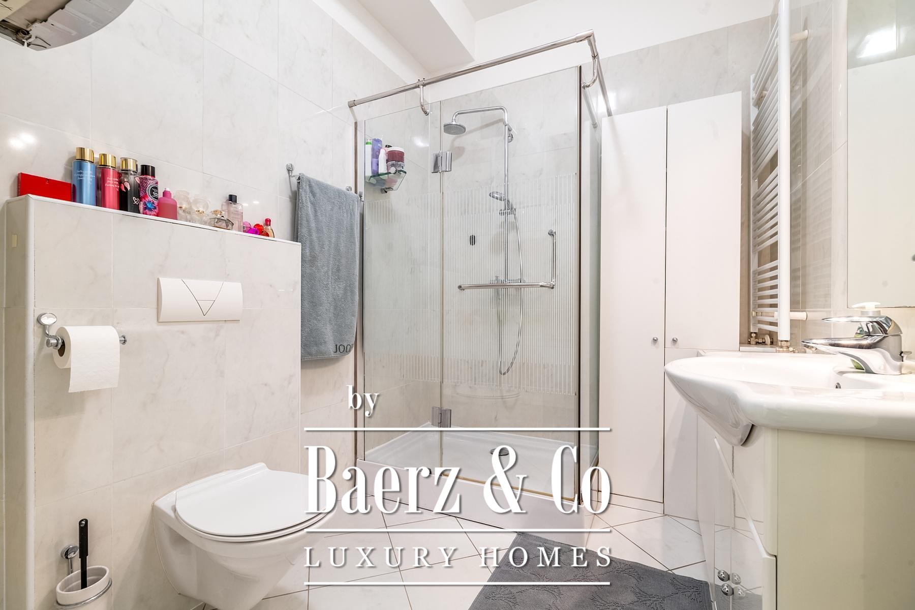 Amenities include gas central heating, air conditioning, elevator access, two garages, an outdoor parking space, and a storage room. The apartment’s north-east orientation enhances morning light while ensuring privacy. Local schools, kindergartens, shops, and public transport are all within easy reach, supporting a family-friendly yet cosmopolitan pace of life.