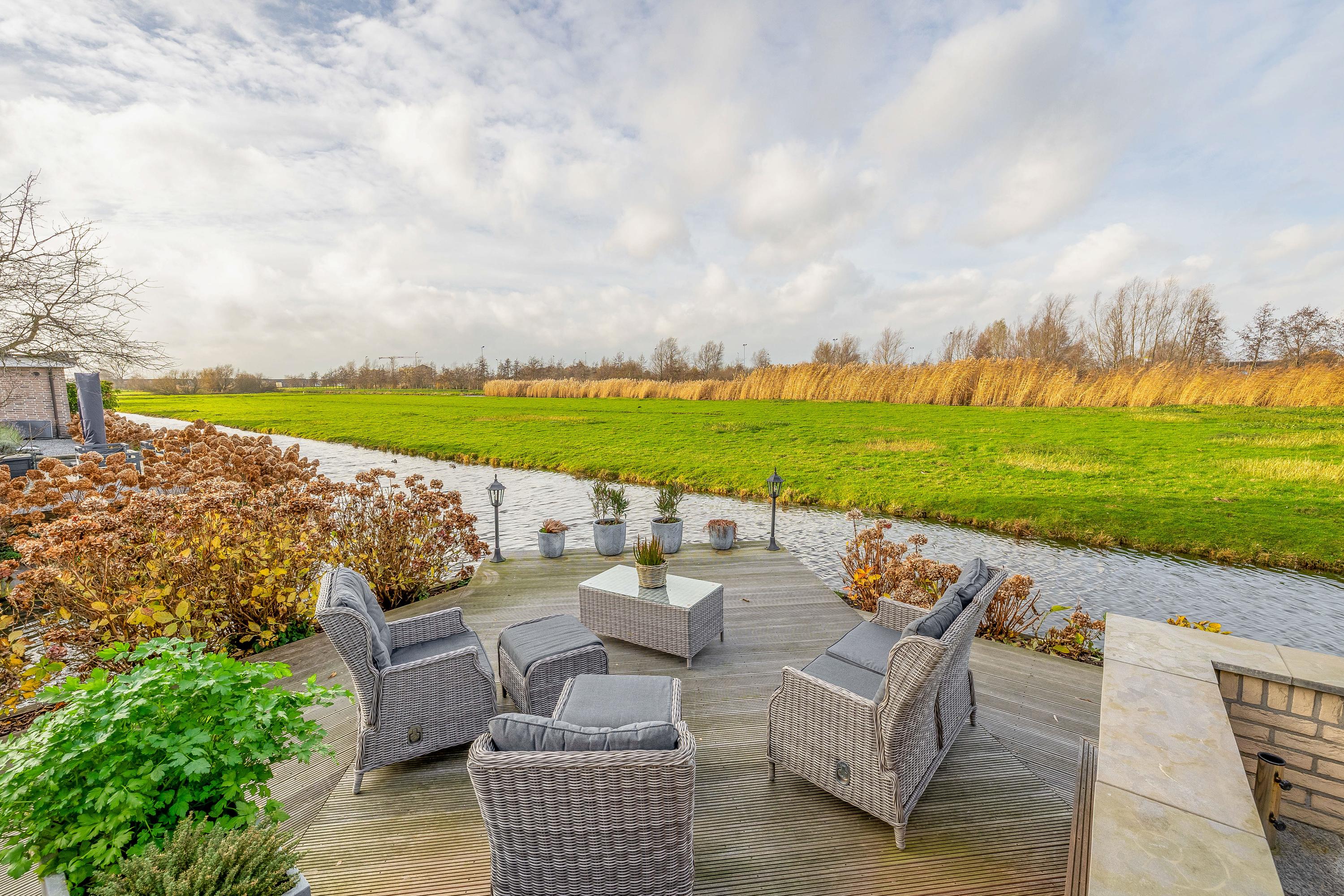The garden has been attractively and carefully landscaped. At the rear there is a large piled terrace, ideal for a dining table or lounge set. In 2024, a new wooden deck was installed directly by the water, where you can enjoy complete privacy and stunning views over the surrounding countryside. At the front there is a bridge over the water leading to the driveway with space for multiple cars. The practical storage shed is ideal for bicycles or a motorcycle and is accessible from both the garden and the parking area. At the front of the house there is a charging point for an electric car.