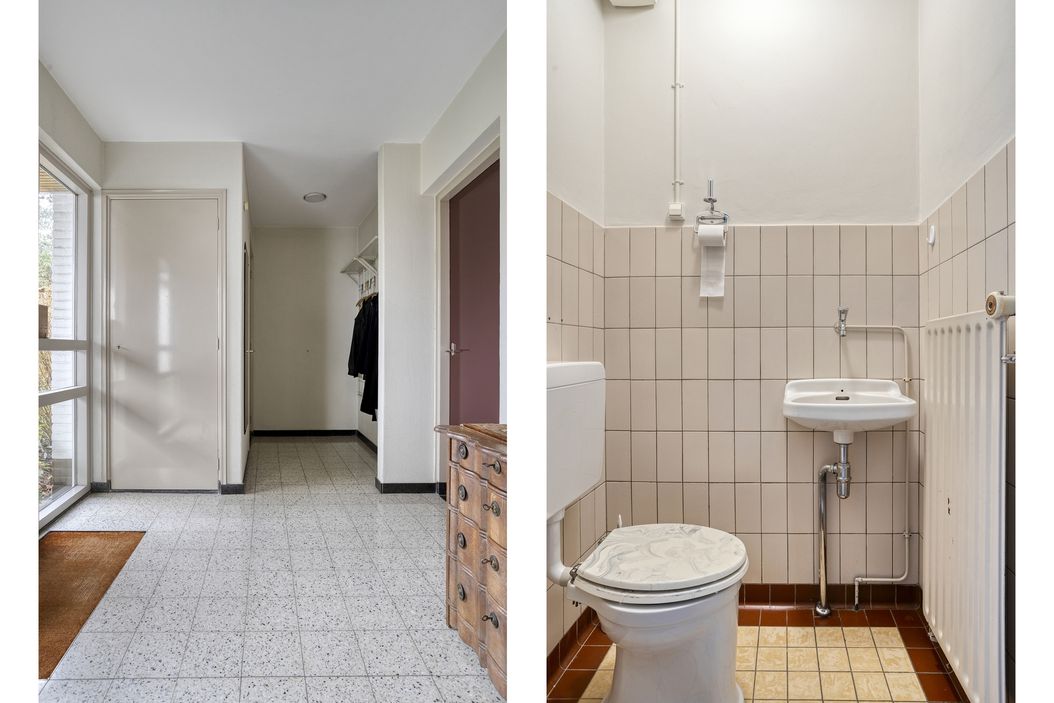Fully tiled toilet with washbasin;
