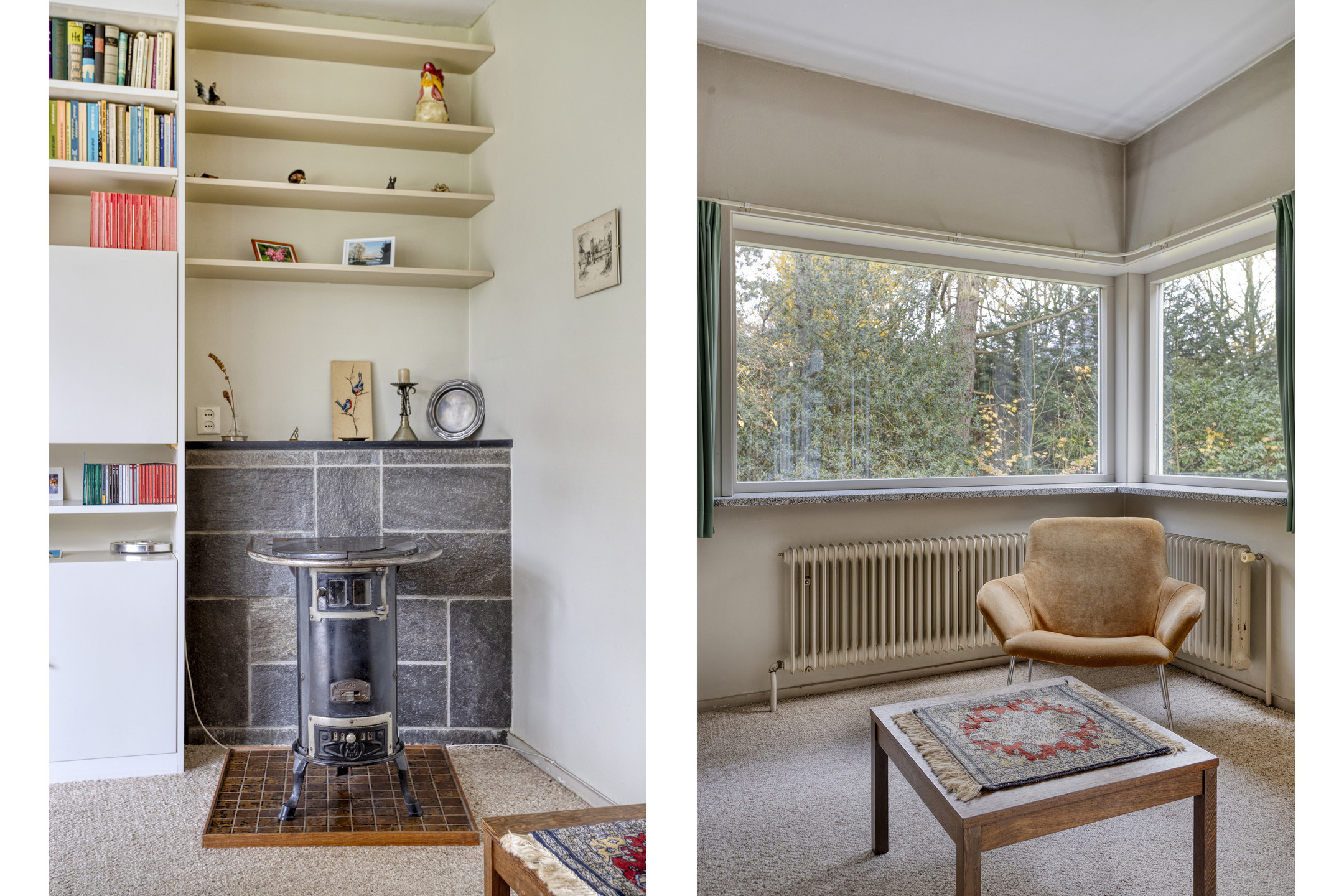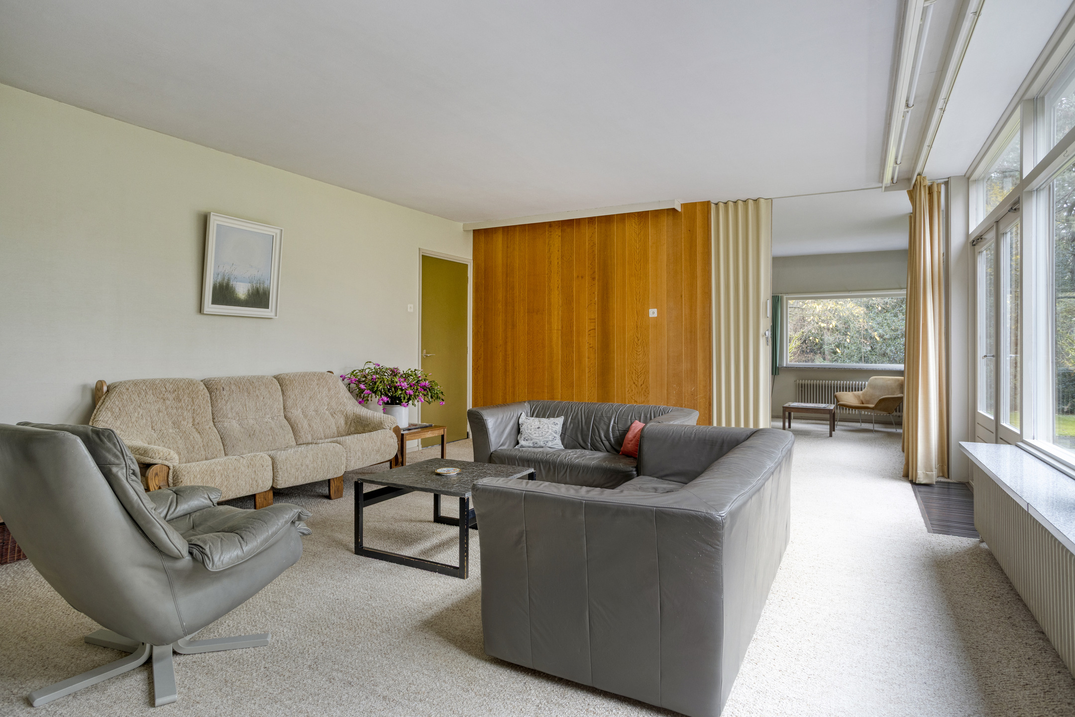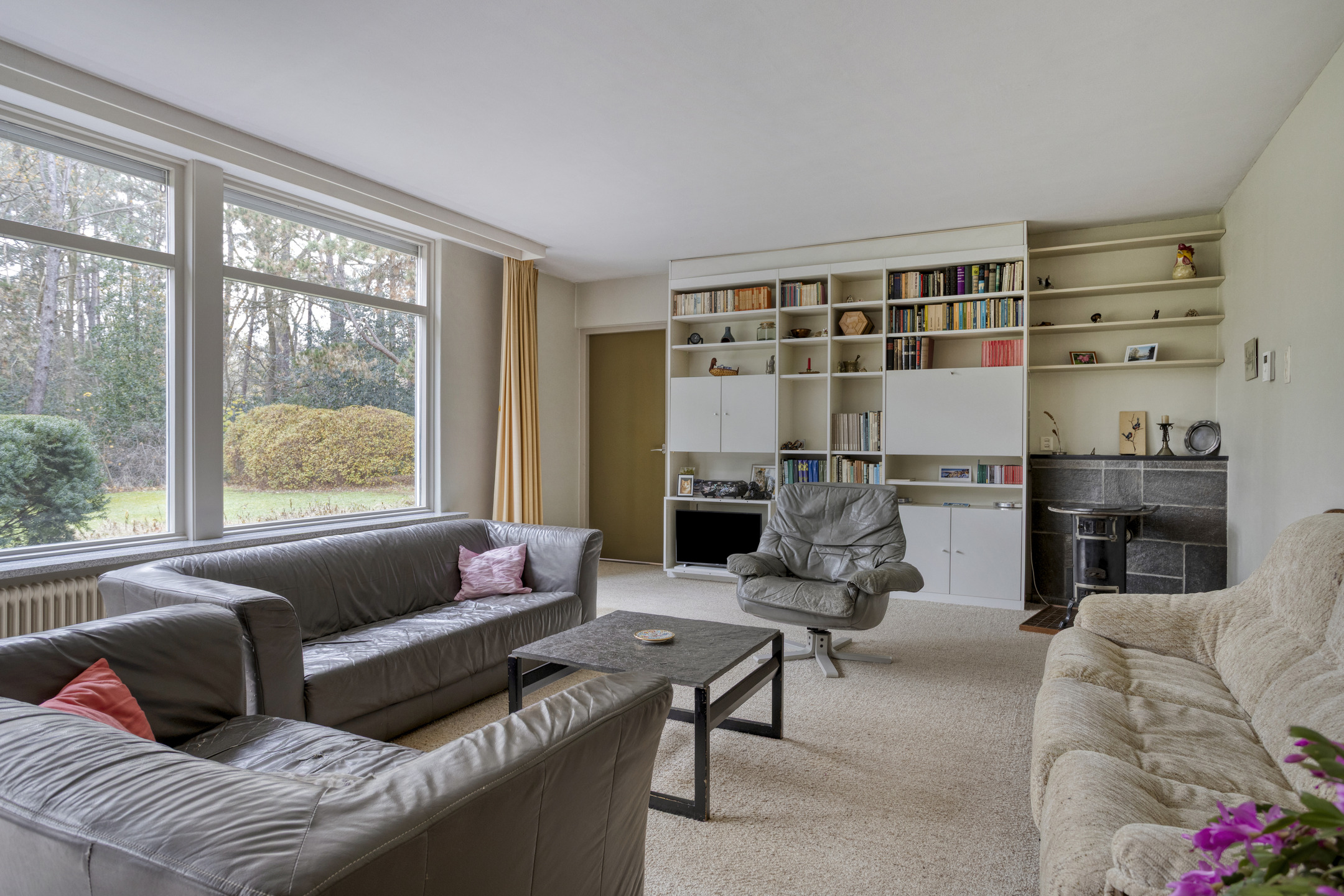 Living room with convector pit, stove connection and solar screens, plastered walls, carpeted floor, plastered ceiling, and door to the garden/terrace;