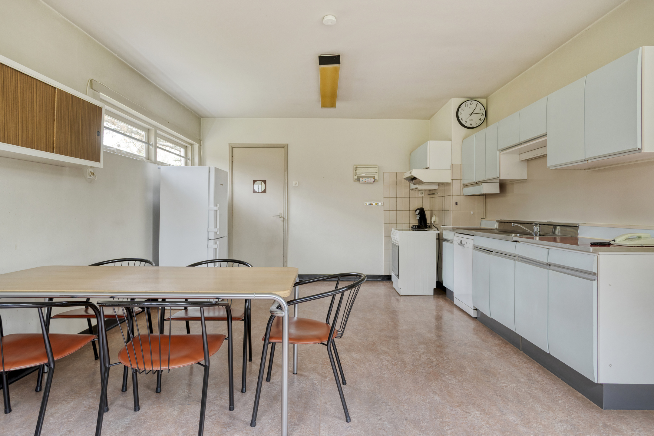 Enclosed kitchen with a linear fitted kitchen unit, featuring a synthetic worktop with double sink, dishwasher connection and extractor hood; plastered walls, linoleum flooring, plastered ceiling;
