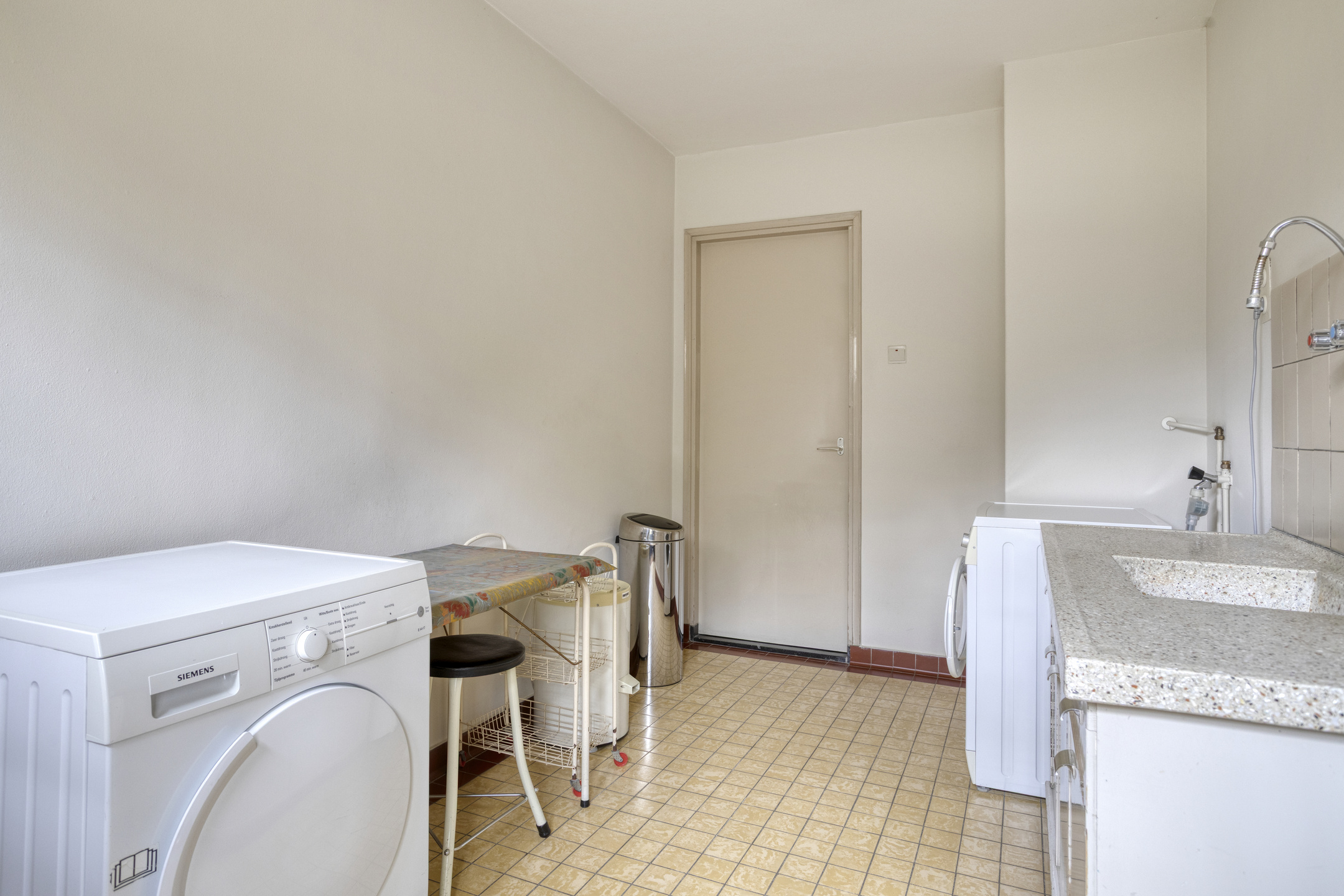 Utility room with washing machine and dryer connections and a countertop with sink; tiled walls and floor, plastered ceiling, and second access to the crawl space;