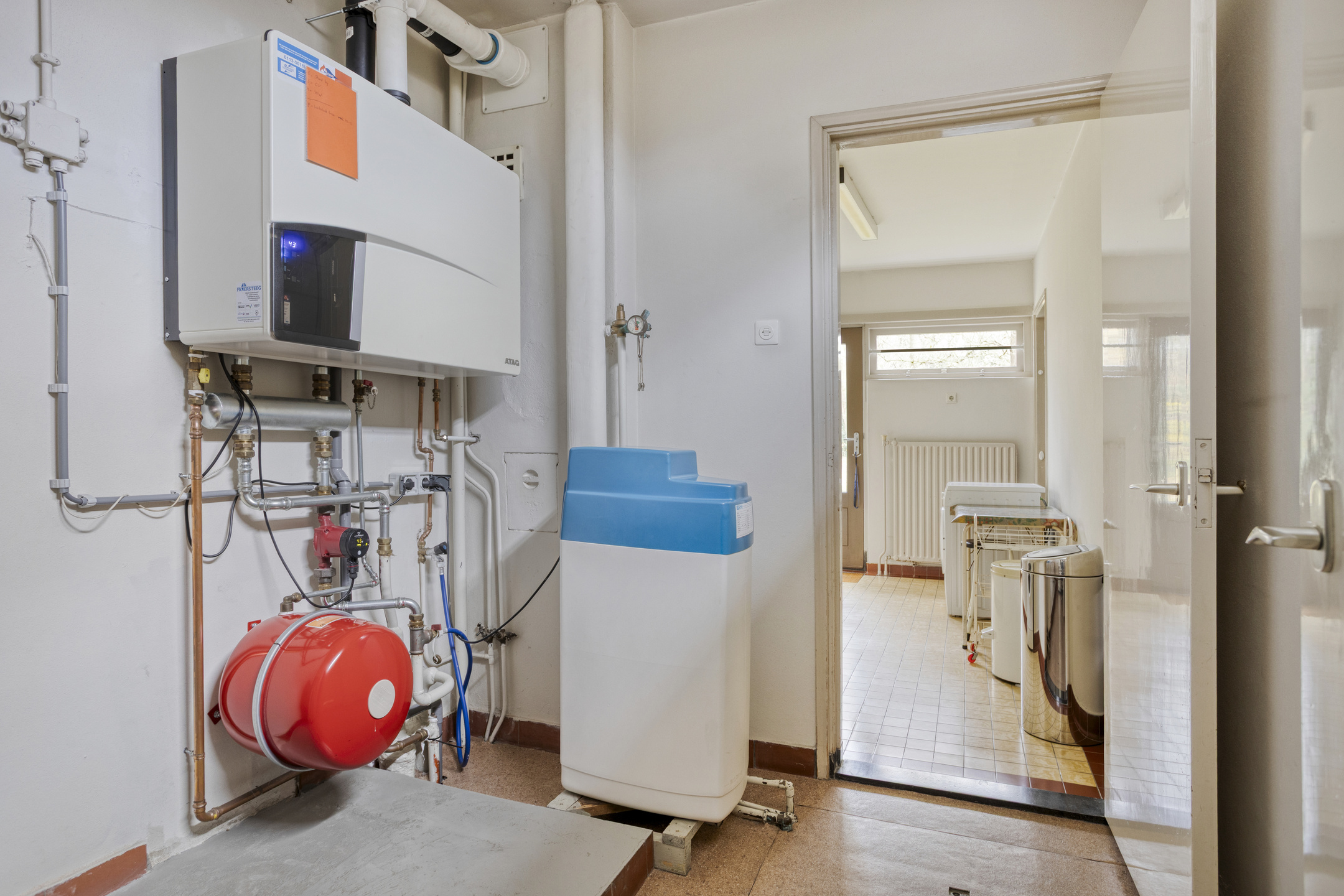 Technical room with access to the crawl space, housing the HR high-efficiency combi boiler and water softener.