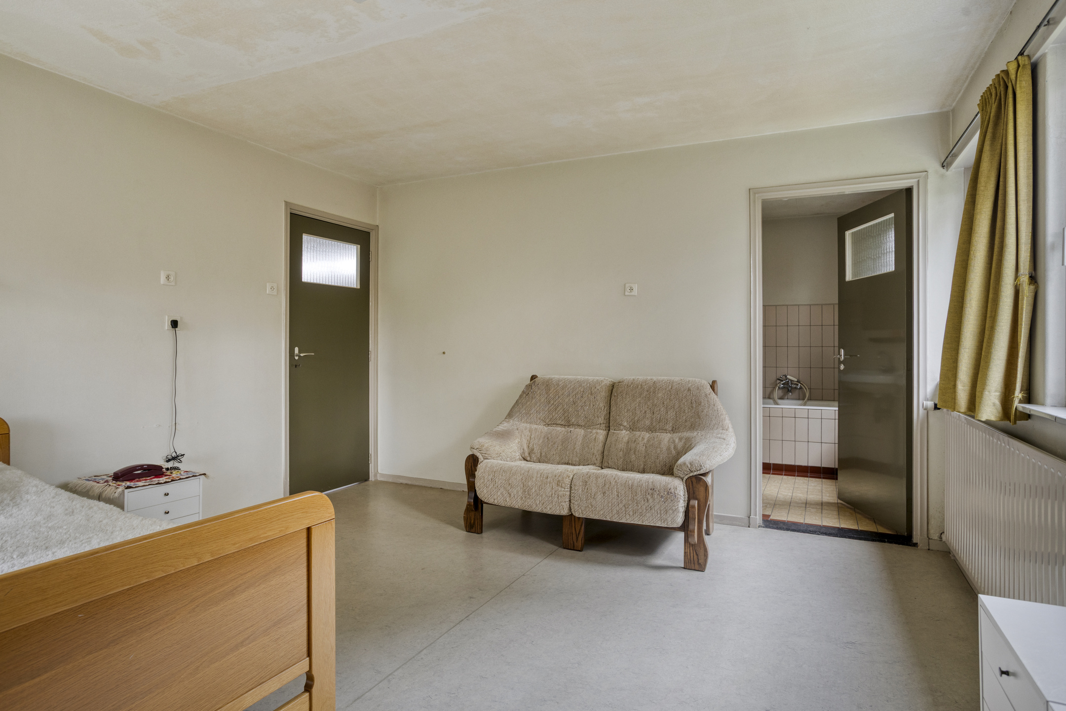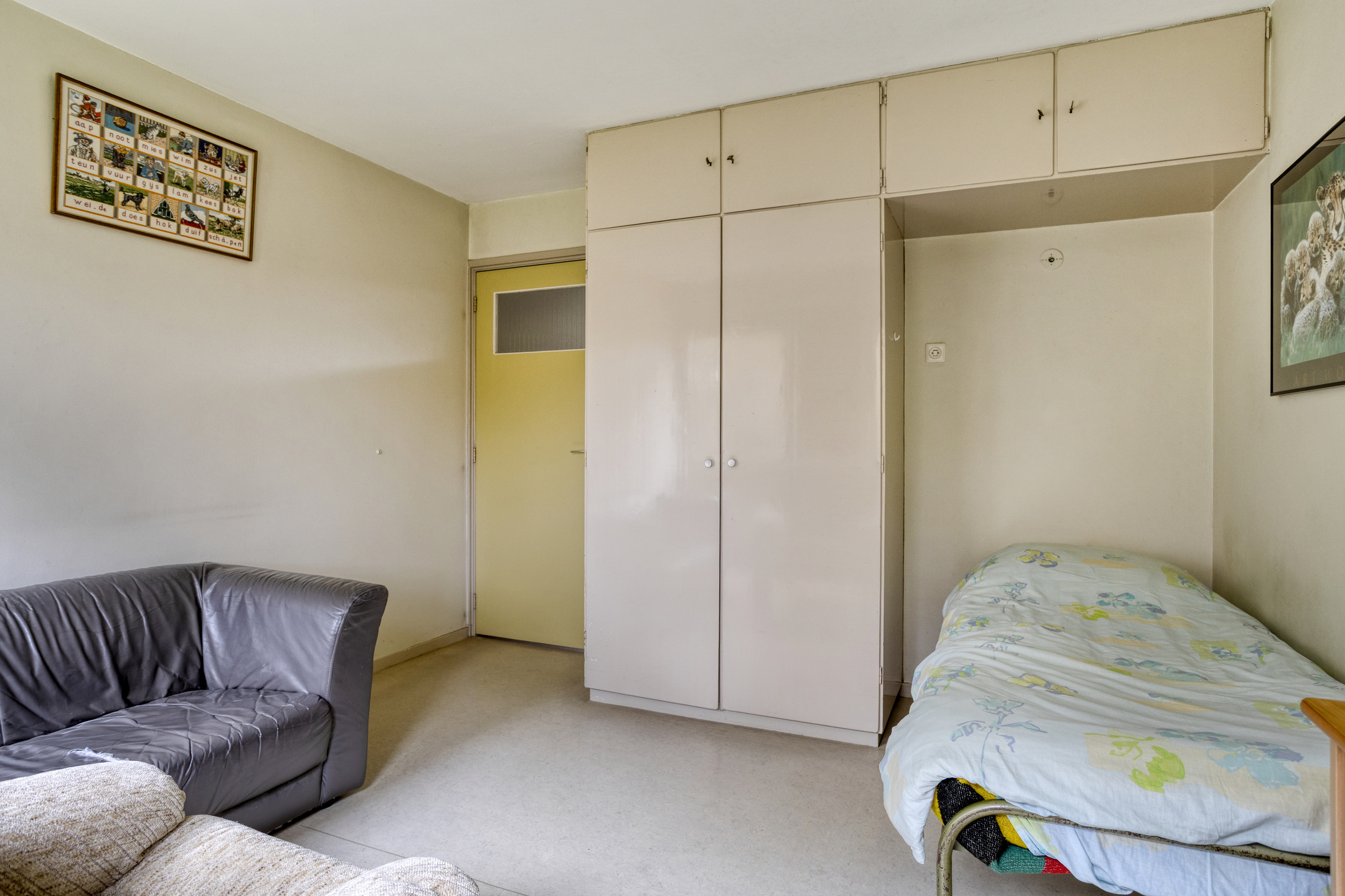Rear middle bedroom with built-in wardrobe and washbasin connection (not in use), plastered walls, linoleum flooring, plastered ceiling;