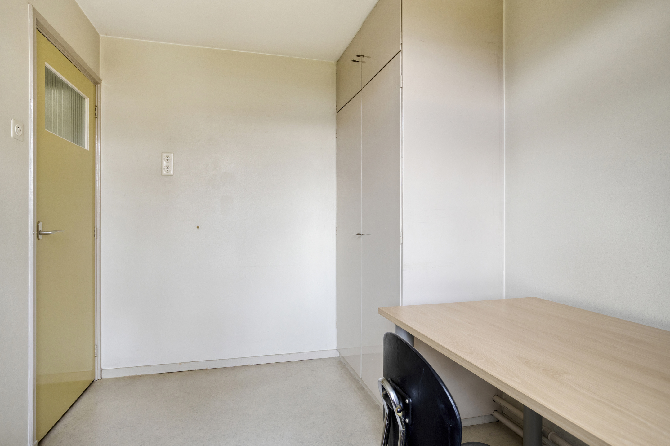 Internal storage room with plastered walls, linoleum flooring, plastered ceiling;