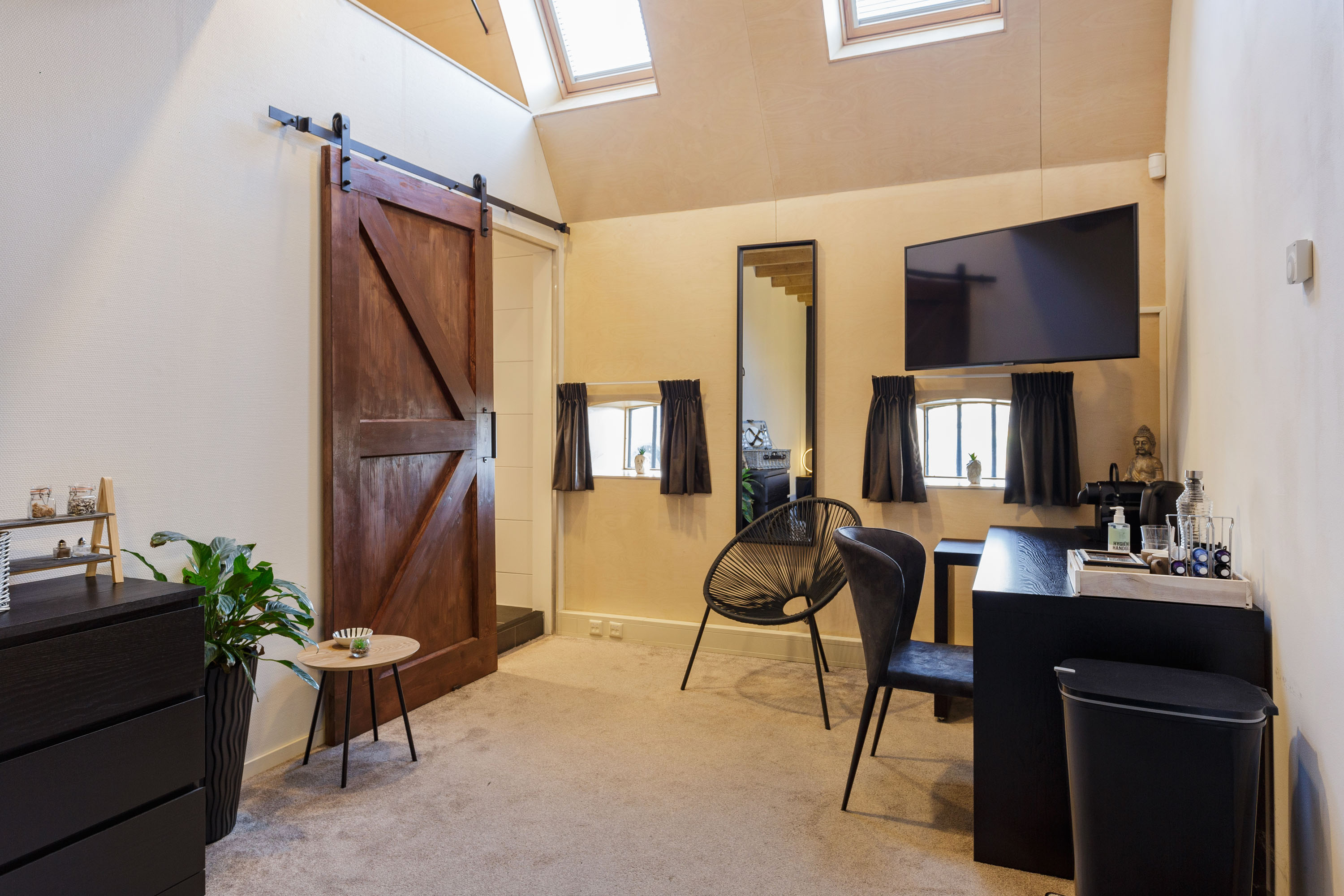 The spacious upper floor of the barn has 3 more beautiful multi-functional rooms plus a huge hobby or entertainment room, a large storage attic, a cozy bar and a fully equipped cooking studio. All in a modern look while retaining old details. The impressive roof of the barn has been beautifully renovated and panelled.