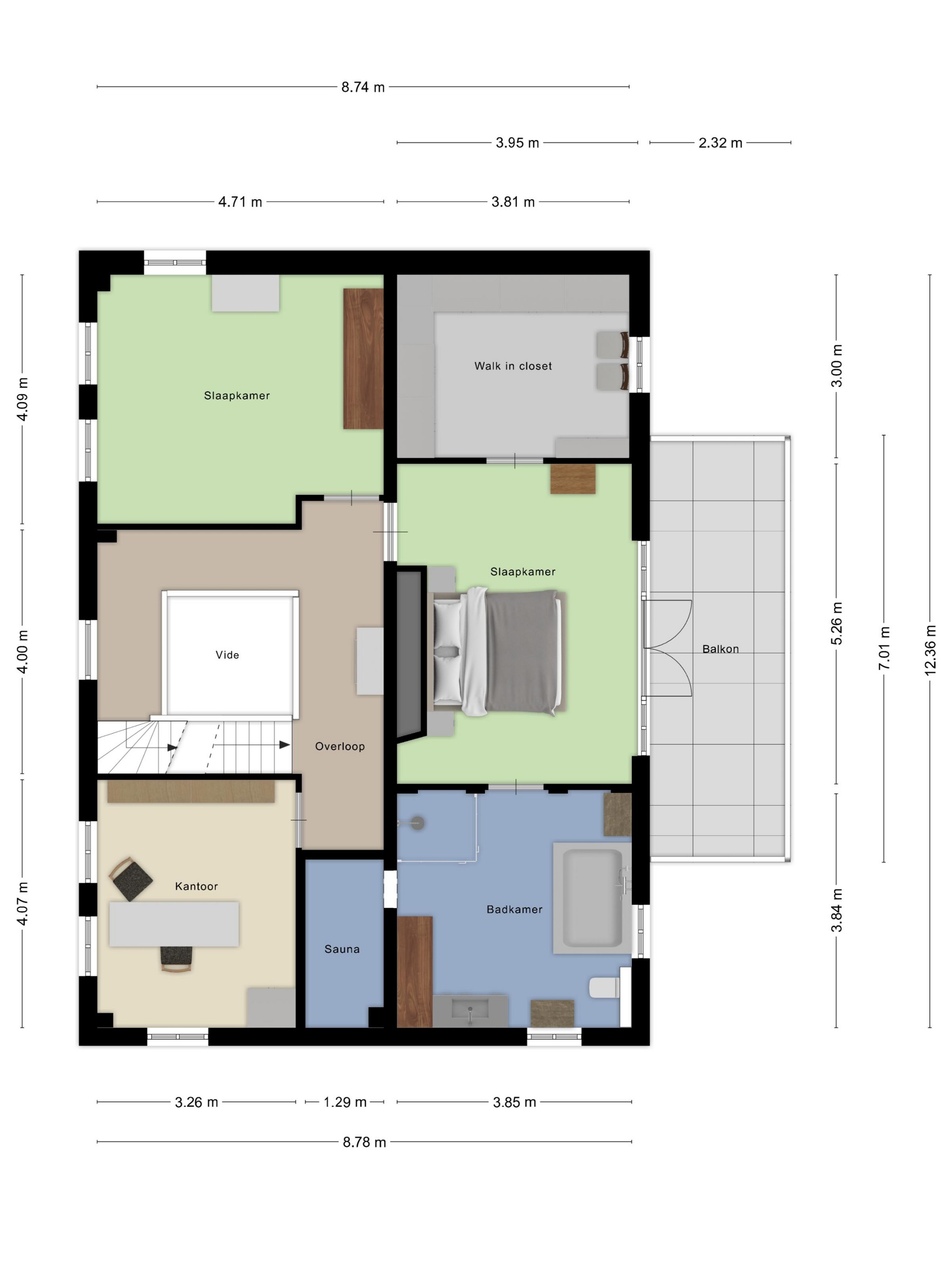slaapkamer/kantoor rechts voor (ca. 13 m²), wandafwerking stucwerk, vloer afgewerkt met tapijt, plafond afgewerkt met stucwerk;