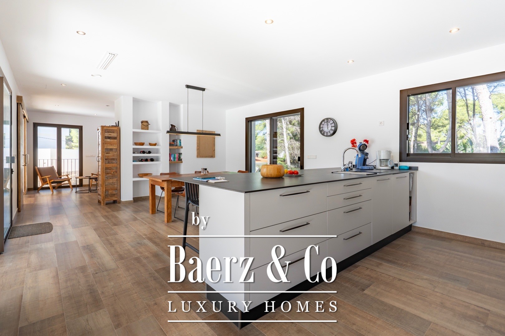 of the sea through the trees. Outside, a spacious covered terrace invites you to relax by the beautiful swimming pool. There is also a heated outdoor shower, a second covered terrace, and ample parking space for several vehicles. In less than a three-minute walk, you can reach the idyllic rocky beach of Cala Blanca, and via the coastal path, you can reach the sandy beach of El Arenal in about twenty minutes on foot, with its lively promenade full of restaurants, bars, and shops. By car, you can reach this beach in less than 5 minutes. Additionally, in the immediate vicinity, just a few minutes away on foot, you will find various restaurants, a pharmacy, a tennis club, and a small supermarket. The villa is equipped with ducted air conditioning (hot/cold), underfloor heating, a ventilation system, double glazing, electric shutters, and photovoltaic solar panels. It is the ideal villa for those seeking luxury and comfort just a stone's throw from the beach!