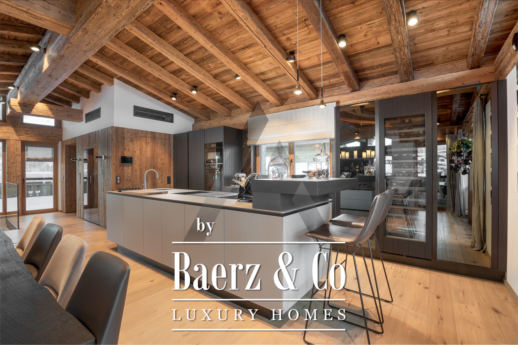 Chalet Kirchberg in Tirol presents an interplay of architecturally refined Alpine living and contemporary design. This property, built in 2018, extends across 312 m² and rests on a gentle slope at the edge of the iconic village, with direct proximity to both the ski slopes and the tranquil Spertental valley. In this chalet, generous spaces invite quiet retreat or convivial gathering, anchored by a vast living, dining, and kitchen area, all framed by exposed reclaimed wood beams and an open stone fireplace. A chef’s kitchen equipped with BORA, teppanyaki grill, Miele appliances, deep fryer, and Liebherr wine cabinets anticipates both culinary craft and simple comfort. Wraparound balconies, partly covered, open the interiors to southern and northern mountain panoramas, ensuring abundant natural light throughout the year.