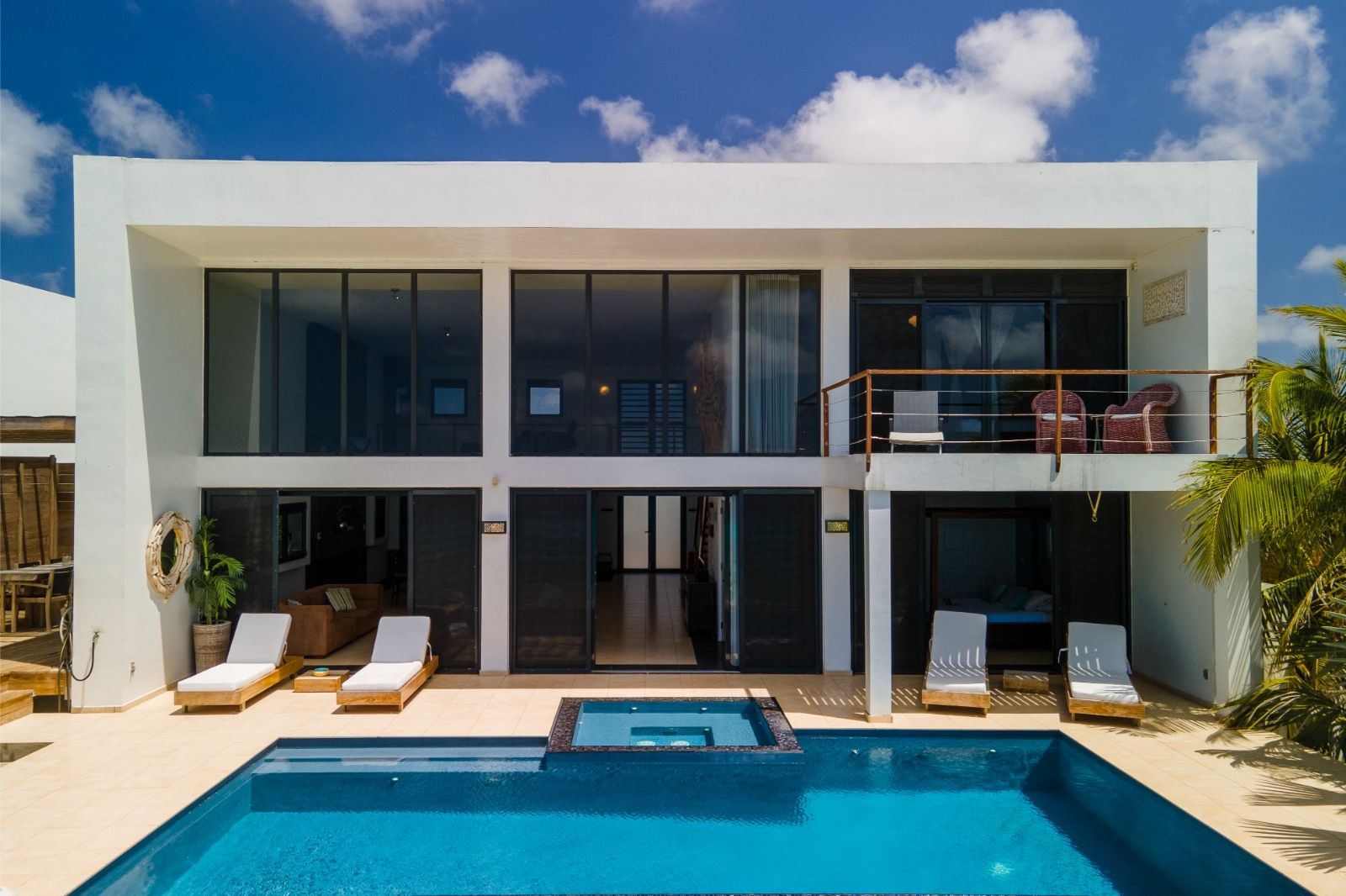 Large sliding doors open directly onto the terrace with a private swimming pool and jacuzzi, where you can enjoy panoramic views of the Caribbean Sea. The outdoor area offers multiple seating and lounge areas, making it perfect for entertaining or simply relaxing while enjoying unforgettable sunsets. Stairs lead directly from the terrace down to the beach and ocean, where you can experience the crystal-clear waters right at your doorstep.