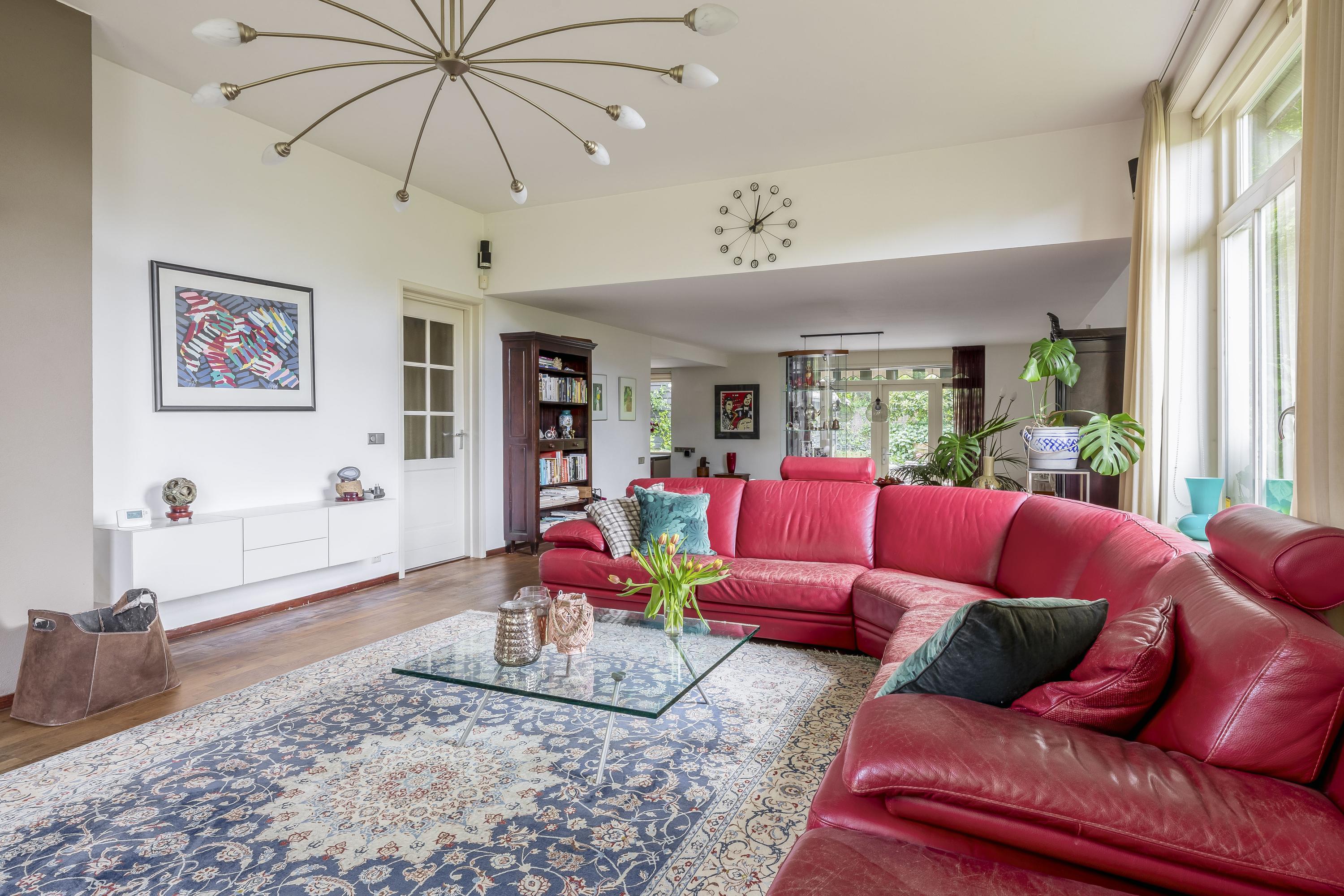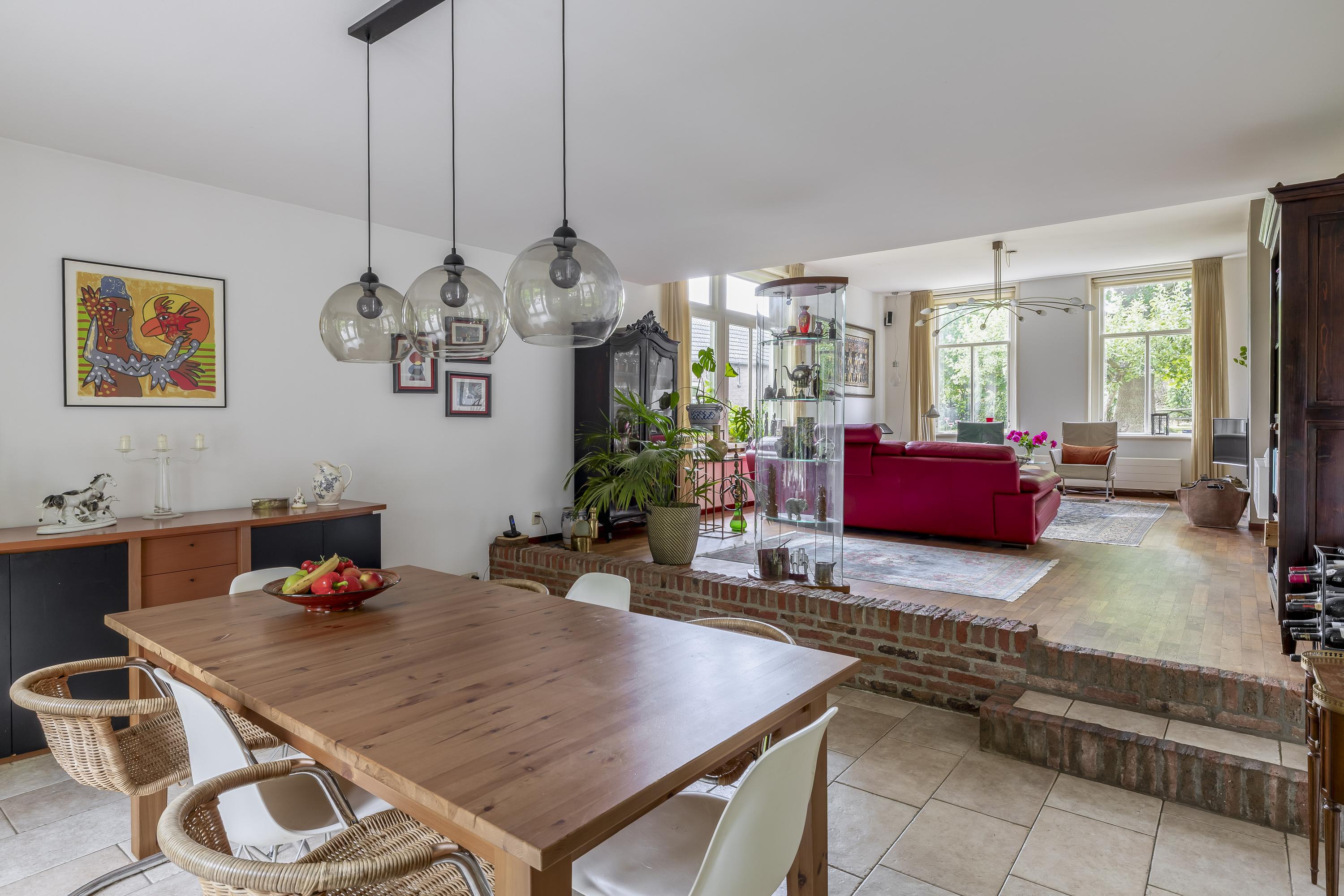 The house has a charming side entrance and an additional entrance at the front. From the hallway with cloakroom and toilet, you walk into the office—a bright and pleasant space with original sliding windows and carpeted flooring. The generous living room features a cozy open fireplace (a wood stove with a renewed flue) and seamlessly flows into the dining area, which has double French doors opening onto the sun-drenched garden.