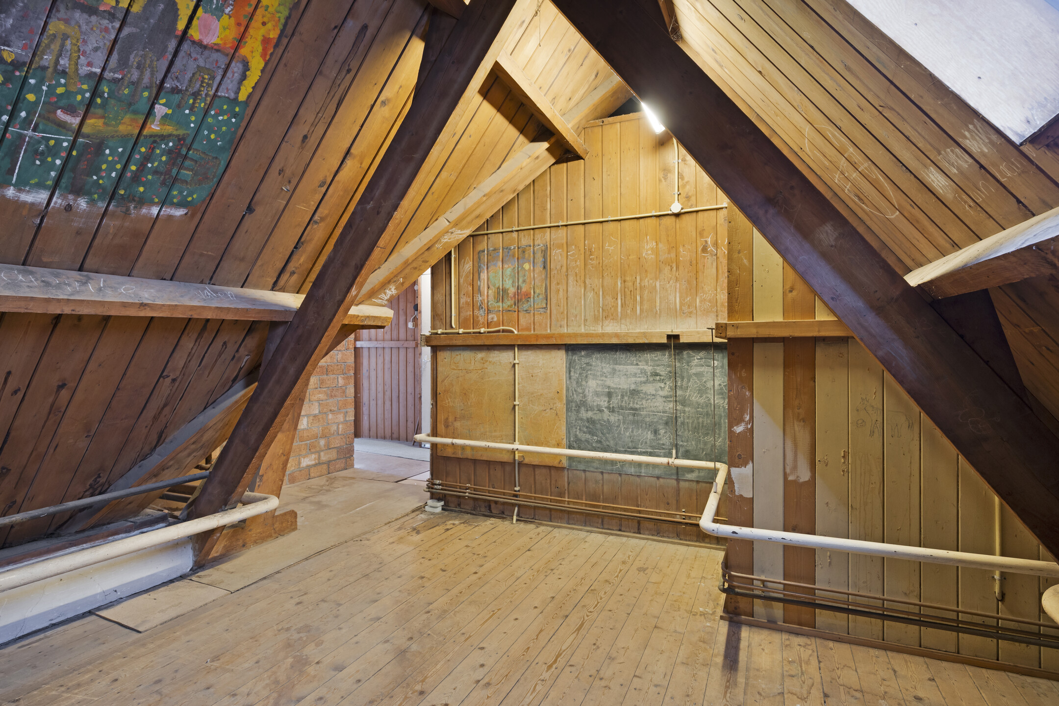 The ground floor reveals a stately entrance hall, where stained glass, original paneling and a central staircase connect all principal rooms. The L-shaped living room features a hearth and garden access, while the rear kitchen and adjacent utility space open directly to the garden, designed for gatherings and ease. Seven bedrooms span the upper levels, including rooms with direct access to a broad roof terrace and a playful attic arrangement with varying rooflines.