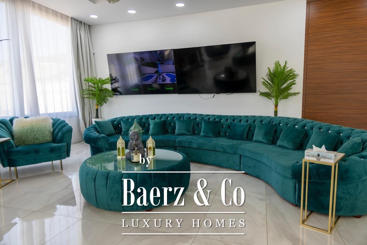Crafted with elevated ceilings and fluid spatial transitions, the villa is arranged across two principal floors plus a full basement. Seven bedrooms are distributed for privacy and comfort, with five en-suite master suites, a guest room and separate housekeeper’s accommodation. Living spaces are defined by natural light and curated furnishings, underscored by premium finishes and a purposeful layout. Integrated smart home automation, underfloor heating and a VRV climate control system approach modern convenience with understated precision. A private cinema room and full CCTV security further express a discreet take on elite living.