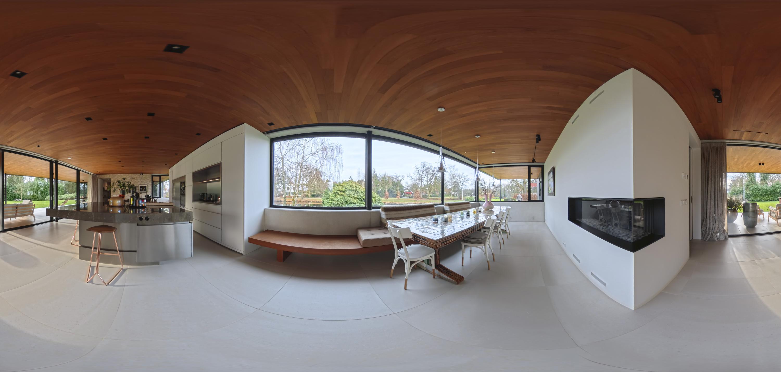 The kitchen (88 m²) forms the heart of the house. From this room, the view is impressive at both the front and rear. Floor-to-ceiling windows and sliding doors connect the kitchen directly to the covered terrace, which is furnished with a sitting and dining area and an outdoor fireplace by Metalfire. The terrace is the family's favourite spot; in winter it is a sunny place due to the low light incidence and in summer it is a pleasant lounge area in the shade and shelter. Thanks to the canopy and the outdoor fireplace, this is a place where you can comfortably spend most of the year.