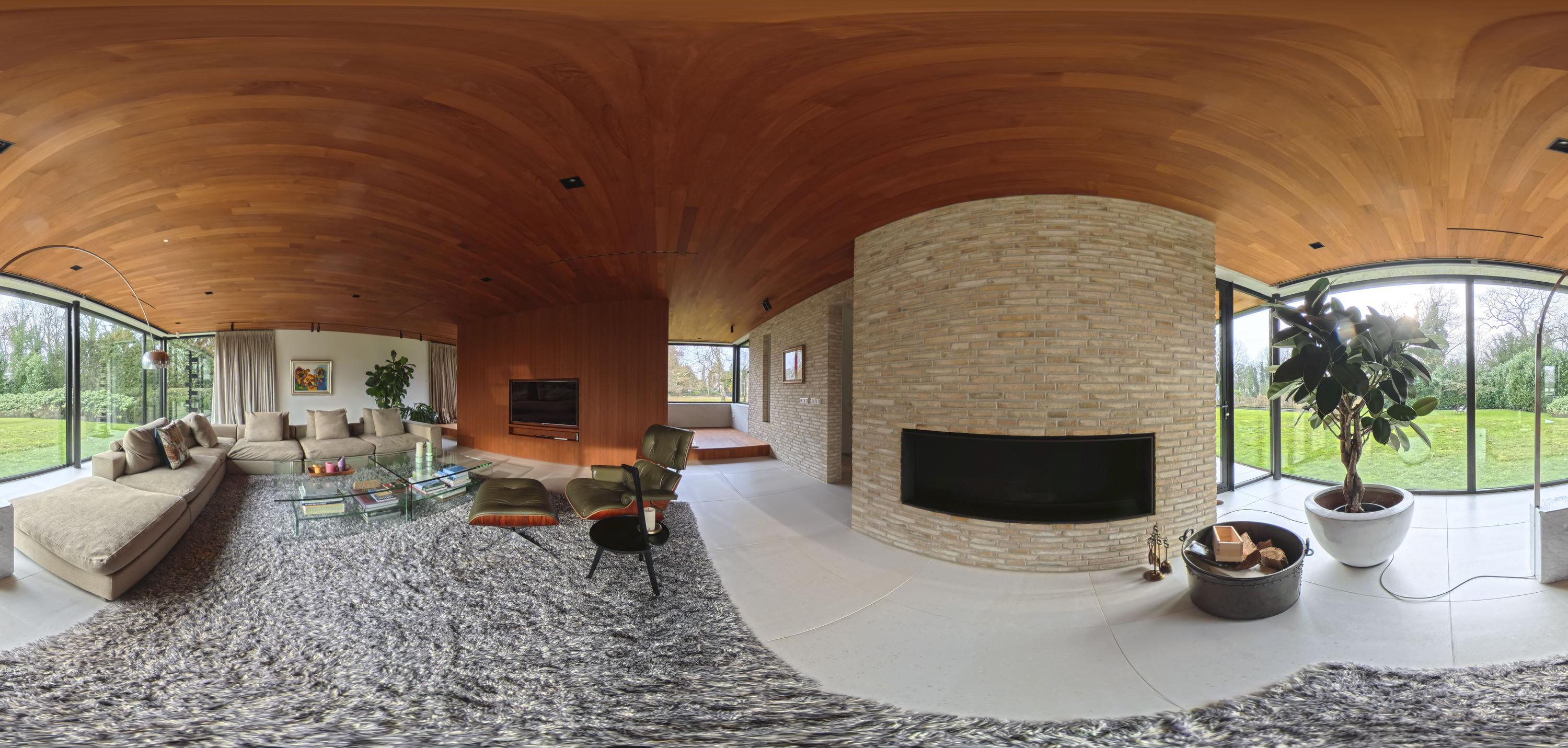 The living room (74 m²) is spacious and divided into two seating areas by a room divider with an integrated television and bookcase. At the rear, floor-to-ceiling windows offer views of the garden, while at the front, the ponds come into view, with sufficient privacy thanks to the half-height parapet. A wide Metalfire fireplace and a raised teak floor area at the front give the room extra character. The sophisticated lighting plan ensures that art and architectural lines are shown to their best advantage.