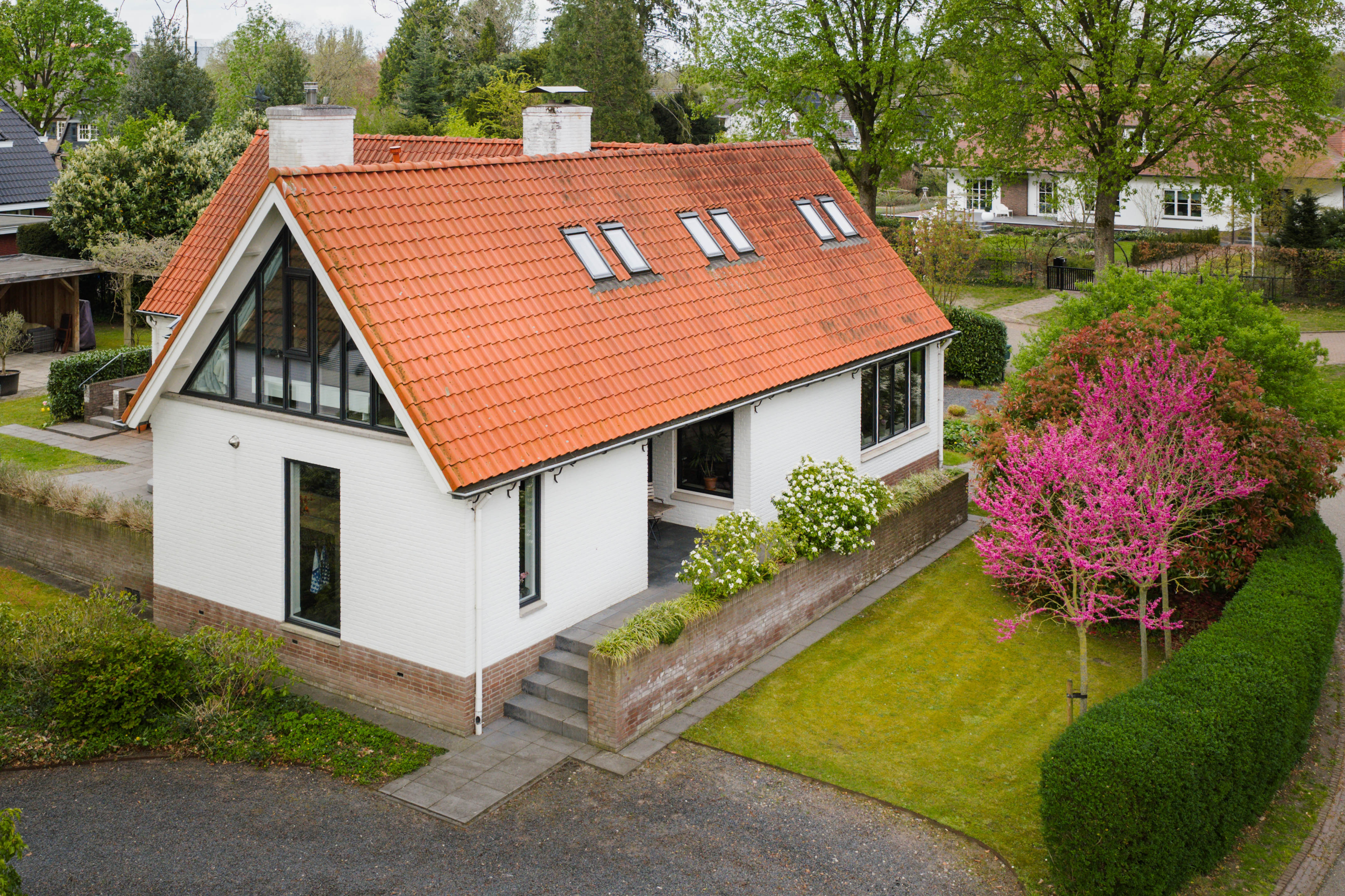 In the highly sought-after Berkeloord area, close to the Berkel river and within walking distance of the Hertenkamp, the Enk and the Lochemse Berg, you will find this impressive villa. Built in 1947, the house offers a generous living area of 215 m² and is set on a spacious plot of 1,755 m². The white façades and red tiled roof give the property a timeless, classic appearance.