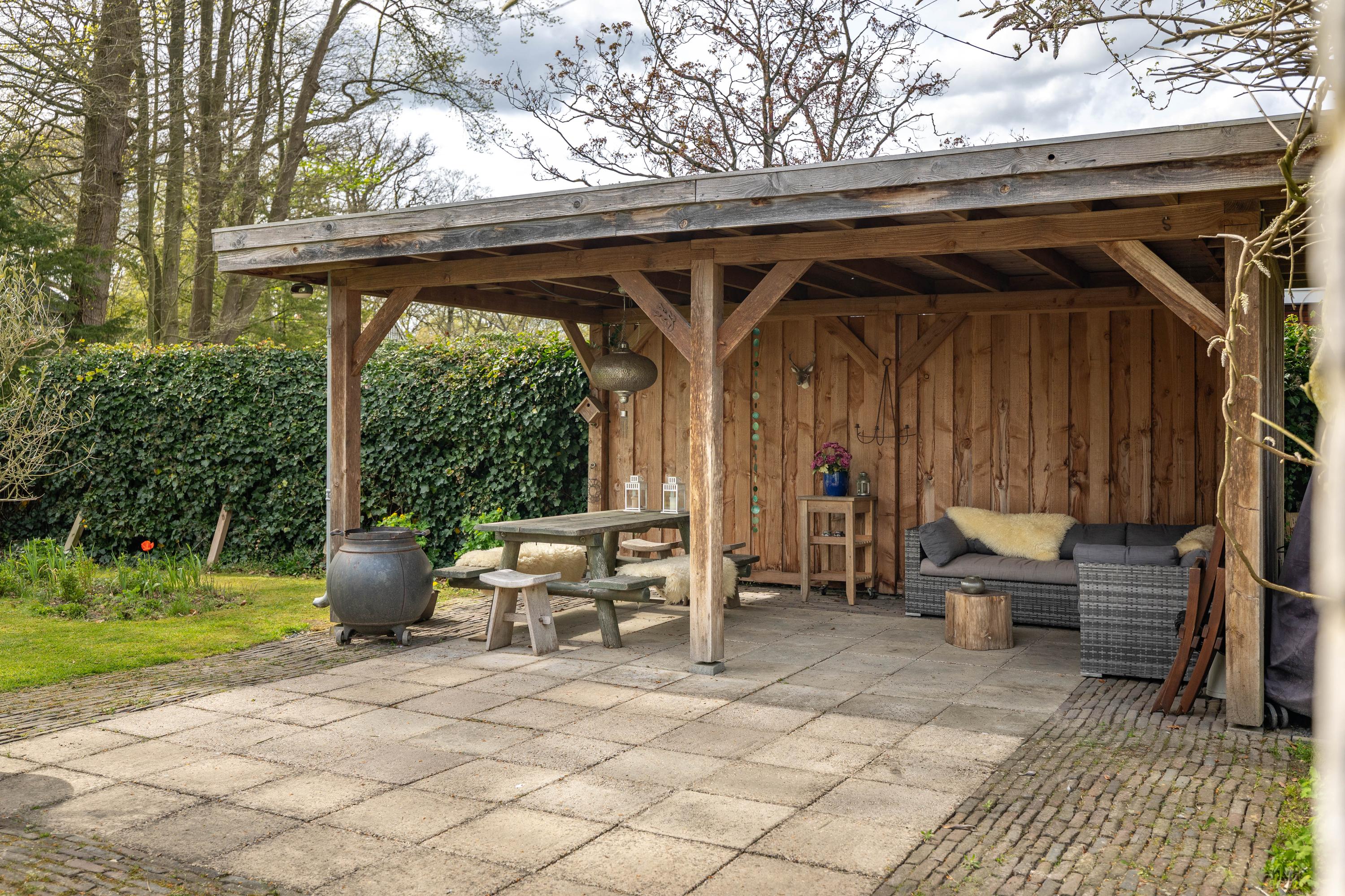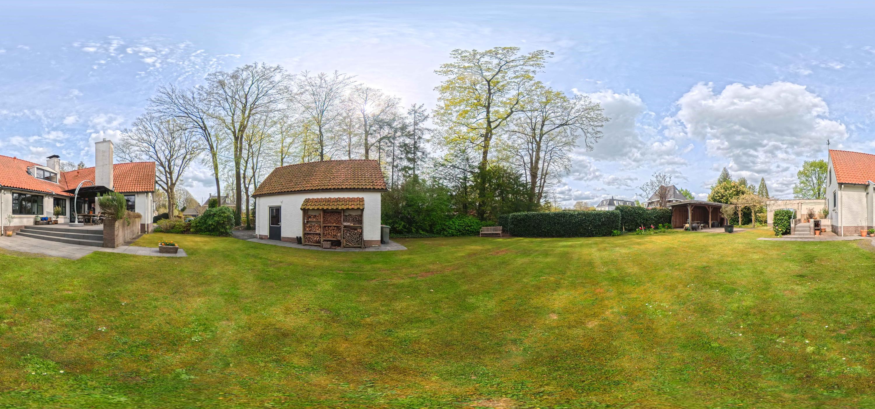 At the rear of the house lies a wonderful garden with expansive lawns, large laurel hedges, beautifully landscaped borders and attractive terraces. One terrace behind the kitchen features a charming outdoor fireplace, providing a delightful setting for long summer evenings with family and friends. There is also a cosy veranda with a large terrace and ample space for a lounge set.
