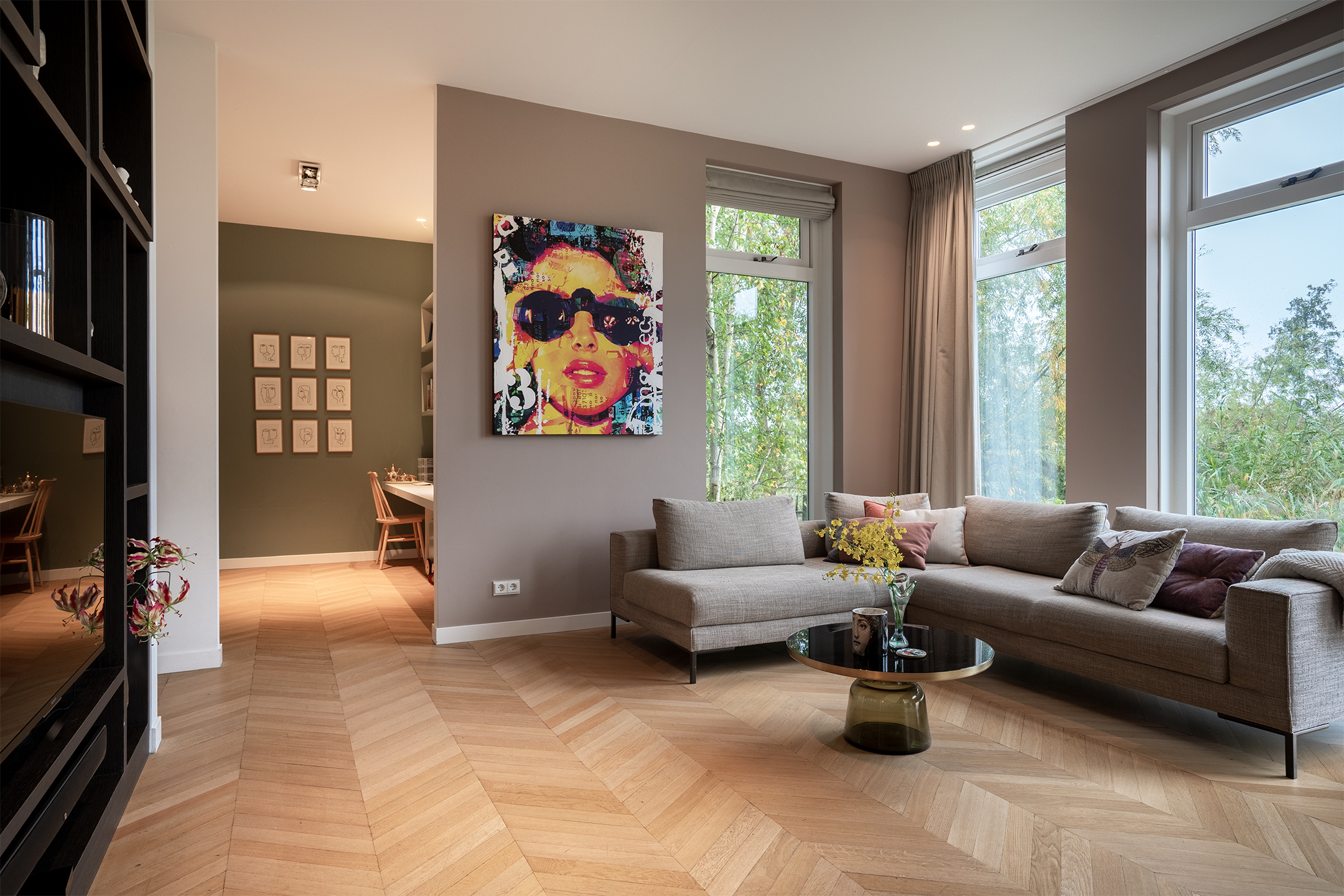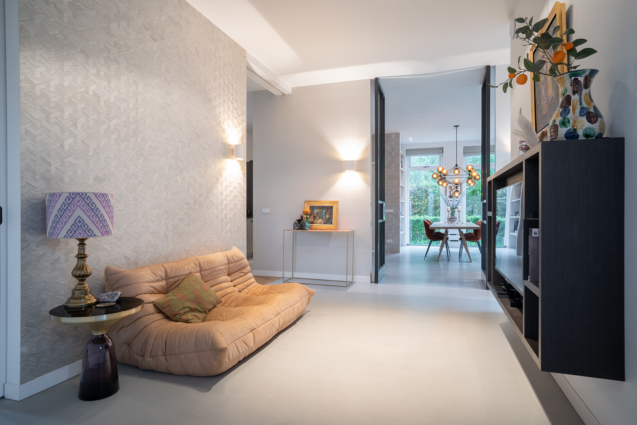 The double garage and wide tiled path lead to the stately front door. The bright, modern hall, featuring luxurious design elements, forms the heart of the home. To the right is the spacious living room, divided into two attractive seating areas by an elegant partition with large white sliding doors. On the sheltered side is a designer concrete floor that continues into the kitchen, and on the other side is a beautiful Hungarian point floor.