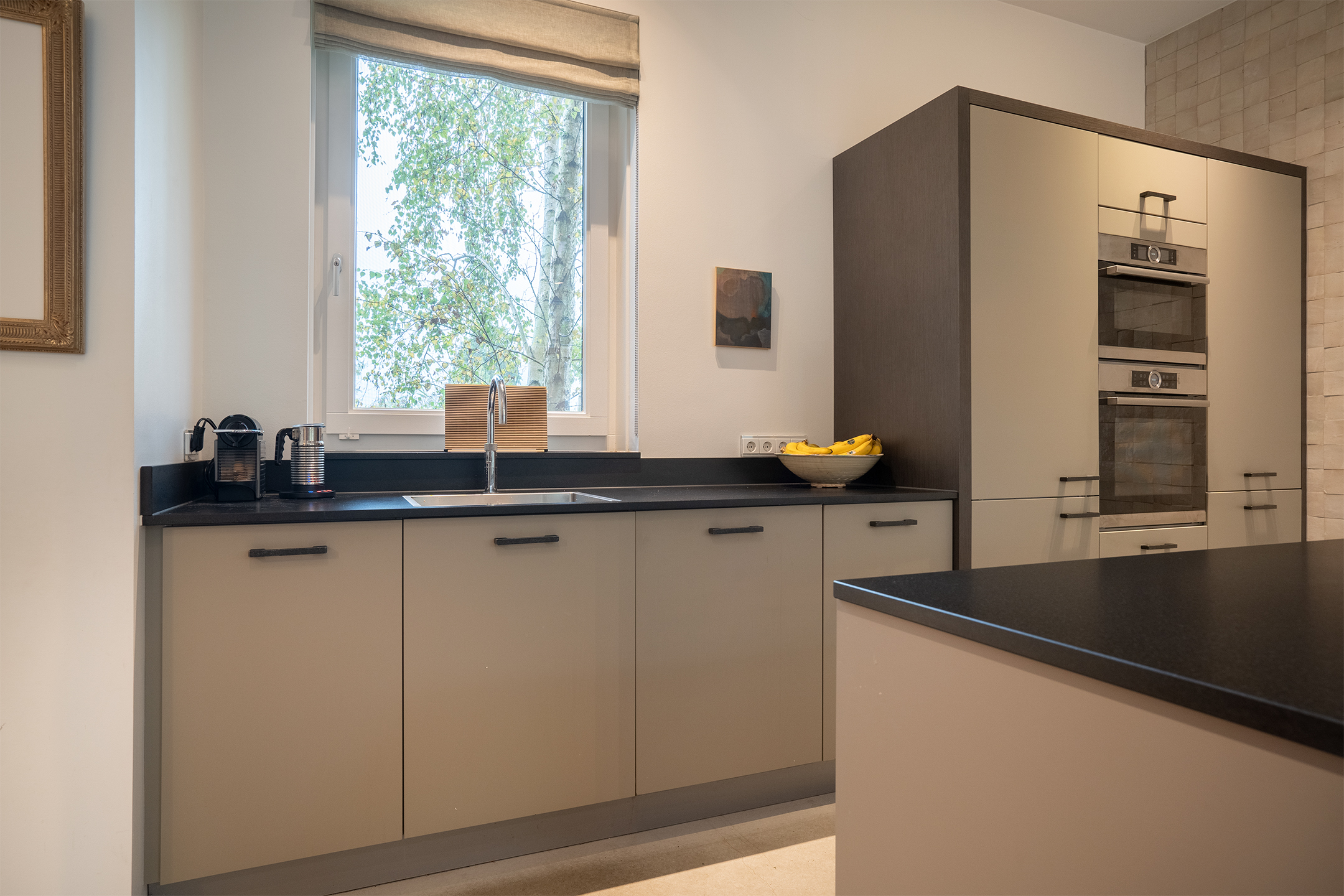 Adjacent to the living room is a spacious study with built-in cupboards and Hungarian point flooring. Opposite the study is the open-plan kitchen with adjoining dining room. The sleekly designed kitchen in shades of gray is a paradise for cooking enthusiasts and features a cooking island/bar, induction hob, extractor hood, wine cooler, two ovens, refrigerator with 0-degree drawers, and a dishwasher. The many windows provide an abundance of natural light, which is further emphasized by light walls and natural materials.