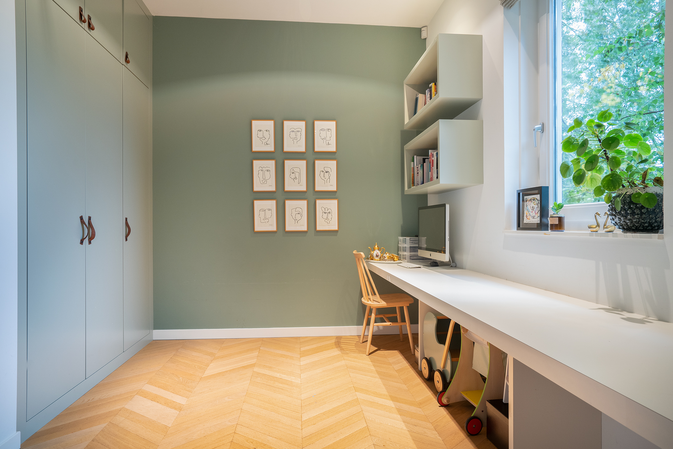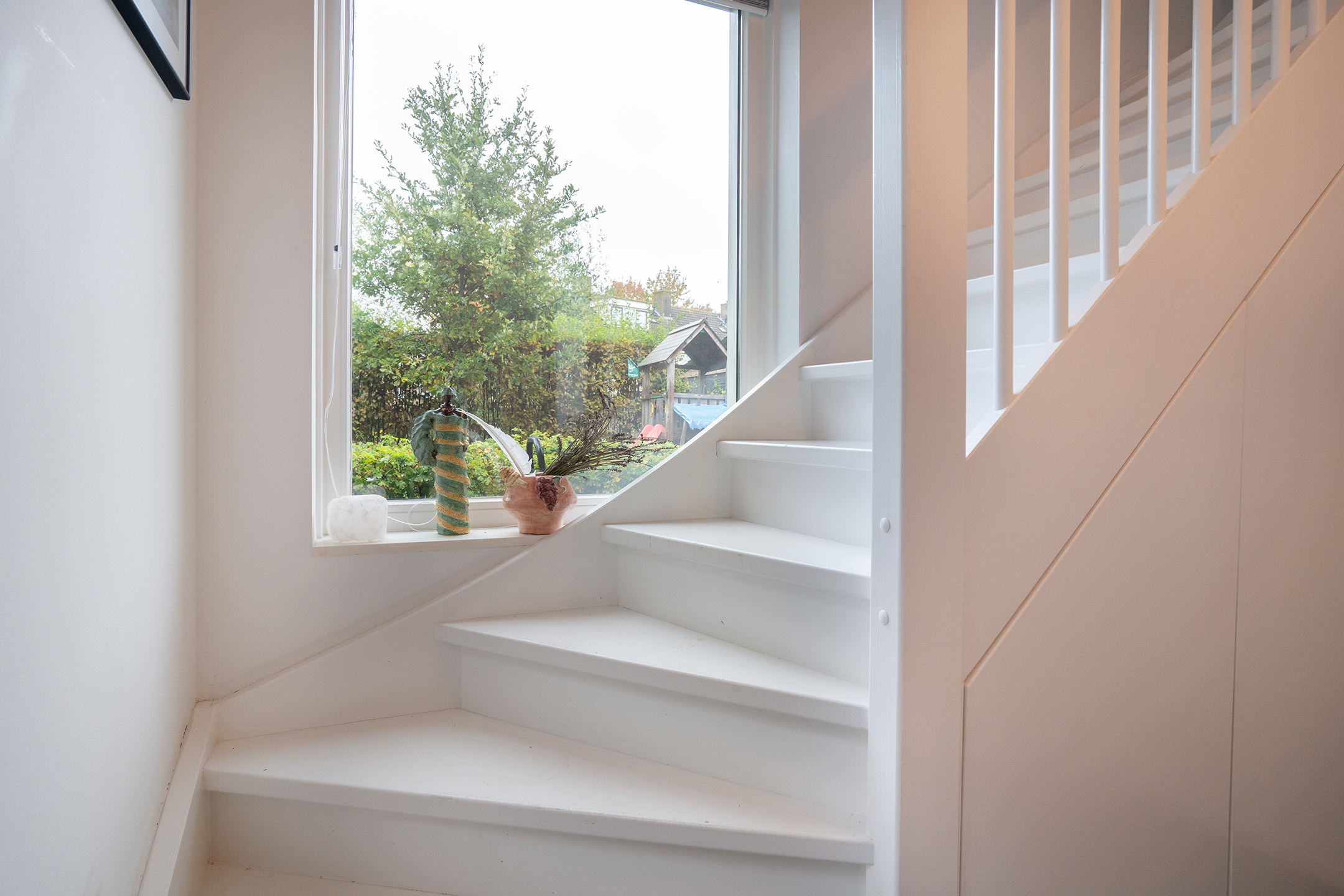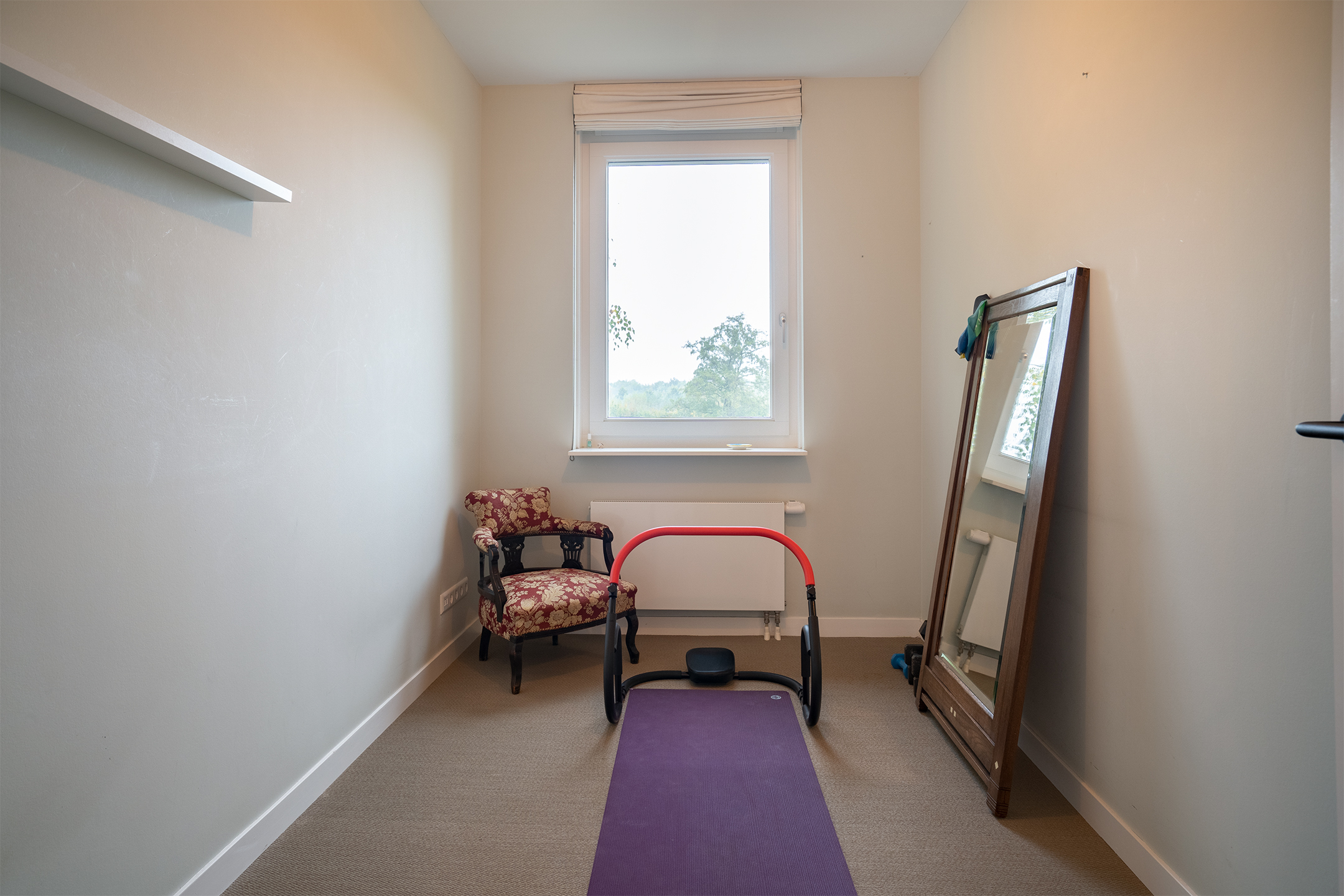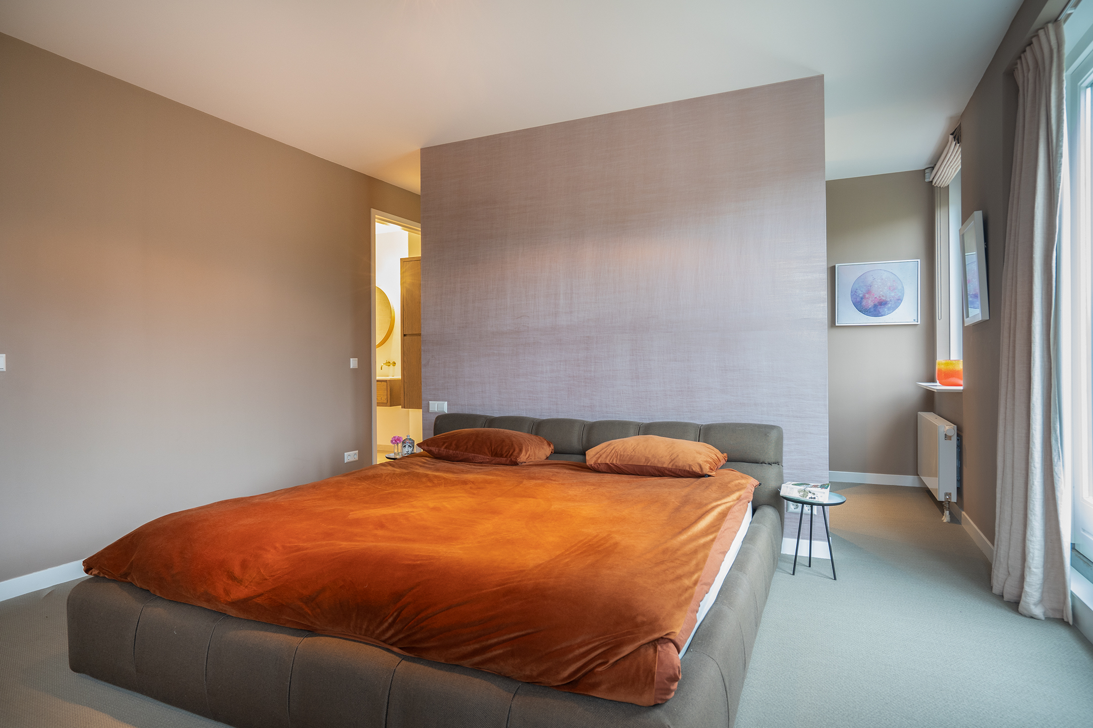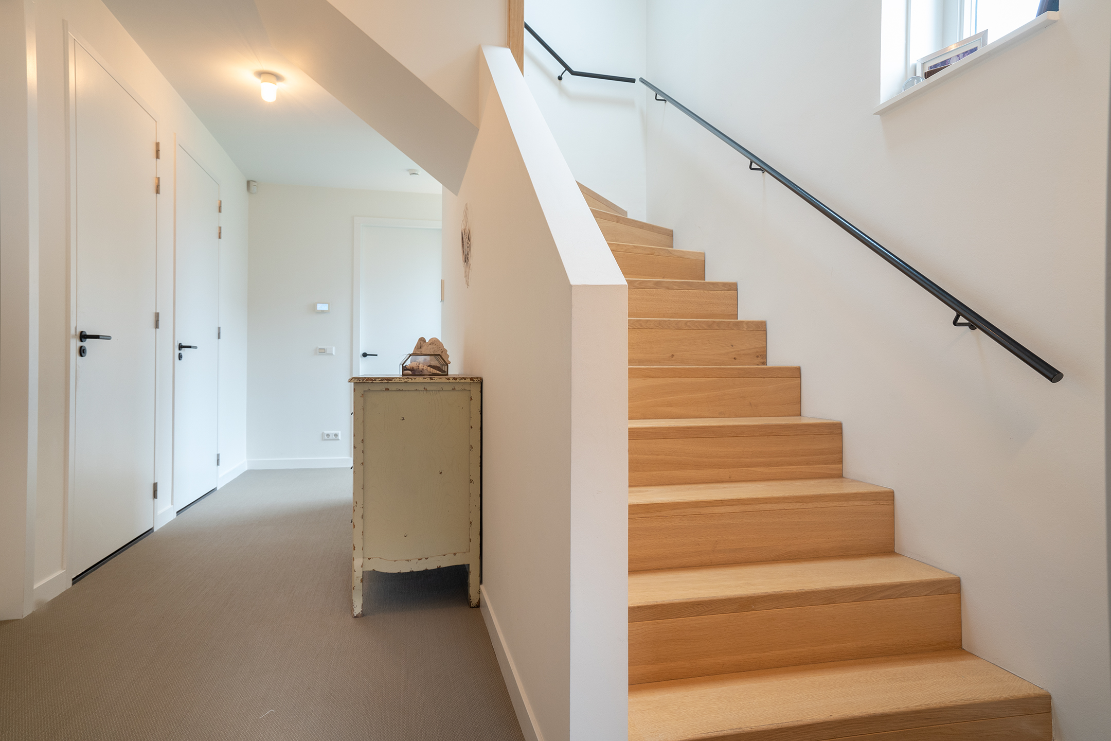 A fixed wooden staircase leads to a spacious landing with five doors: two bedrooms, a separate toilet, a luxurious bathroom, and the master bedroom. The latter is very spacious and not only has access to the large balcony, but also has a partition wall behind which a walk-in closet has been created. You will also find an extra door to the bathroom next to the walk-in closet, which makes it partly ensuite. The balcony, like the windows, faces east, making it a very sunny spot, especially early in the day. The master bedroom is equipped with air conditioning.