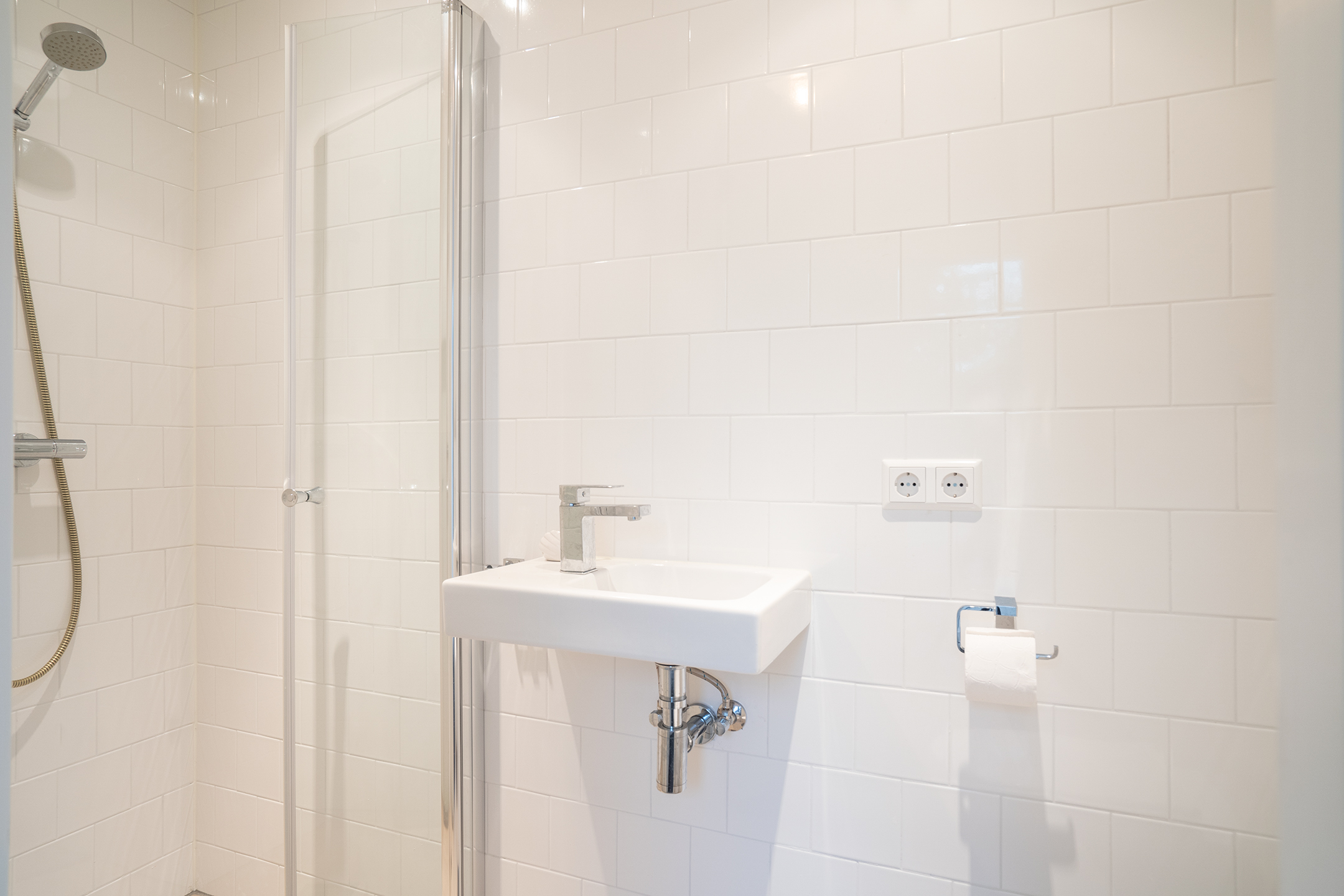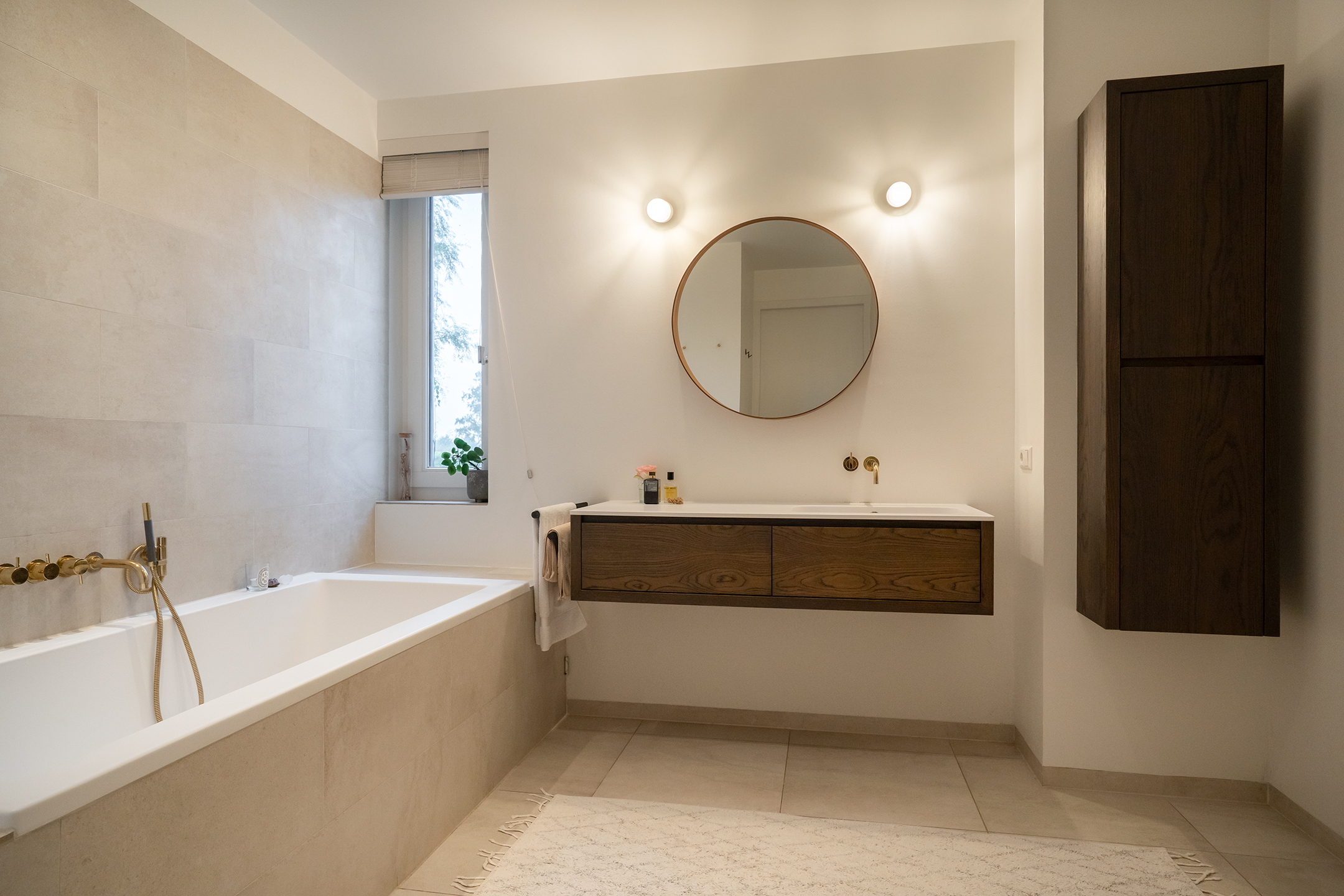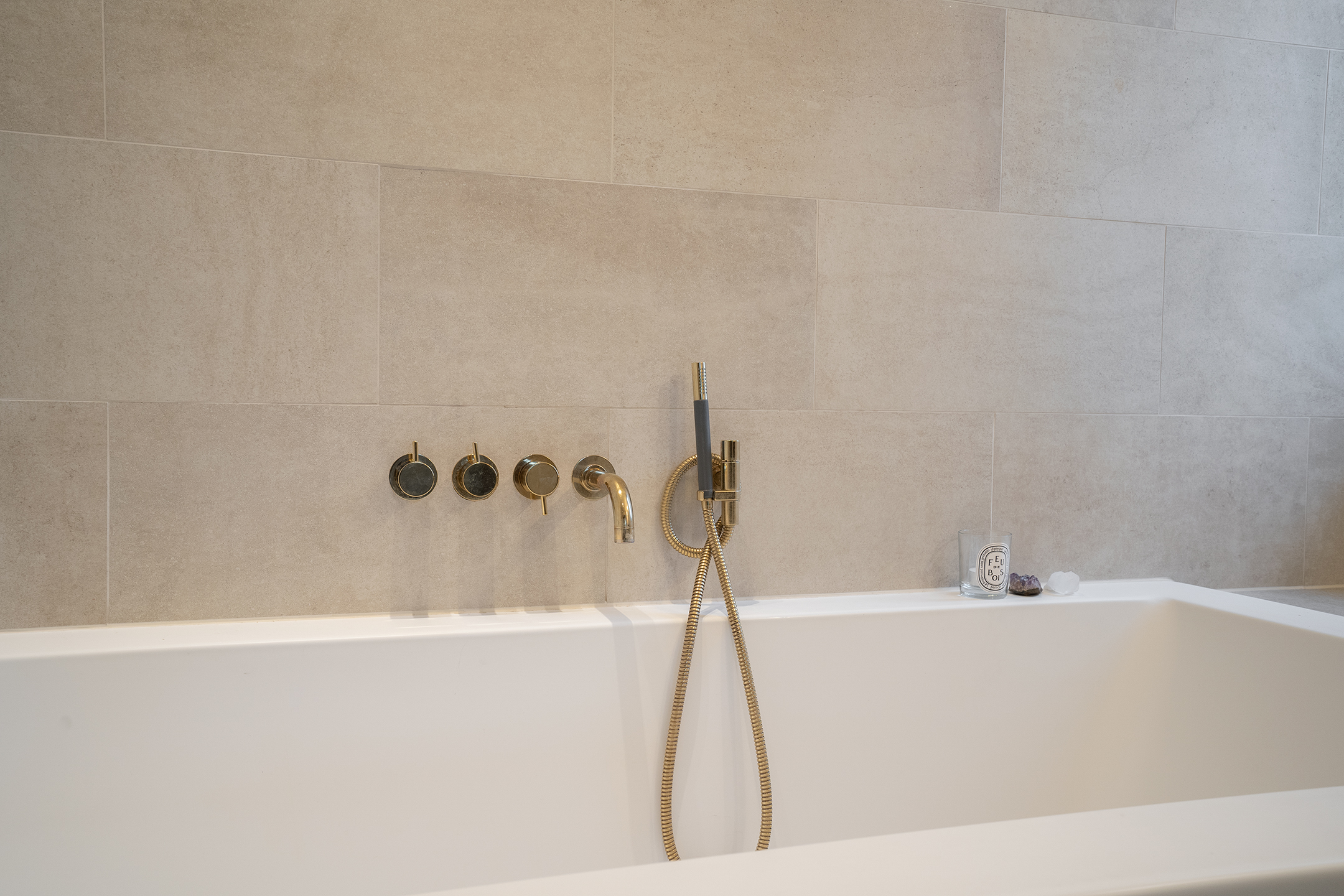 The adjoining bathroom is also very spacious and has a sleek finish. With sleek white walls and large light gray tiles on the back wall of the bathtub and walk-in shower as well as on the floor, it also looks very luxurious. The bathtub is spacious and the shower has both a handheld and rain shower, both of which are gold-plated VOLA taps, as are the other taps. There is also a long, rectangular sink in a wooden design cabinet.