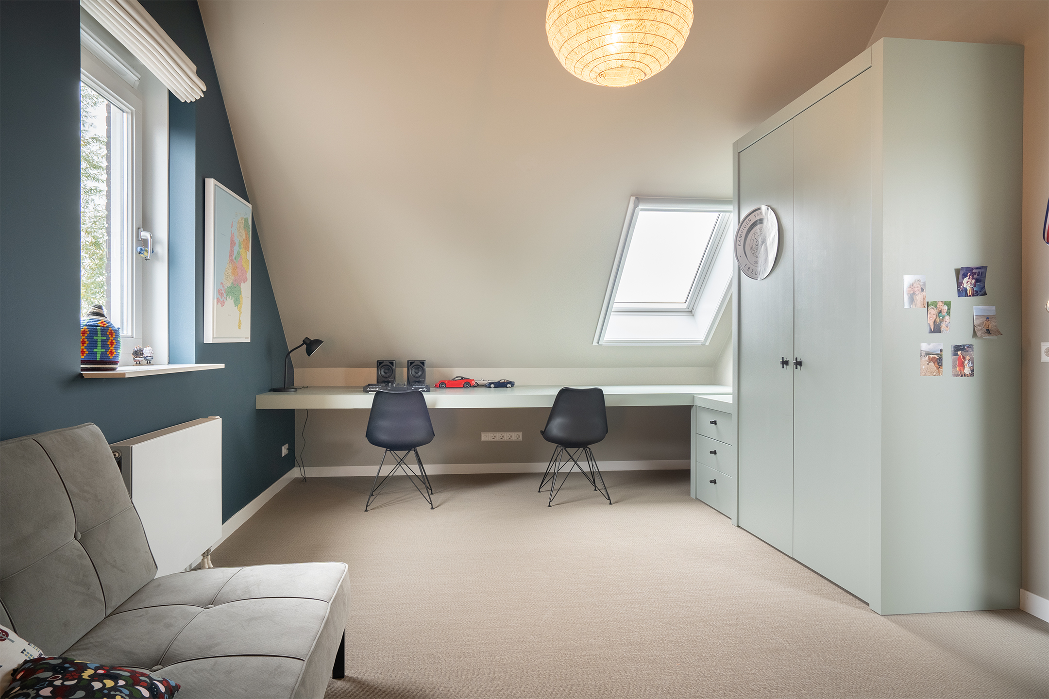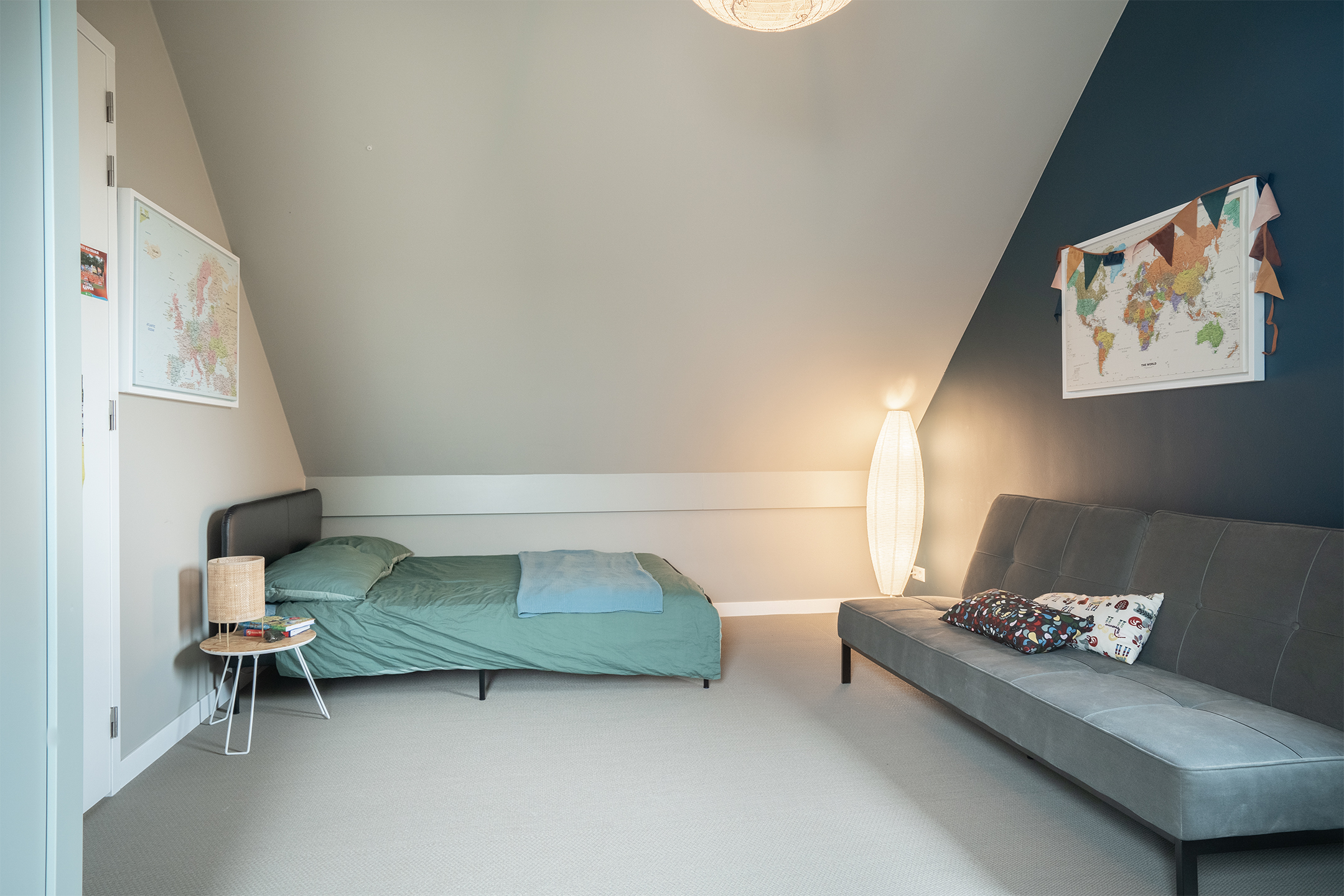 Here, too, the bedrooms are located at the front and rear, resulting in two very spacious rooms. In addition, the roof only starts above knee height, which means that despite the sloping roof, there is still plenty of living space.