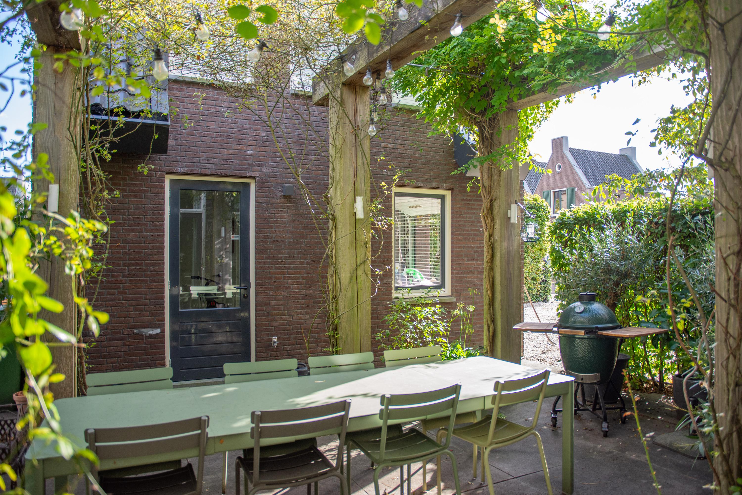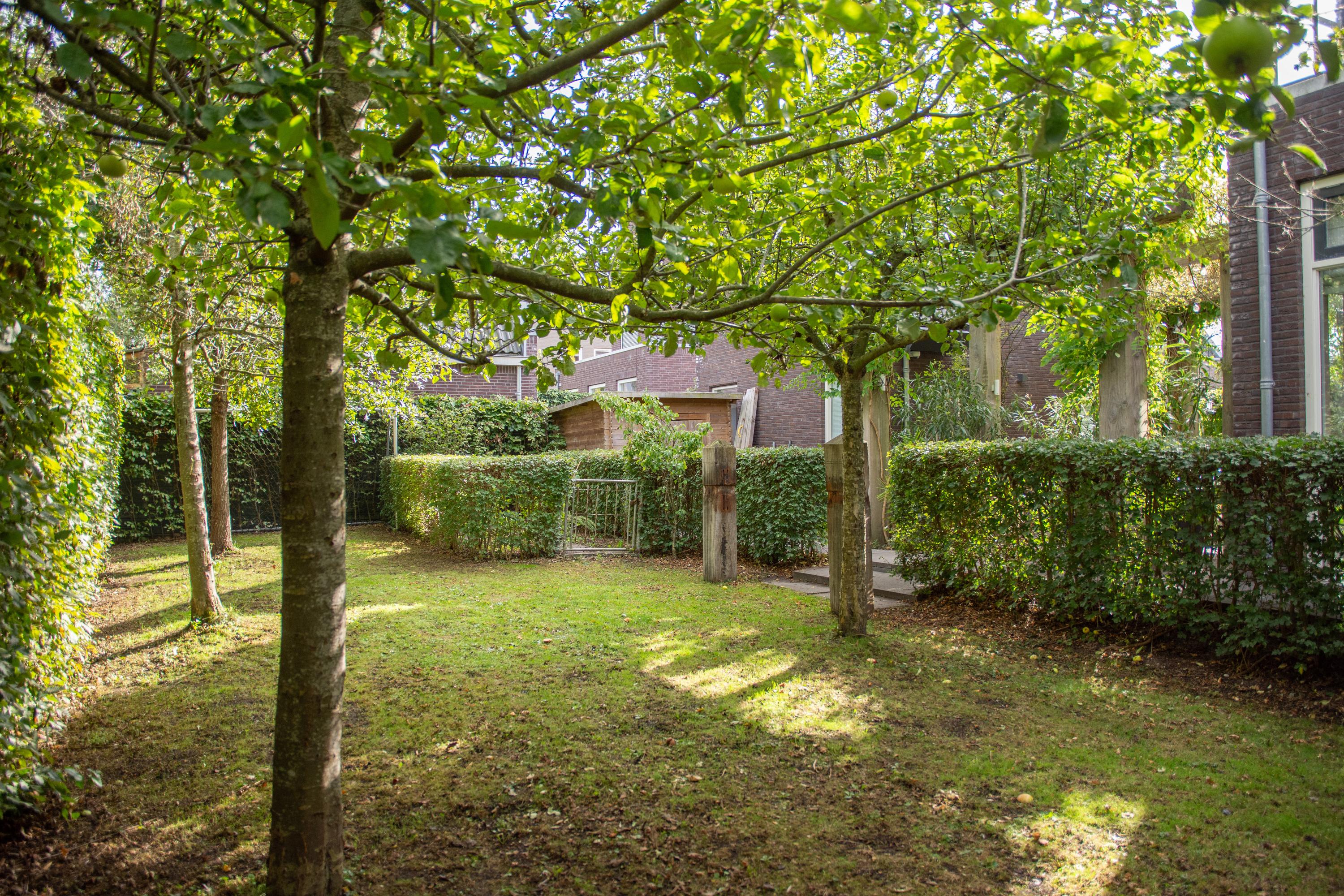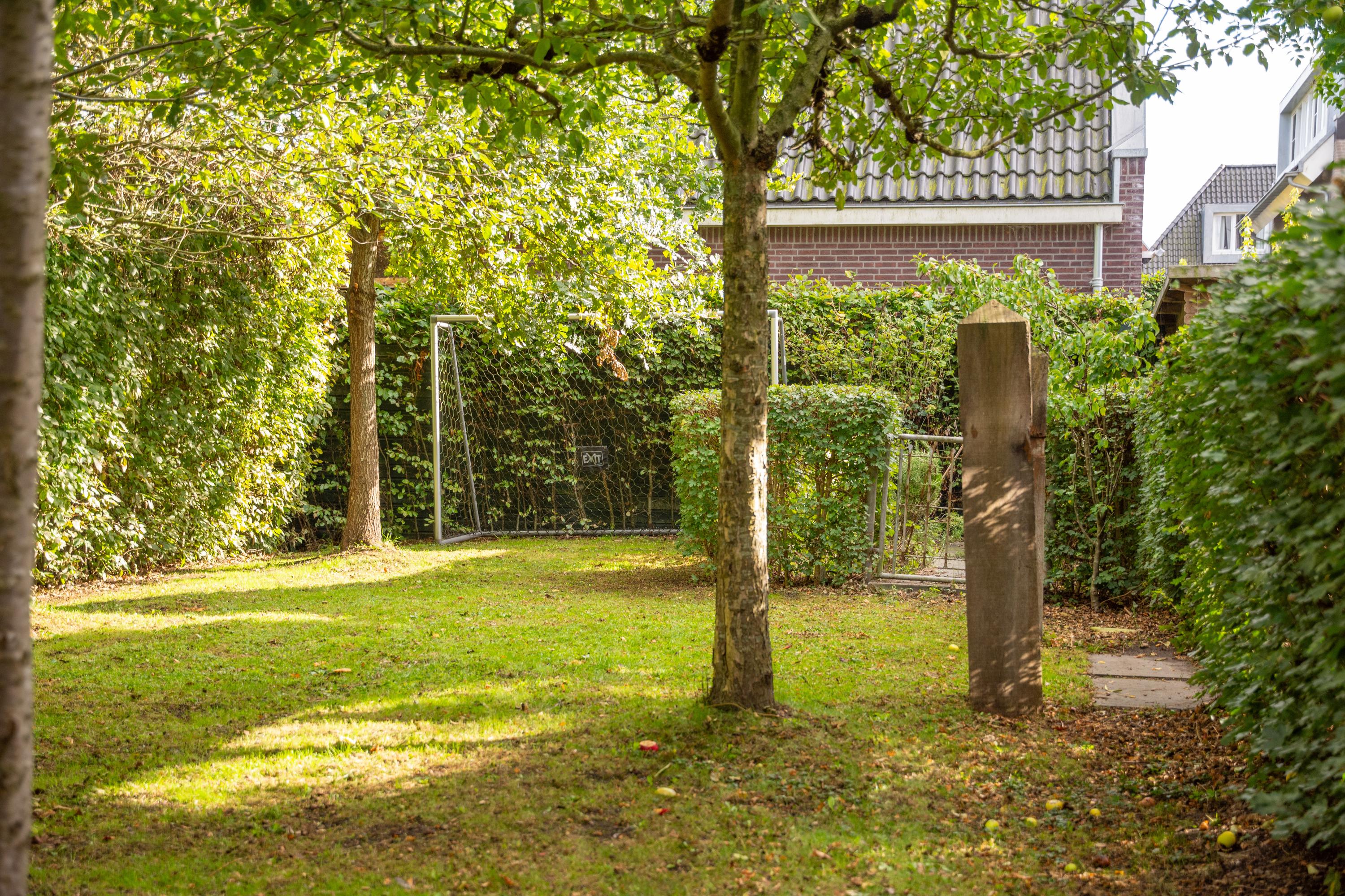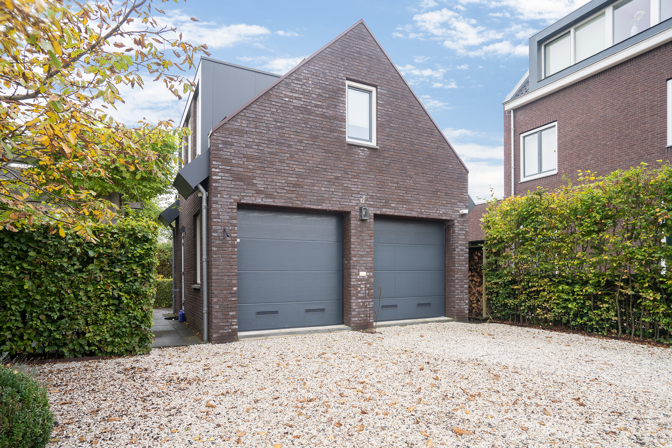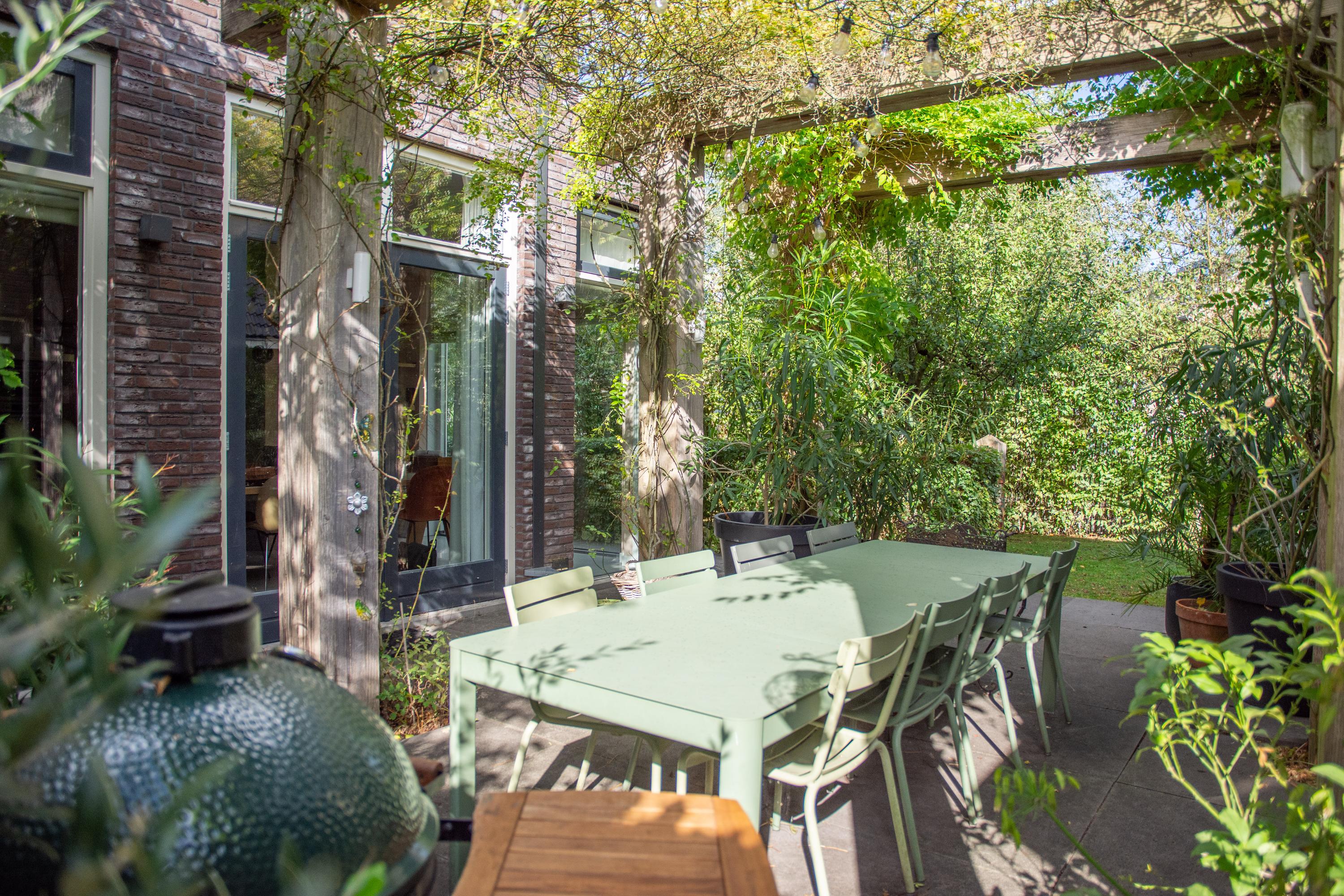 The house is surrounded by a beautifully maintained garden with a lawn, surrounded by trees and a neat hedge. Between the house and the garage is a tiled terrace with a sturdy, overgrown pergola where you can sit outside in style.