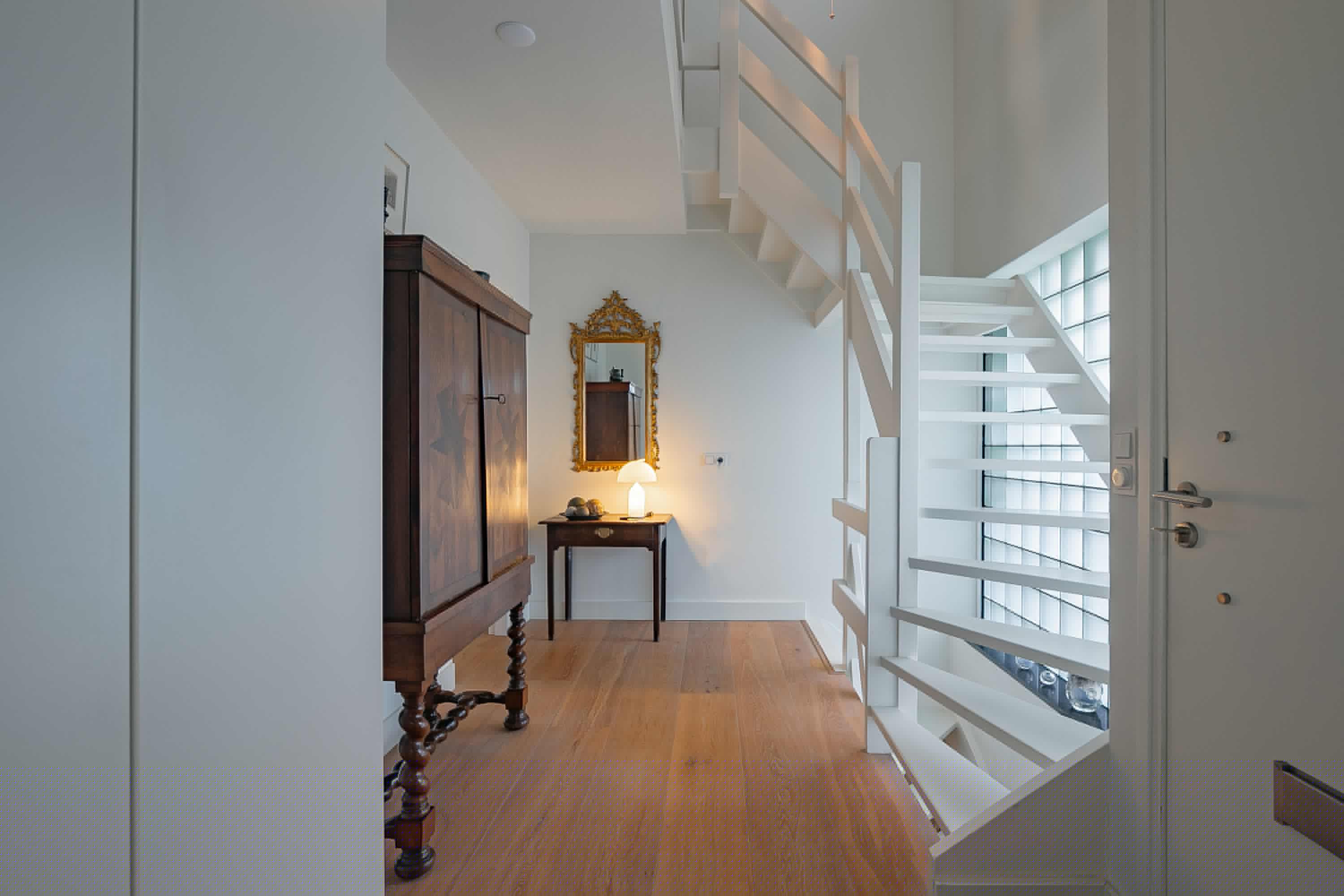 Through the representative entrance with a stylish wardrobe, open loft and access to the guest toilet with wall-mounted toilet and washbasin, the meter cupboard and the bright, spacious living room (approx. 68m²). The living room has an attractive Faber gas fireplace that is serviced annually and provides extra warmth and atmosphere on cold days. The designer radiators and beautiful parquet flooring add extra style to the room.