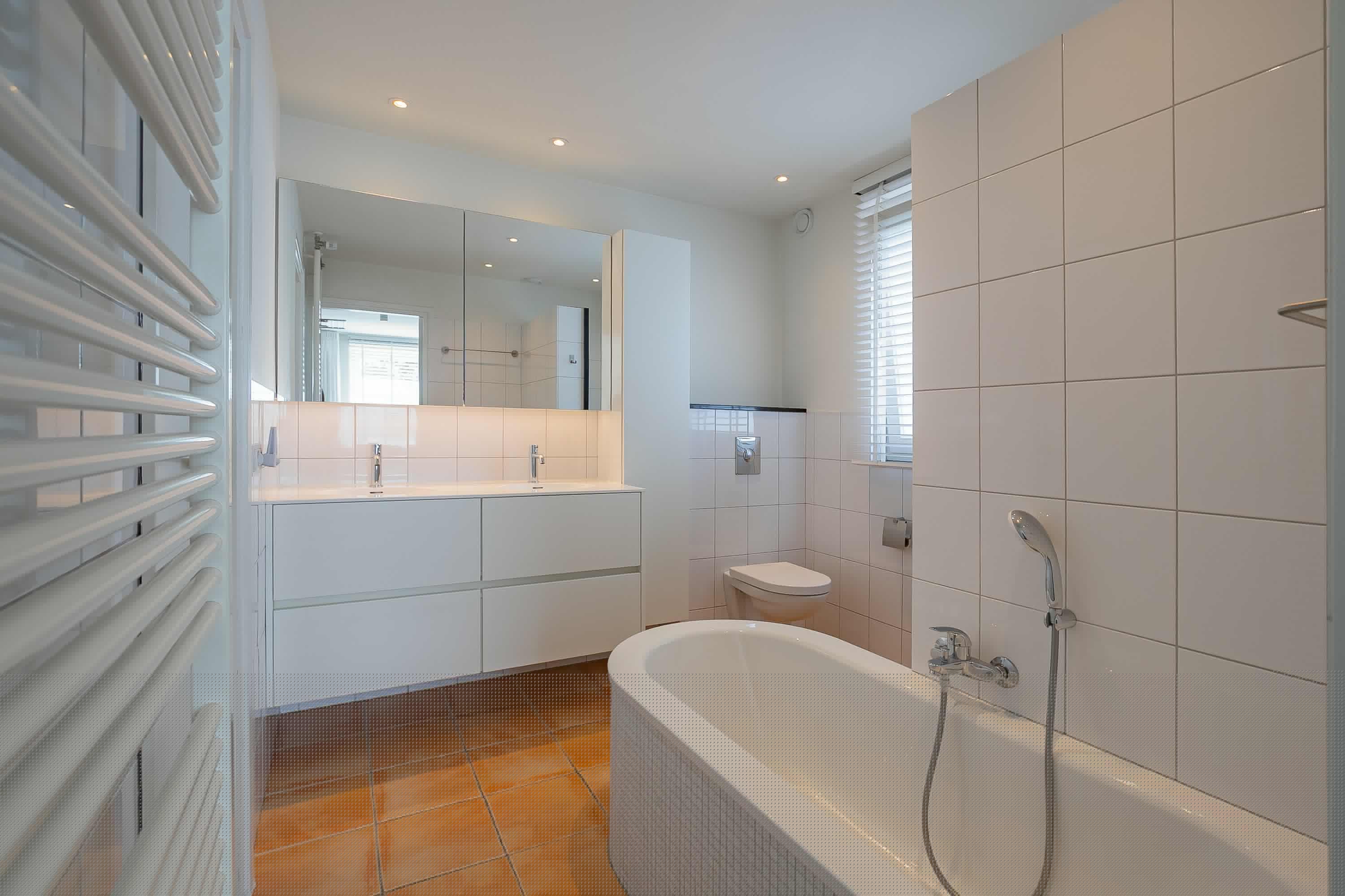The spacious passage leads to four comfortable bedrooms (approx. 6.7, 8.5, 11.5 and 14.5 m²). The walk-in closet room and the office are equipped with custom-made, stylish built-in cupboards from Slangen Interieurbouw. The other rooms are also practically furnished. The bathroom features mechanical ventilation and is equipped with a bathtub, a walk-in shower, a double sink, and a wall-mounted toilet. All rooms have aluminium window frames with HR++ glazing and are stylishly fitted with mosaic parquet flooring.