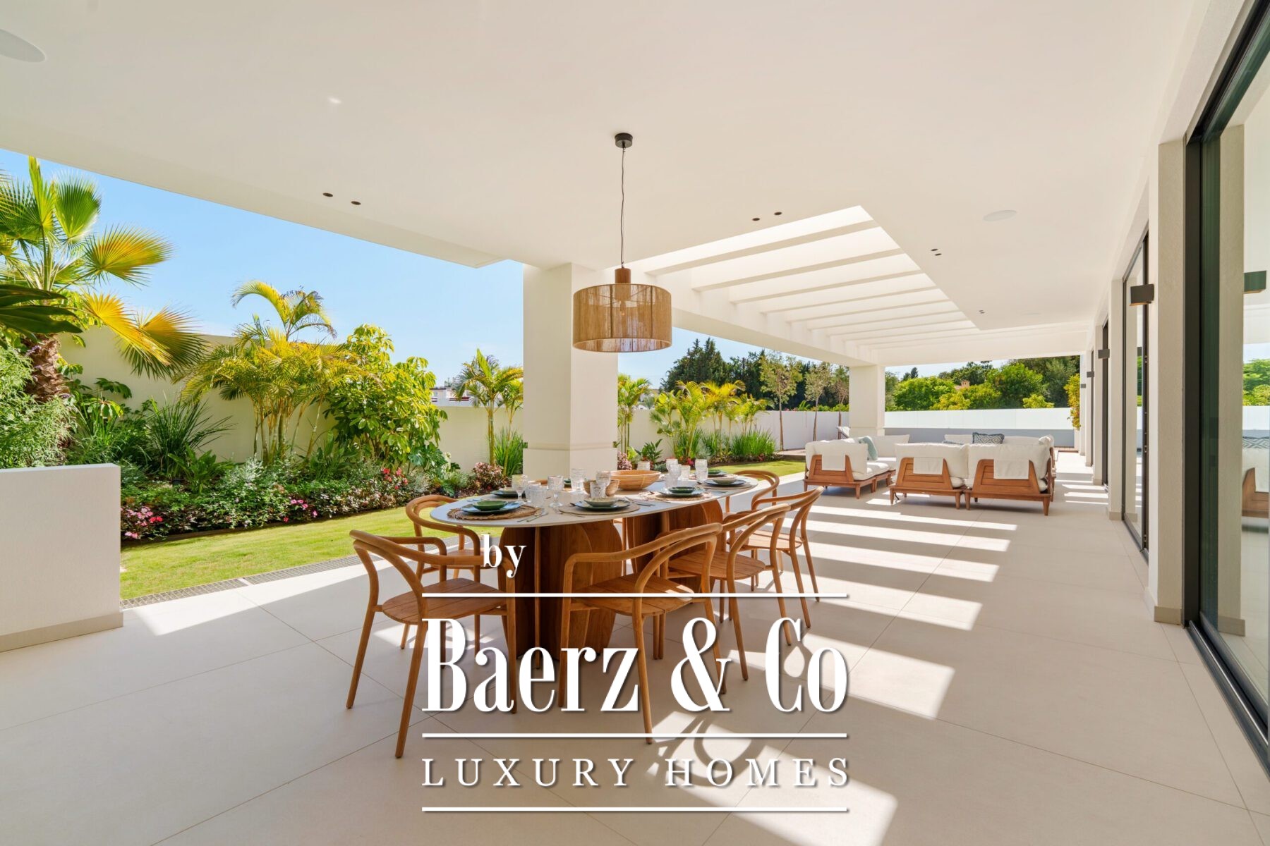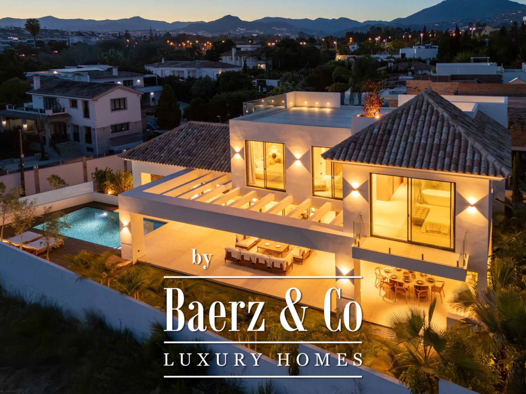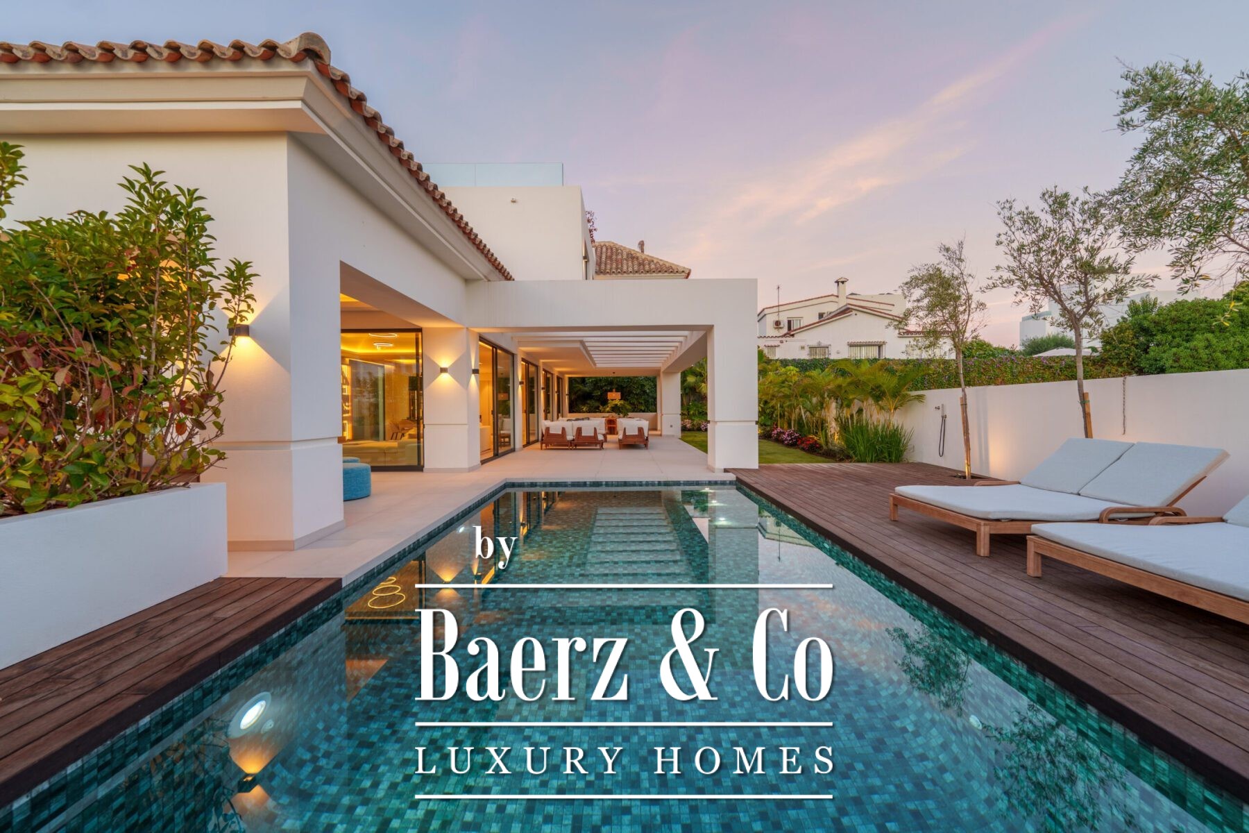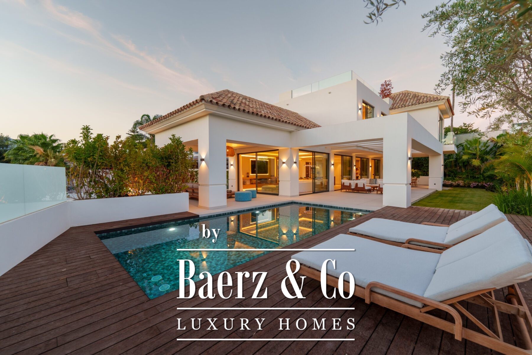 This contemporary villa in the sought-after neighborhood of San Pedro de Alcántara combines sleek architecture with luxurious amenities. Set behind clean white walls and landscaped greenery, the property offers a private oasis with a sparkling pool bordered by a stylish wooden deck and an expansive covered terrace for dining and lounging. Generous outdoor spaces, including a rooftop solarium, create the perfect setting for relaxation and entertaining.
