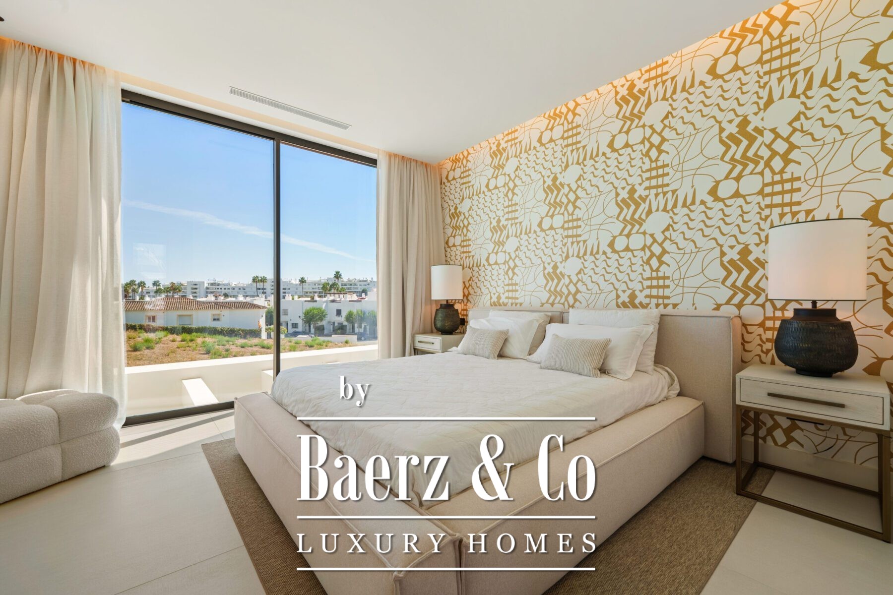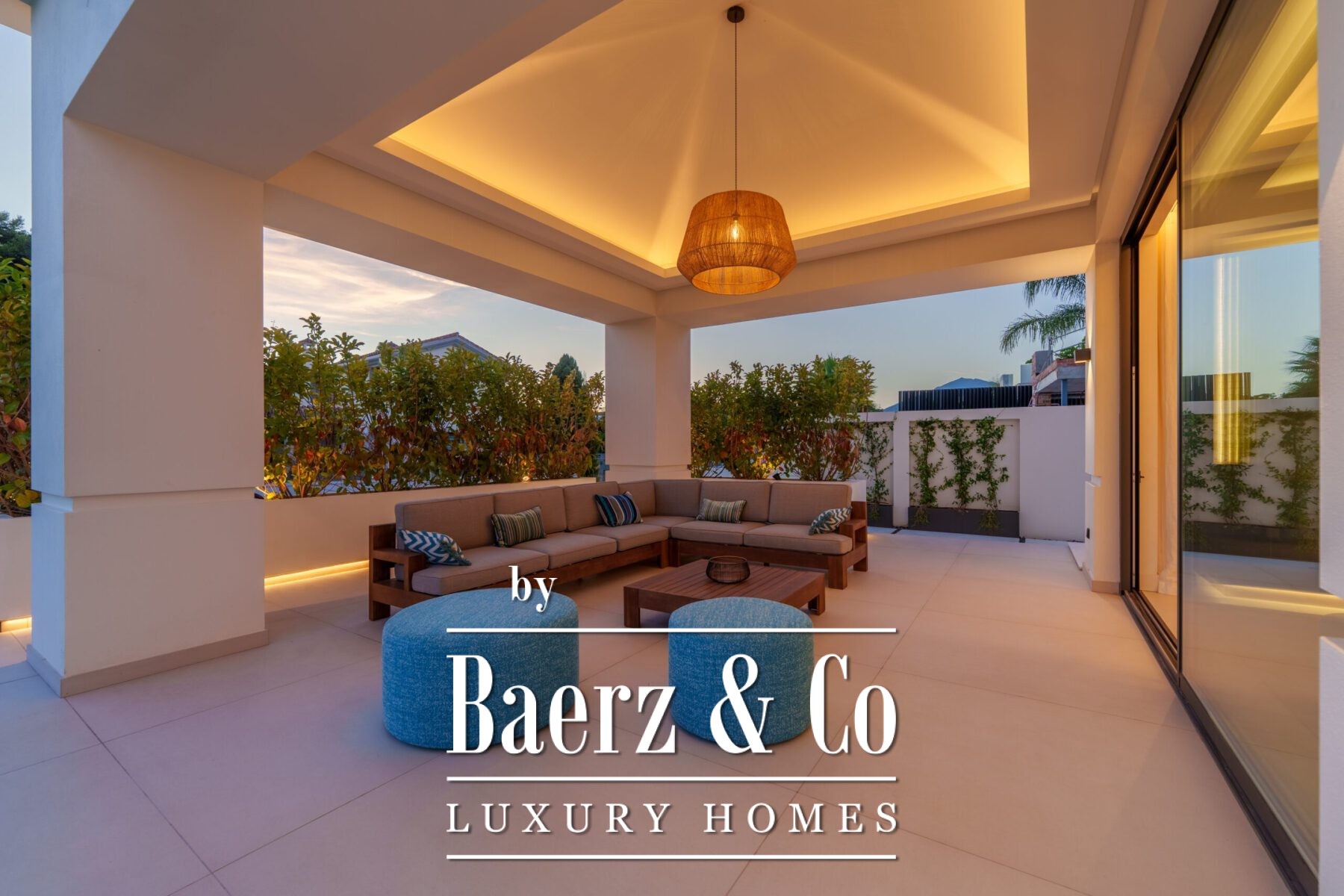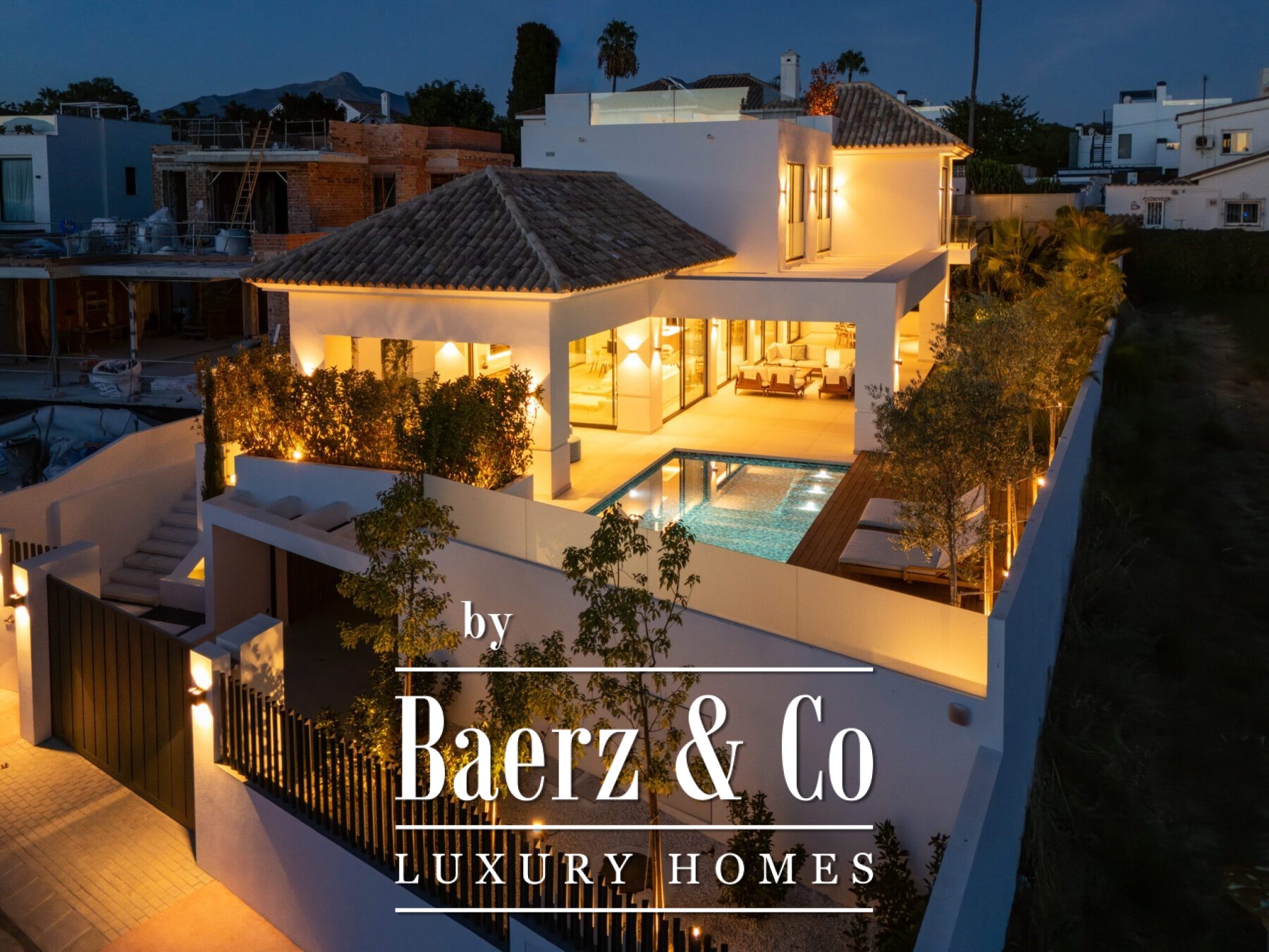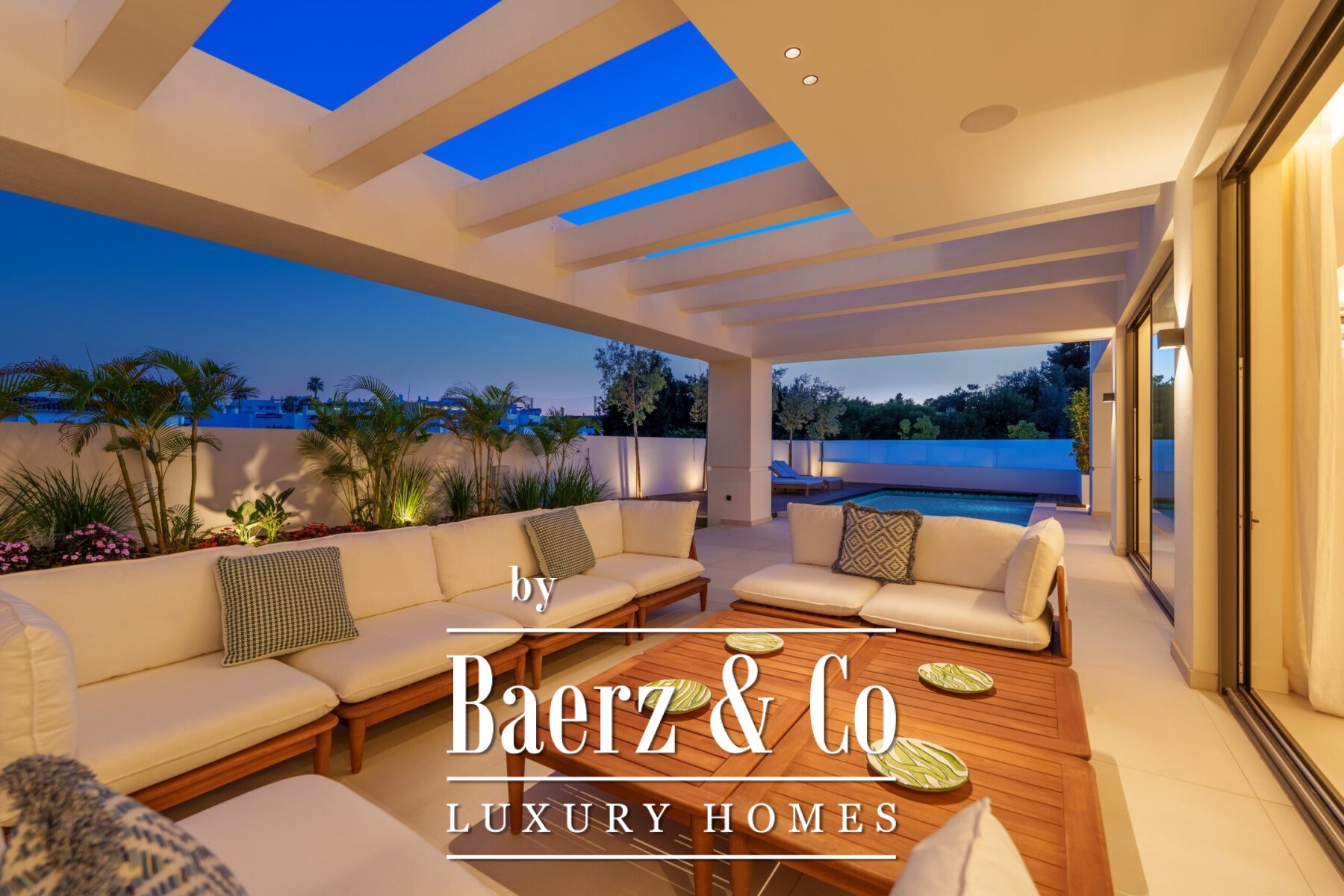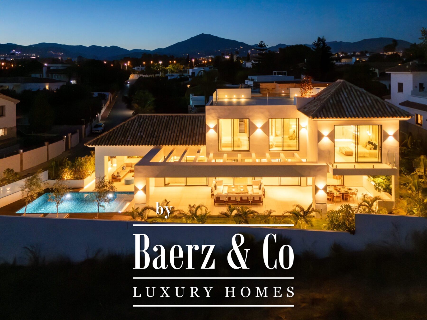 This contemporary villa in the sought-after neighborhood of San Pedro de Alcántara combines sleek architecture with luxurious amenities. Set behind clean white walls and landscaped greenery, the property offers a private oasis with a sparkling pool bordered by a stylish wooden deck and an expansive covered terrace for dining and lounging. Generous outdoor spaces, including a rooftop solarium, create the perfect setting for relaxation and entertaining.