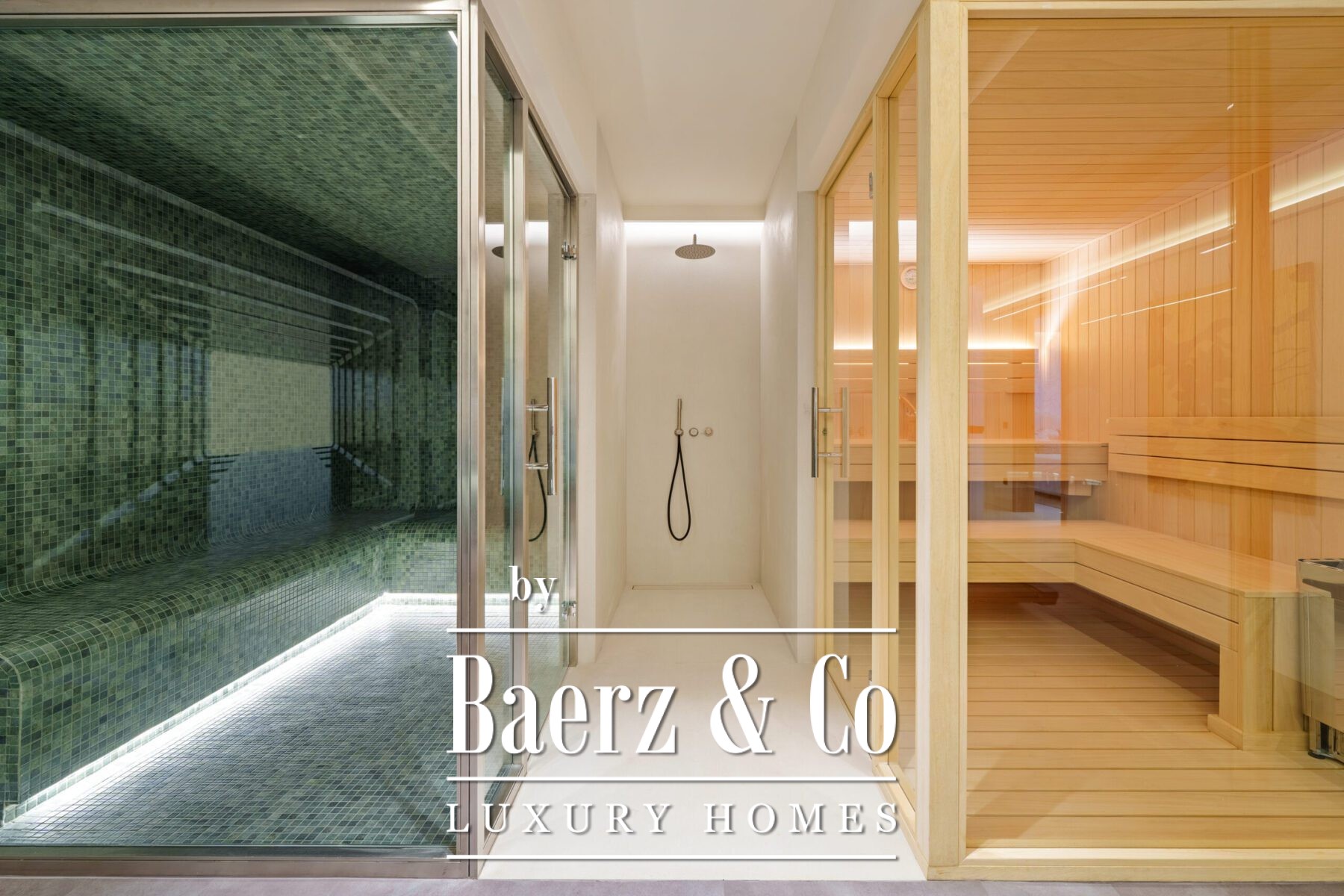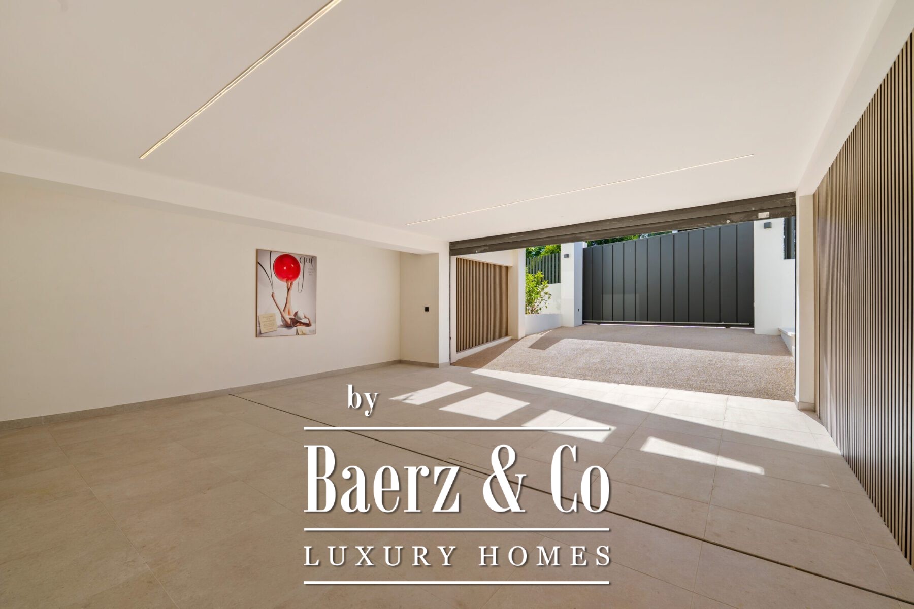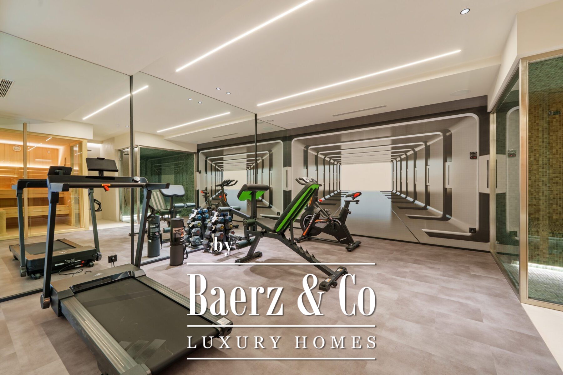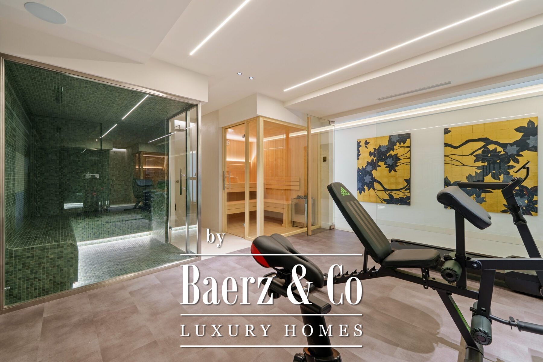 For wellness and leisure, the lower level includes a fully equipped gym, complete with a sauna and steam room enclosed in glass, and ample space for exercise and relaxation. A secure garage and refined entryway add convenience and privacy to this exceptional residence. Designed for contemporary coastal living, this villa offers refined style and every modern comfort in a prime location.