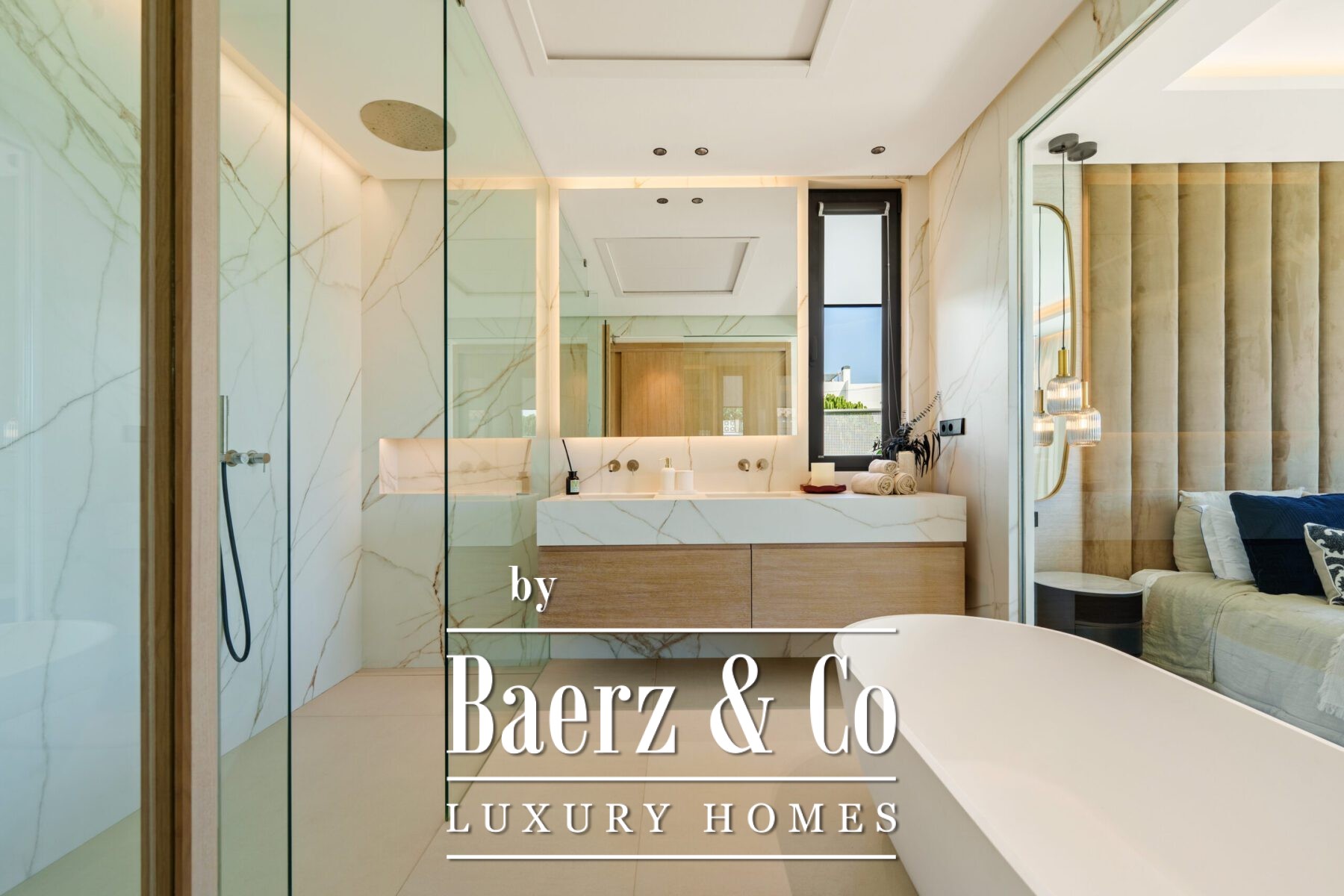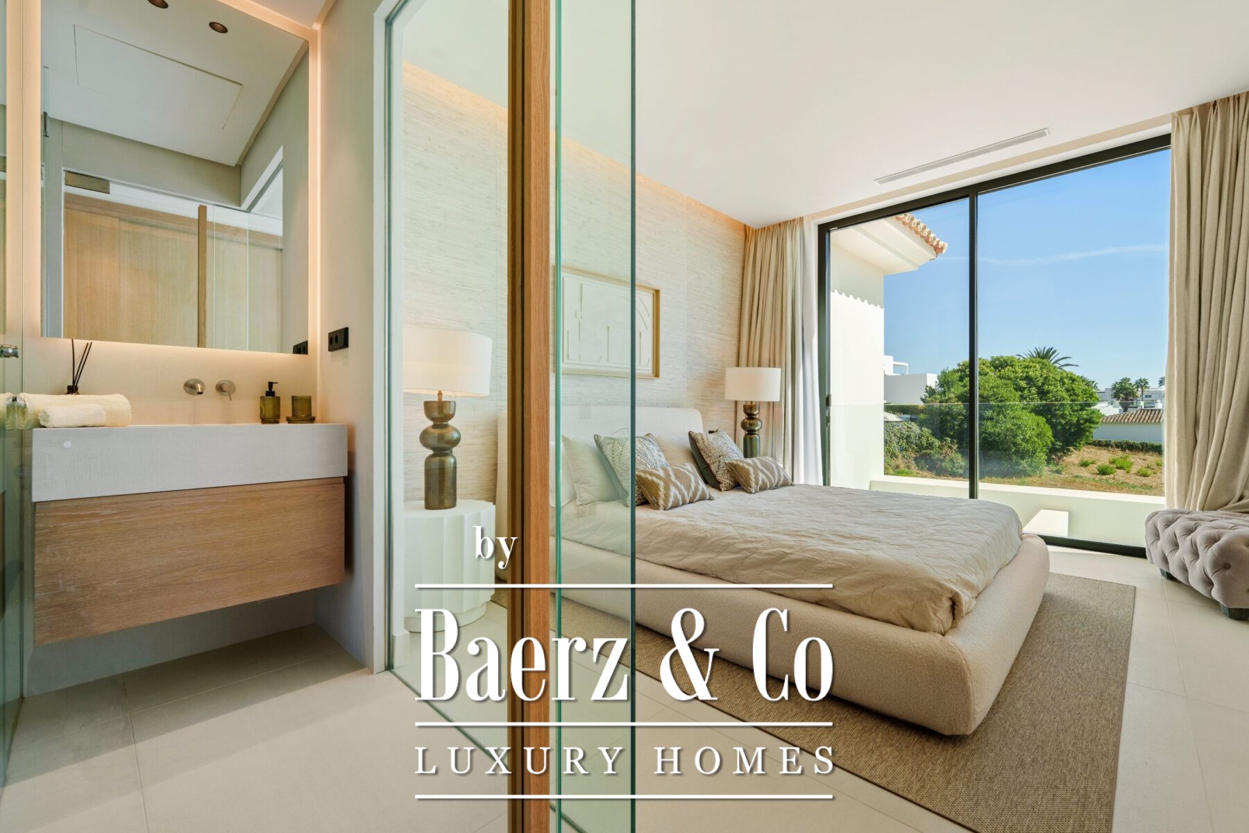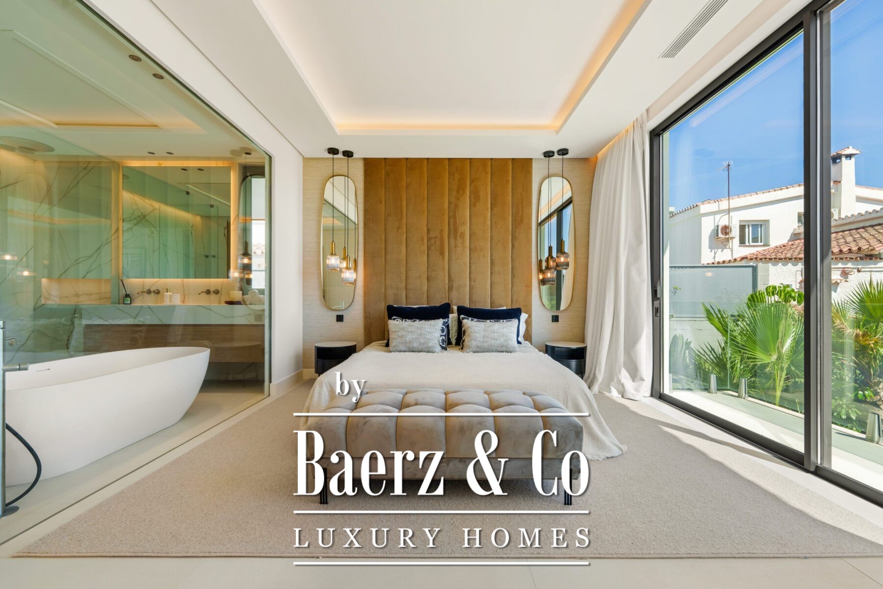 The villa’s private quarters continue the sophisticated aesthetic. Bedrooms are serene and airy, with floor-to-ceiling glass doors that open to terraces, and en-suite bathrooms that exude spa-like elegance with floating vanities, marble finishes, and freestanding tubs. The primary suite impresses with its luxurious proportions and direct access to a sunlit terrace, creating an intimate retreat within the home.