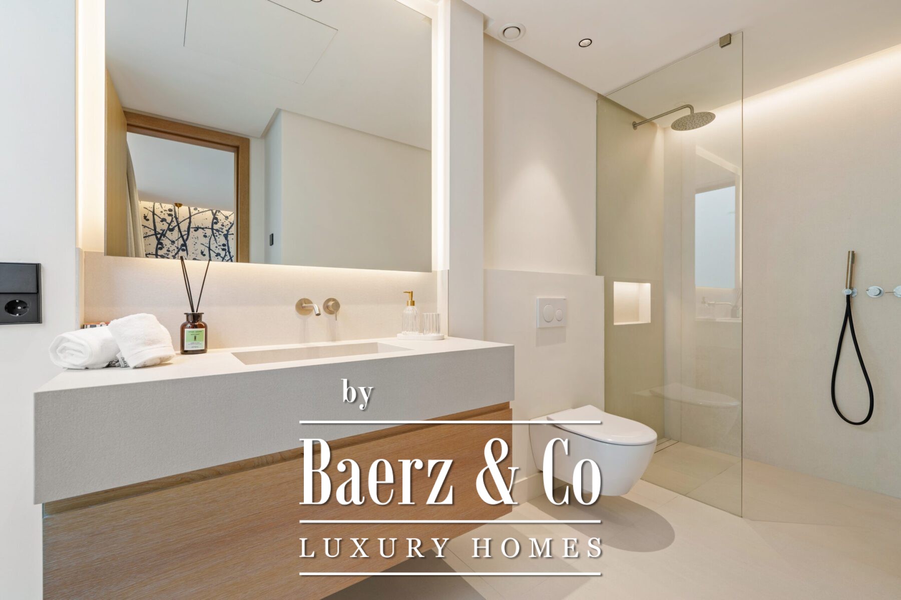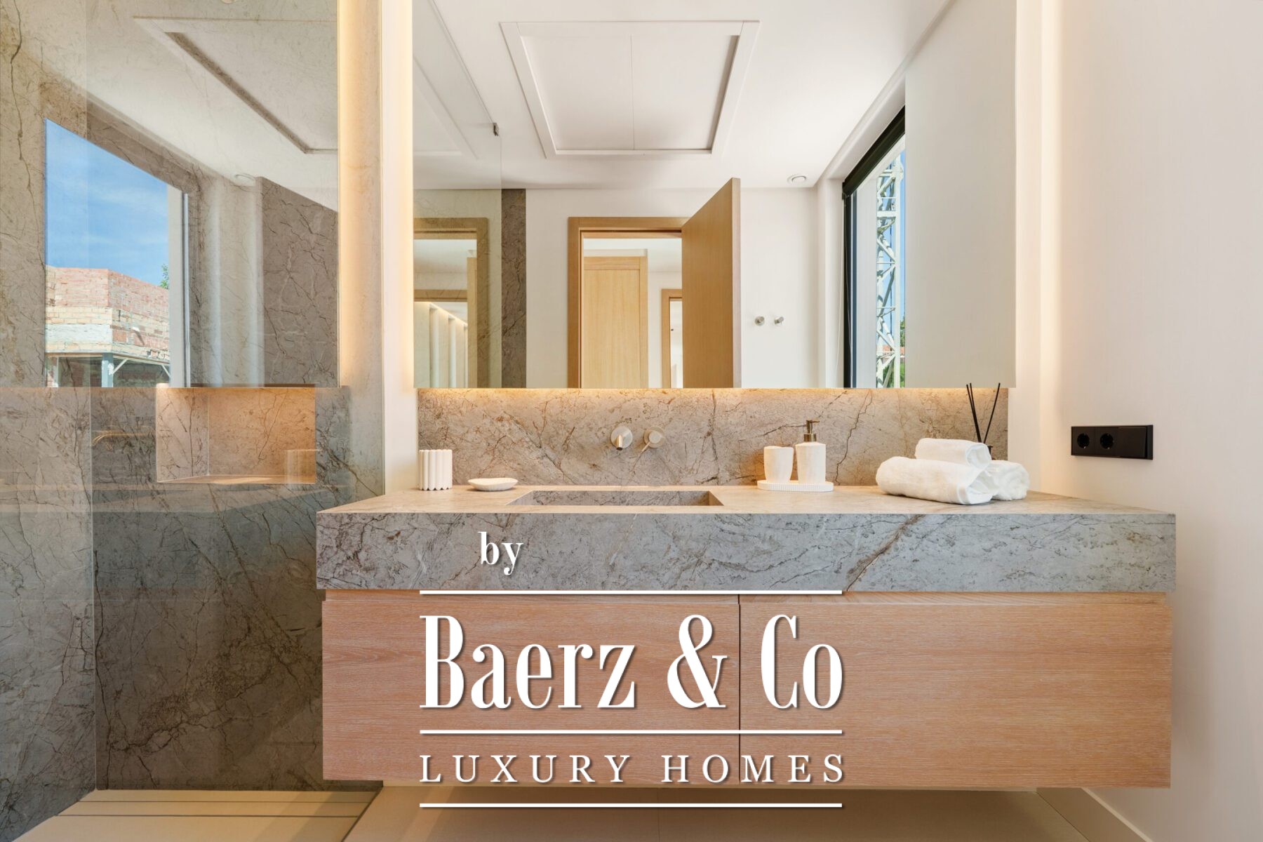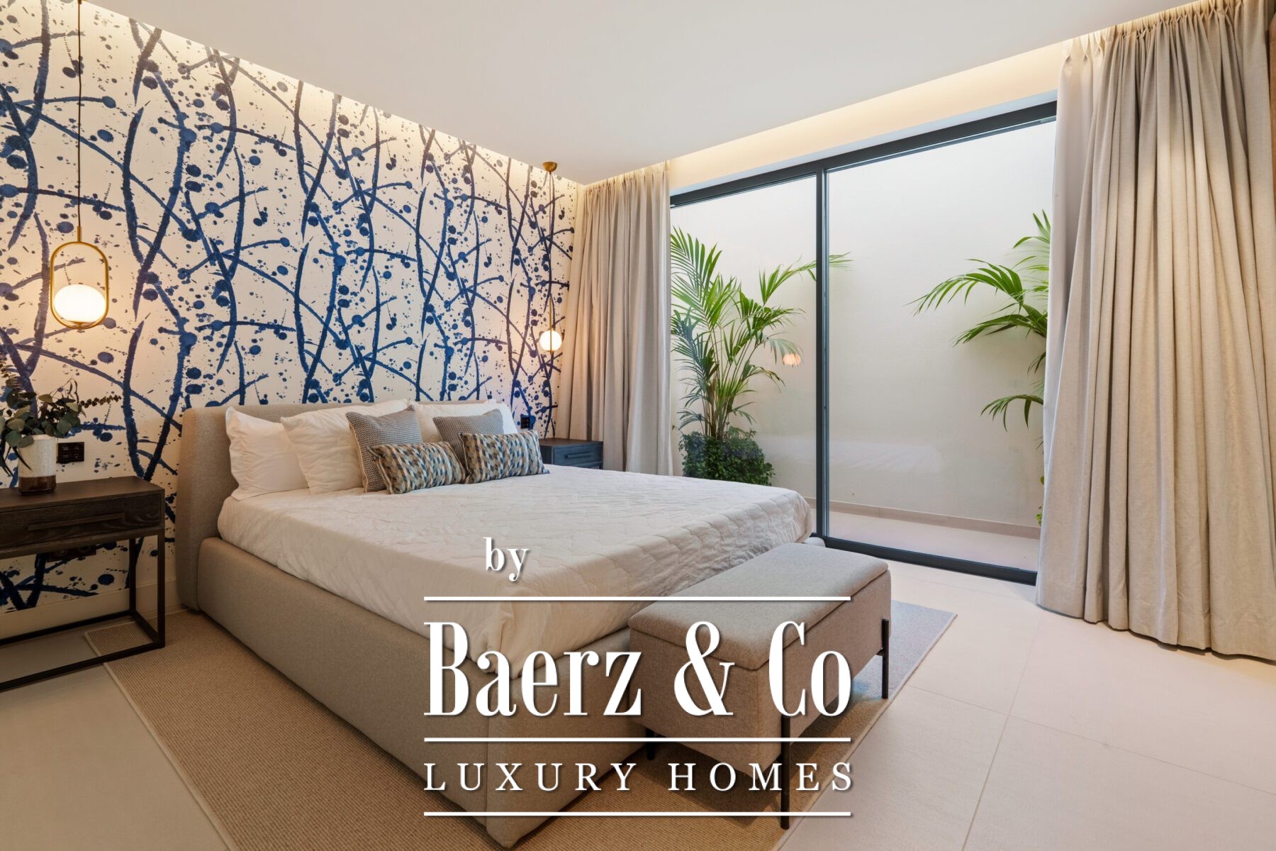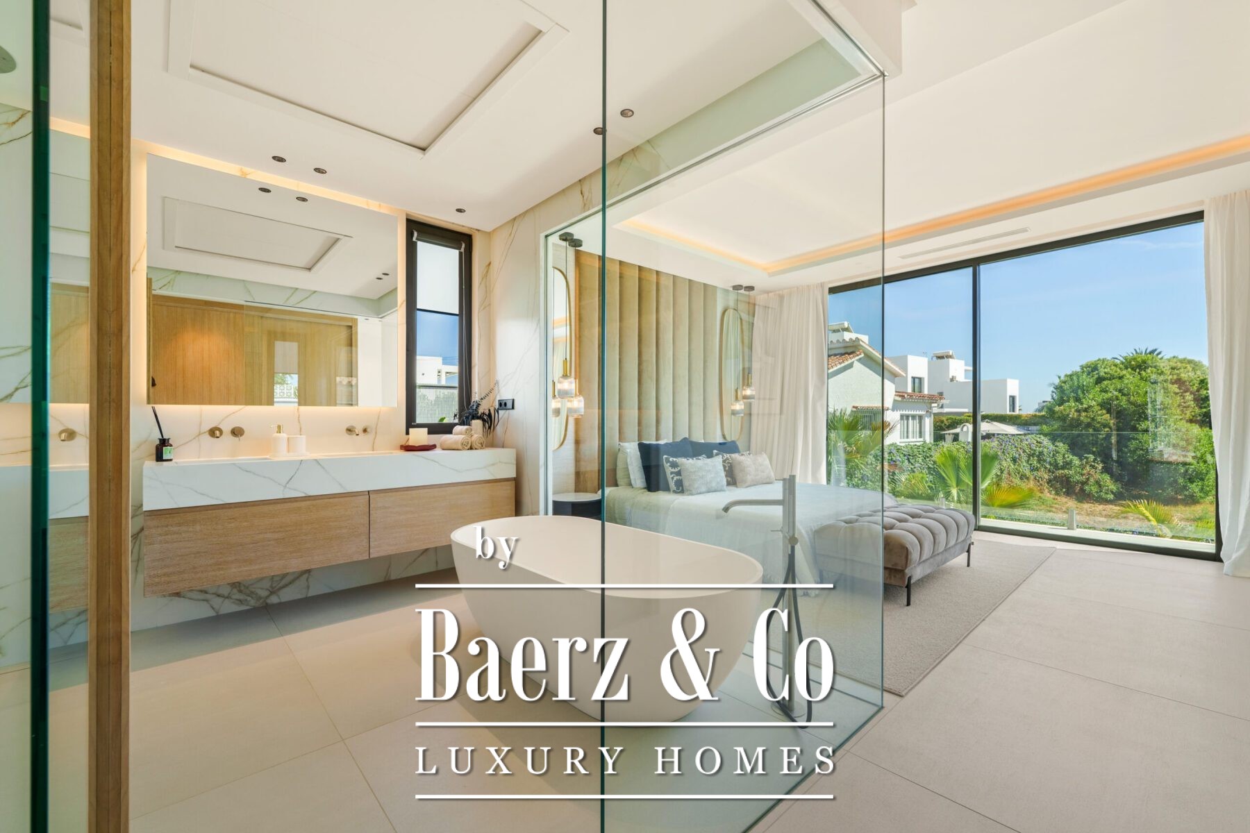 The villa’s private quarters continue the sophisticated aesthetic. Bedrooms are serene and airy, with floor-to-ceiling glass doors that open to terraces, and en-suite bathrooms that exude spa-like elegance with floating vanities, marble finishes, and freestanding tubs. The primary suite impresses with its luxurious proportions and direct access to a sunlit terrace, creating an intimate retreat within the home.