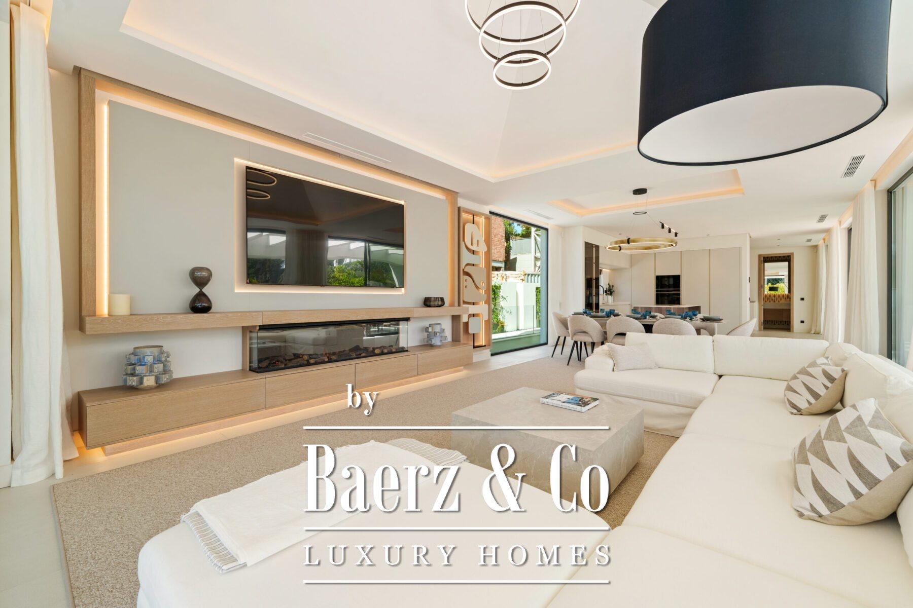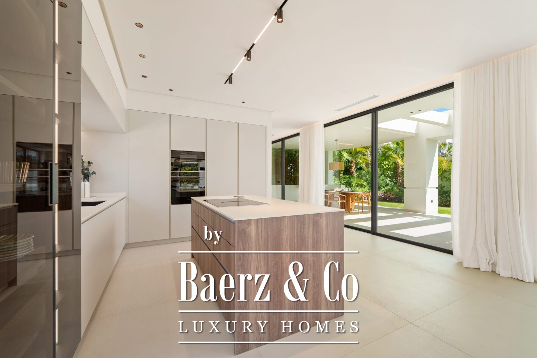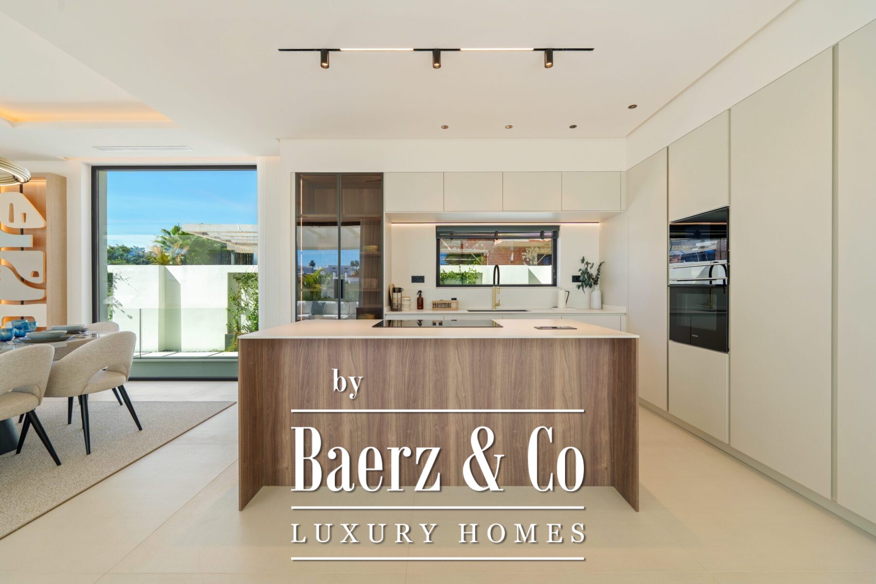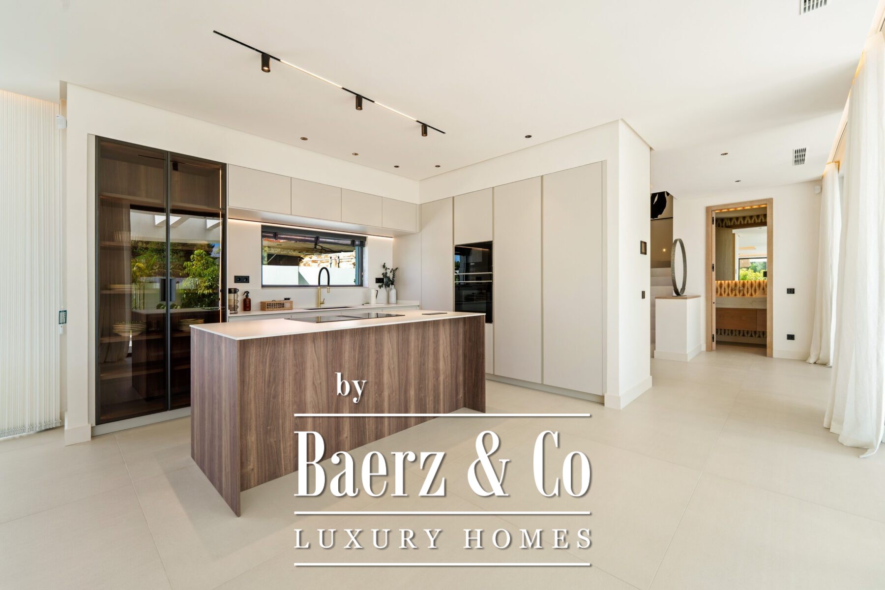 Inside, the design is bright and modern, highlighted by soft neutral tones, elegant recessed lighting, and floor-to-ceiling windows that fill the home with natural light. The open-plan living and dining area features a striking custom entertainment wall and contemporary fixtures, seamlessly flowing into the state-of-the-art kitchen. Here, a warm wood island contrasts beautifully with sleek cabinetry and integrated appliances, while a spacious dining area invites convivial meals with friends and family.