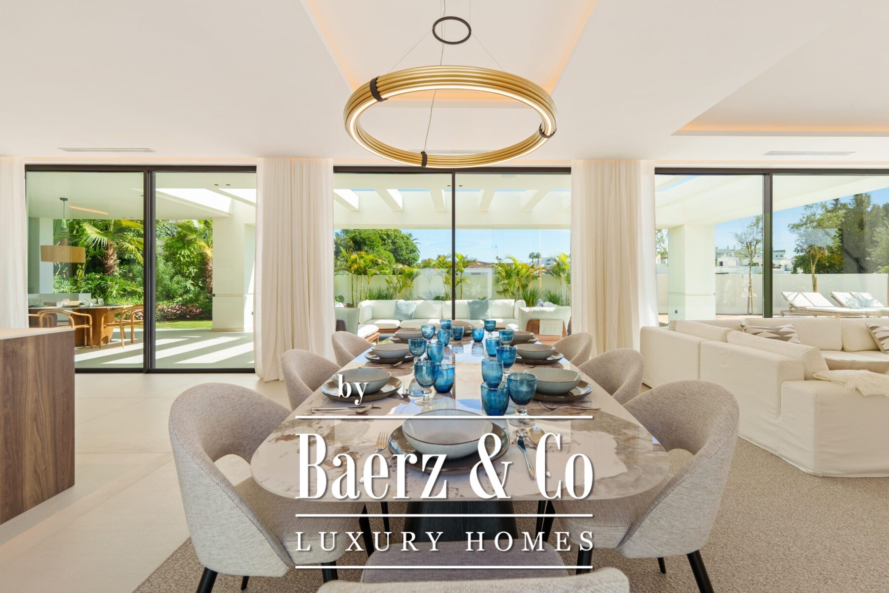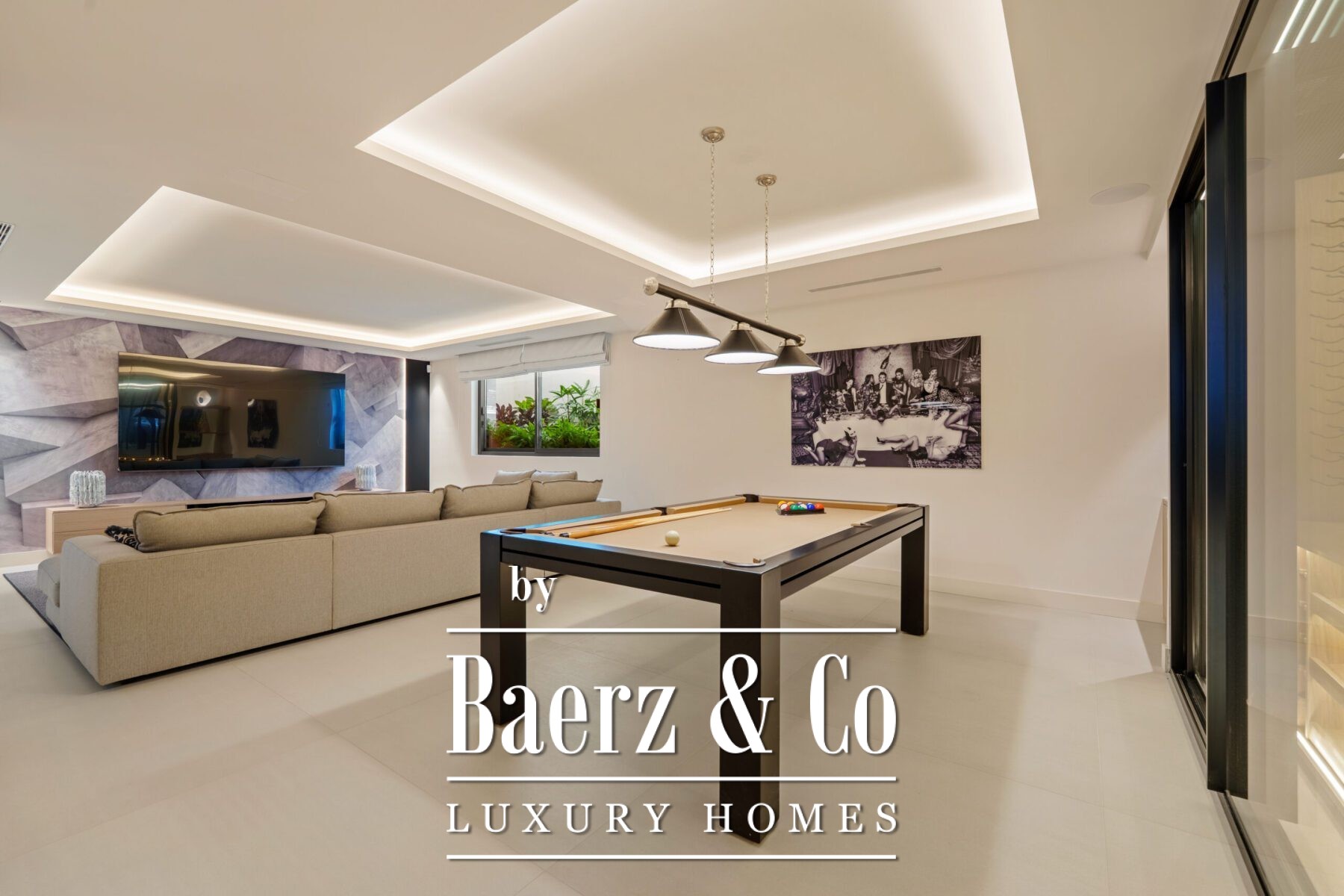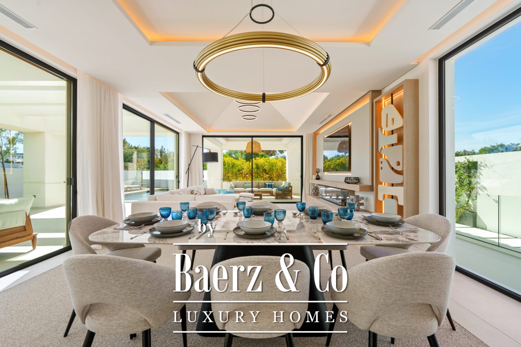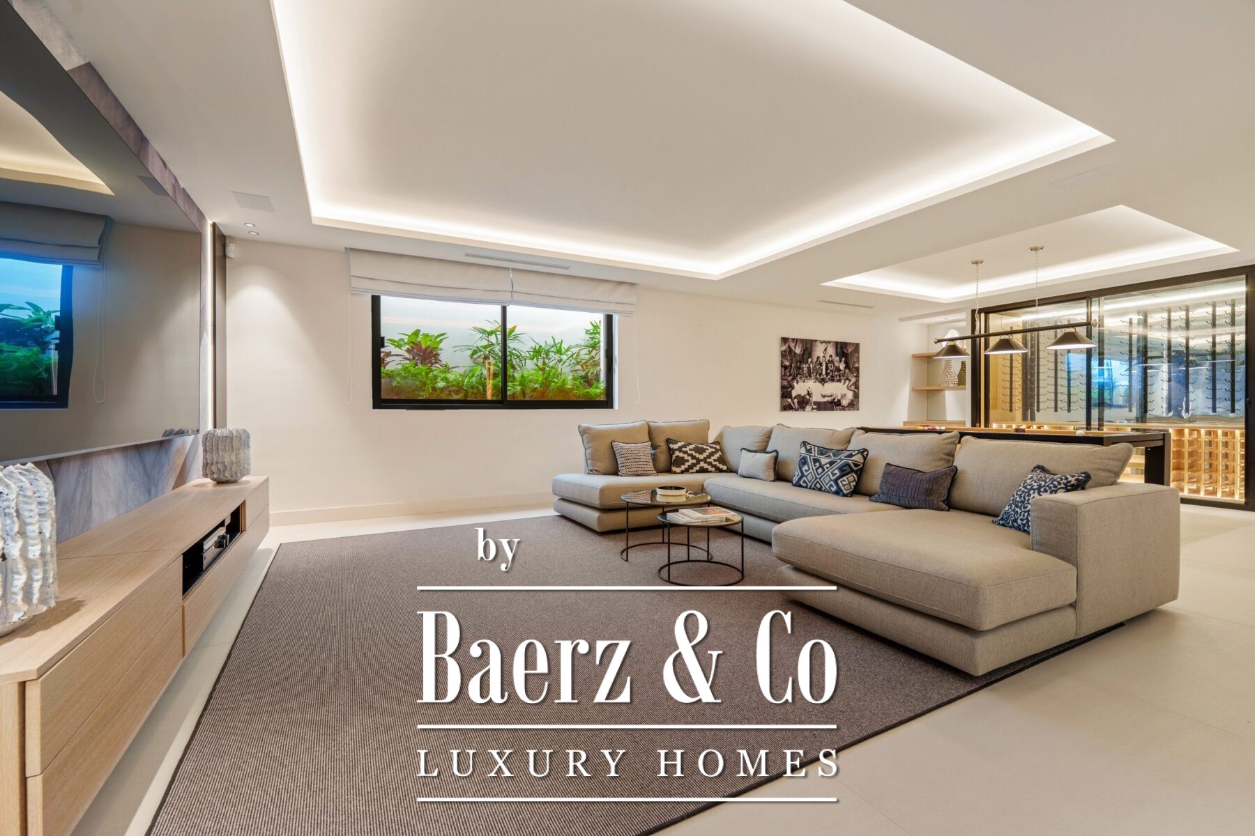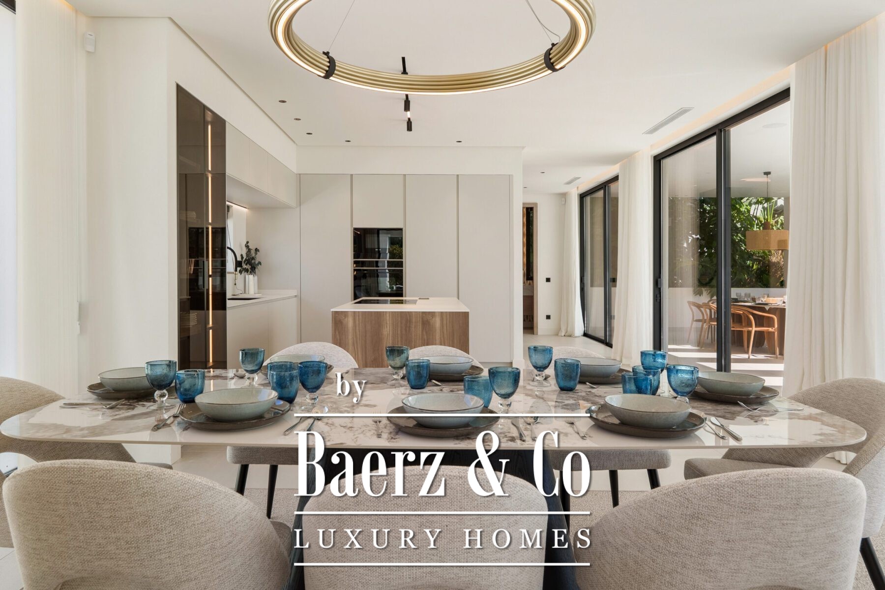 Inside, the design is bright and modern, highlighted by soft neutral tones, elegant recessed lighting, and floor-to-ceiling windows that fill the home with natural light. The open-plan living and dining area features a striking custom entertainment wall and contemporary fixtures, seamlessly flowing into the state-of-the-art kitchen. Here, a warm wood island contrasts beautifully with sleek cabinetry and integrated appliances, while a spacious dining area invites convivial meals with friends and family.
